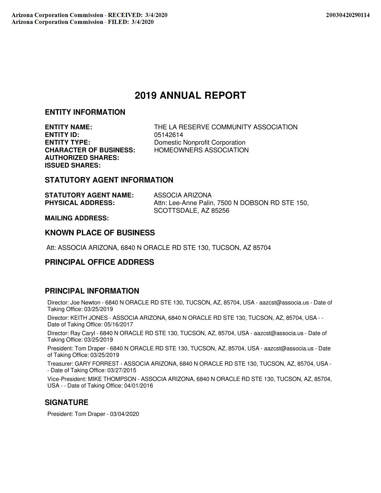 Corp. Name: THE LA RESERVE COMMUNITY ASSOCIATION