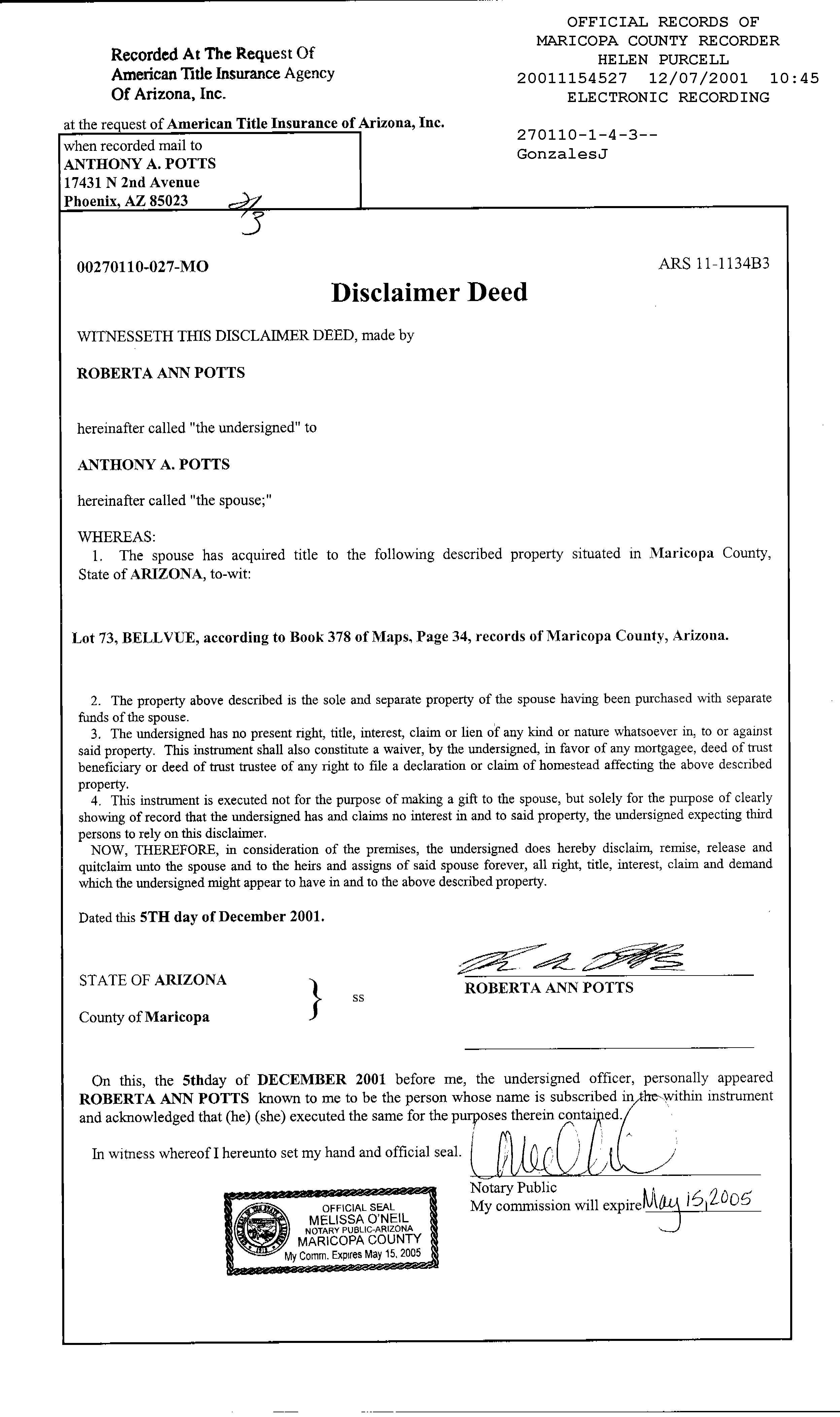 MARICOPA, AZ Document:DED DIS 2001.1154527 Page:1 of 1 Printed on:1/30/2023 3:45 PM Branch :FC0 User :JSTI