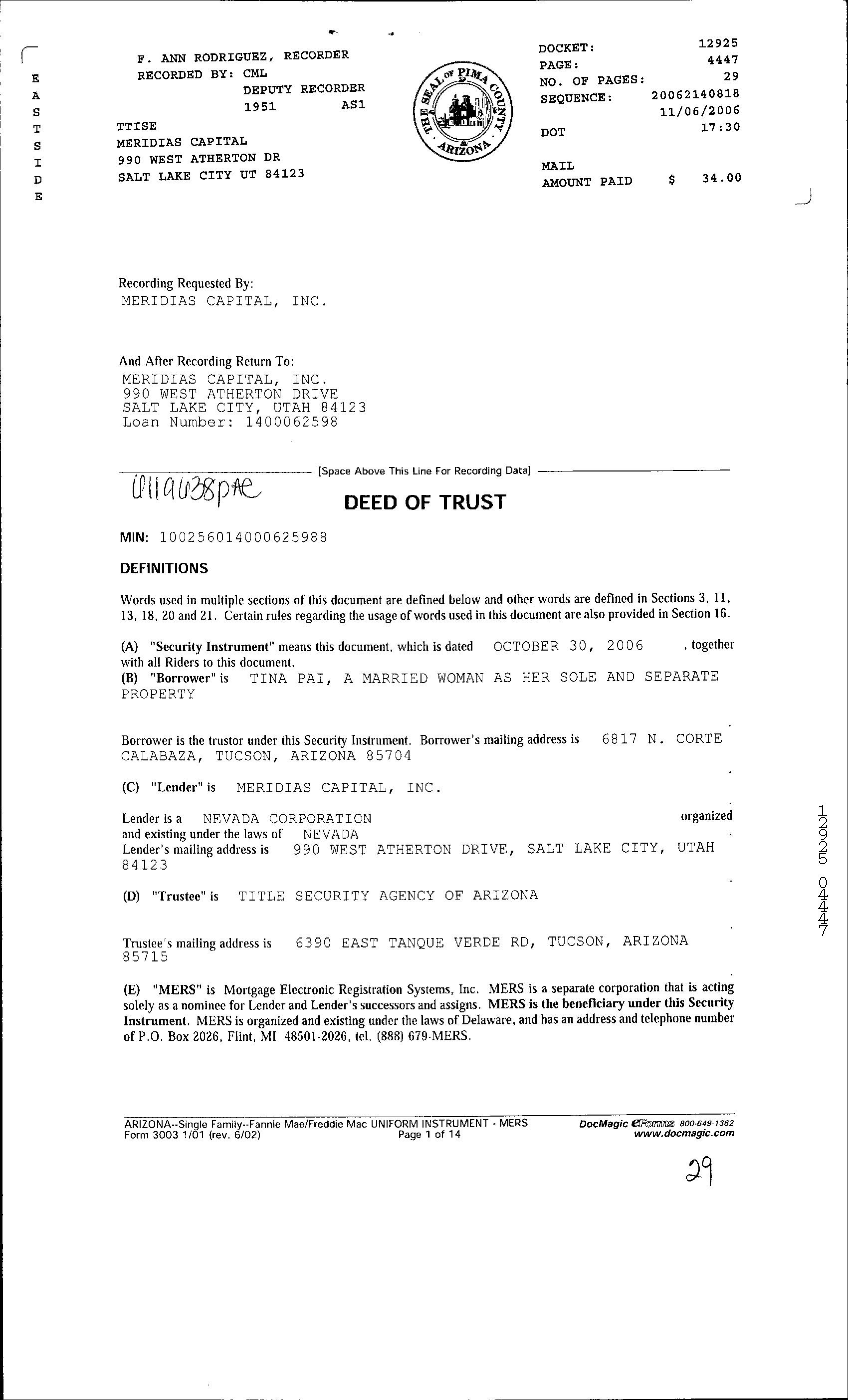 1st Mtg Amount/Type : $69,508 / Cnv Title Company : Title Security Inc Lender : Meridias Cap Seller Name : Trust 980 Prior Sale Information Prior Rec/Sale Date : 08/31/2006 / 08/29/2006 Prior Deed Type : Special Warranty Deed Prior Sale Price : $16,545,000 Prior Lender : Private Individual