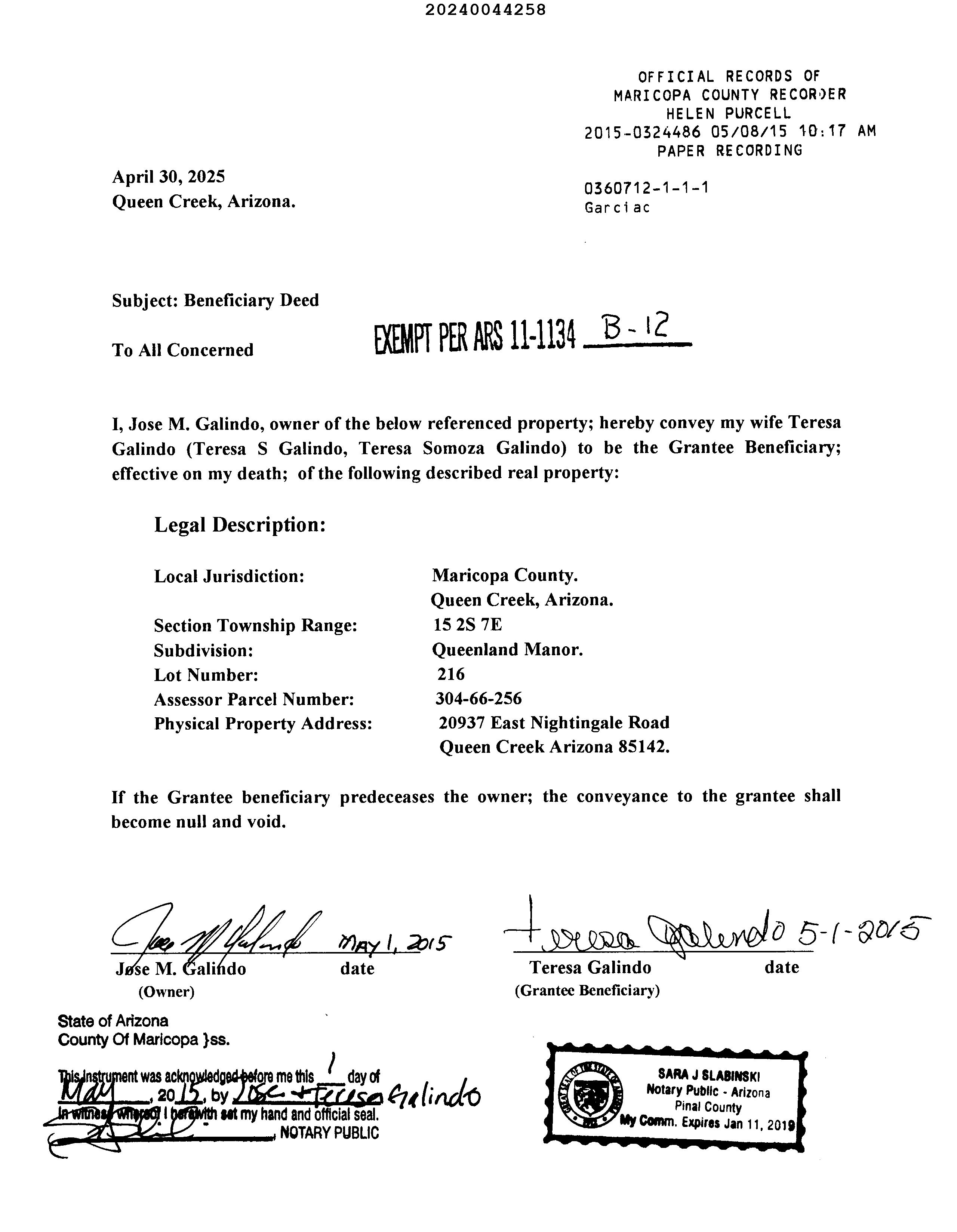 MARICOPA, AZ Document:CER DEA 2024.44258 Page:1 of 3 Printed on:4/19/2024 11:35 AM Branch :FC0 User :JSTI