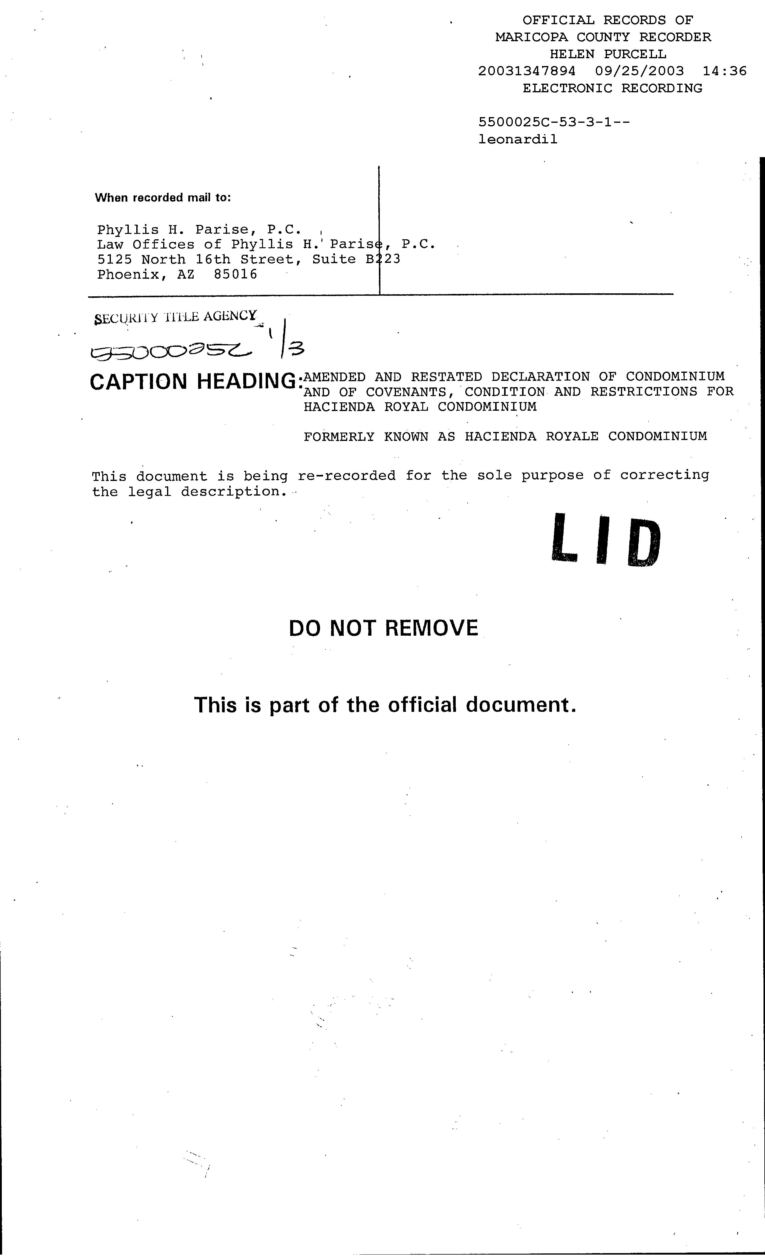 MARICOPA, AZ Document:RES AMD 2003.1347895 Page:1 of 5 Printed on:4/9/2024 1:02 PM Branch :FC0 User :JSTI