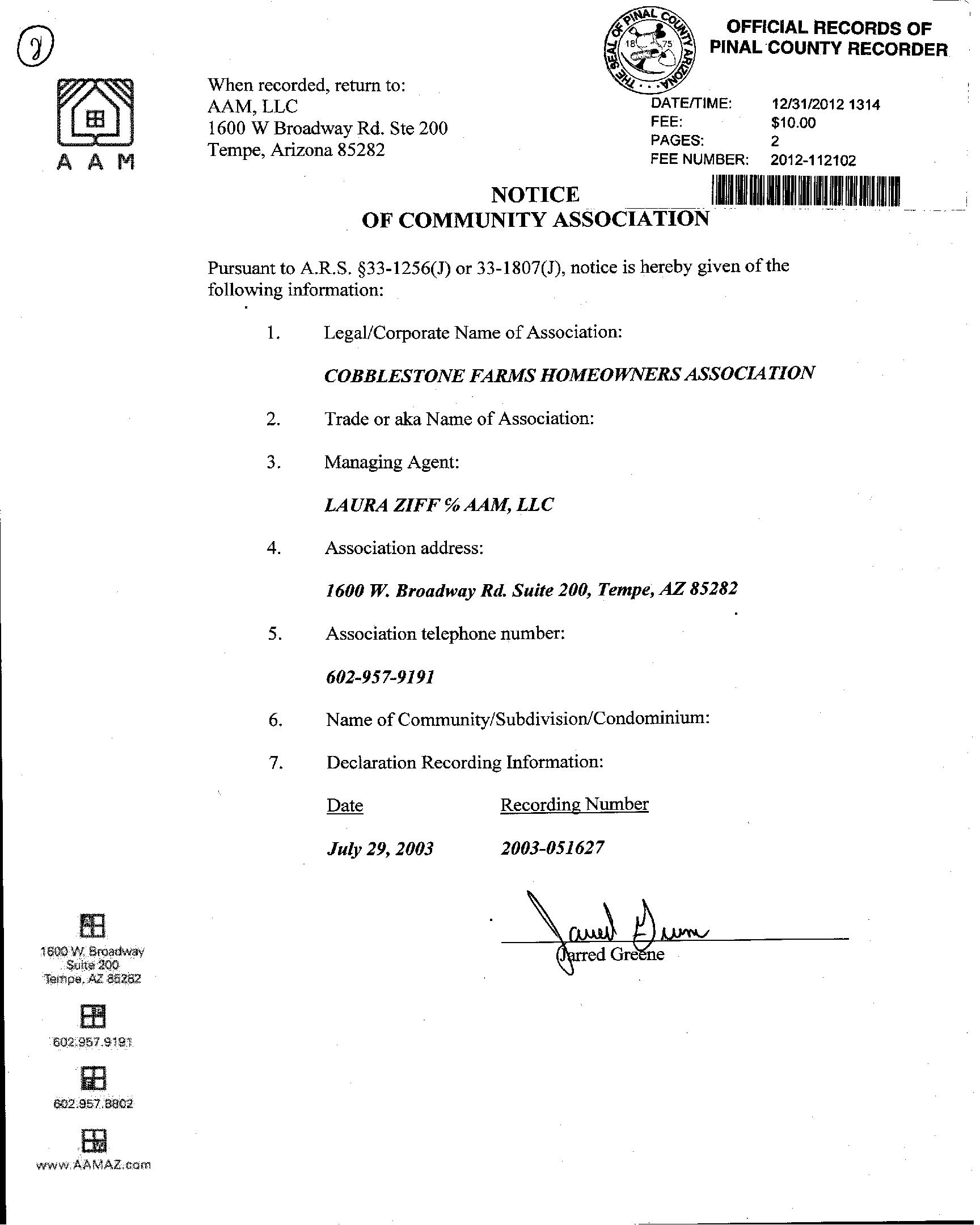 PINAL (PL), AZ Document:NOT HOA 2012.112102 Page:2 of 2 Printed on:4/25/2023 12:19 PM Branch :FC0 User :JSTI