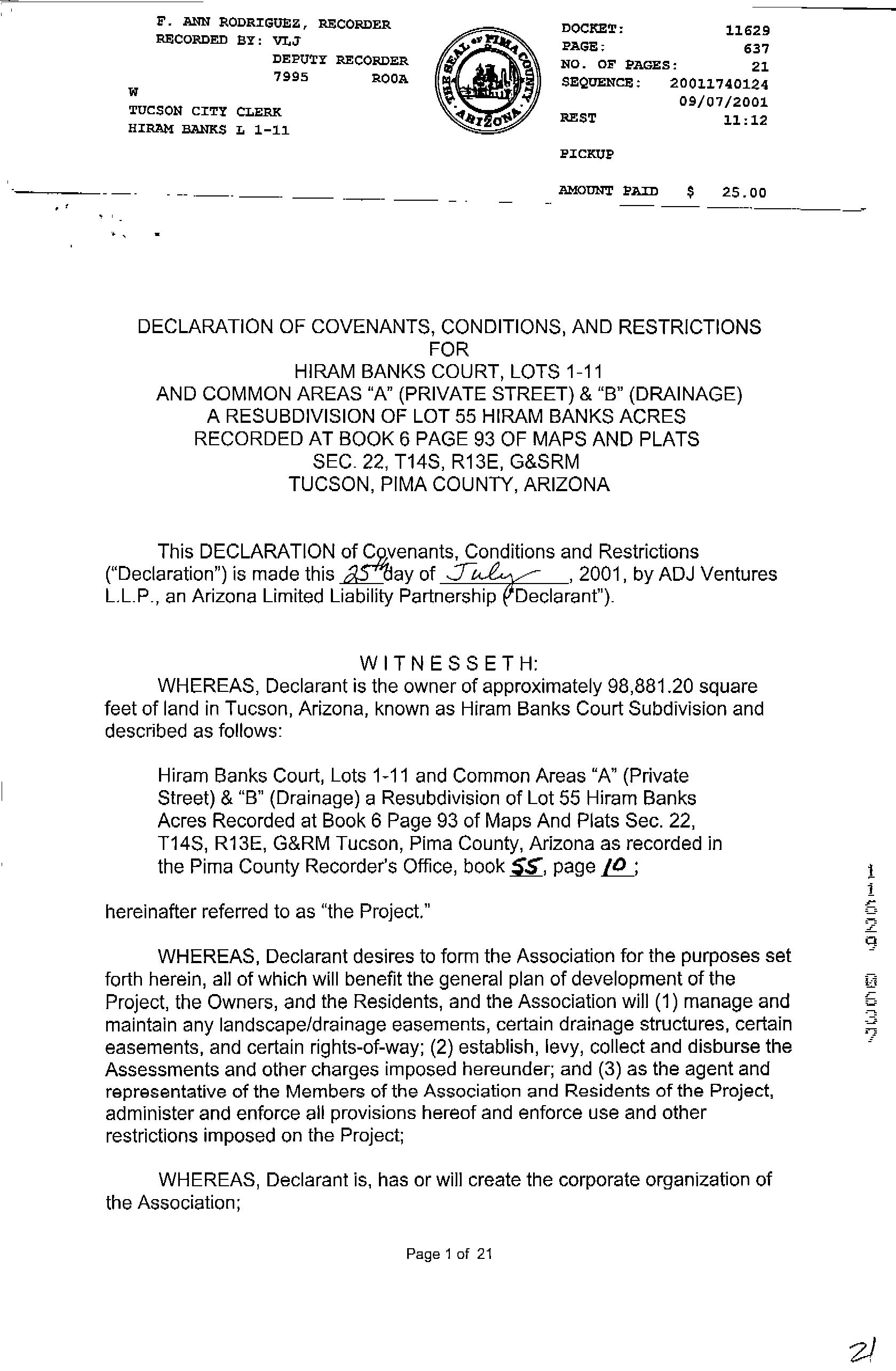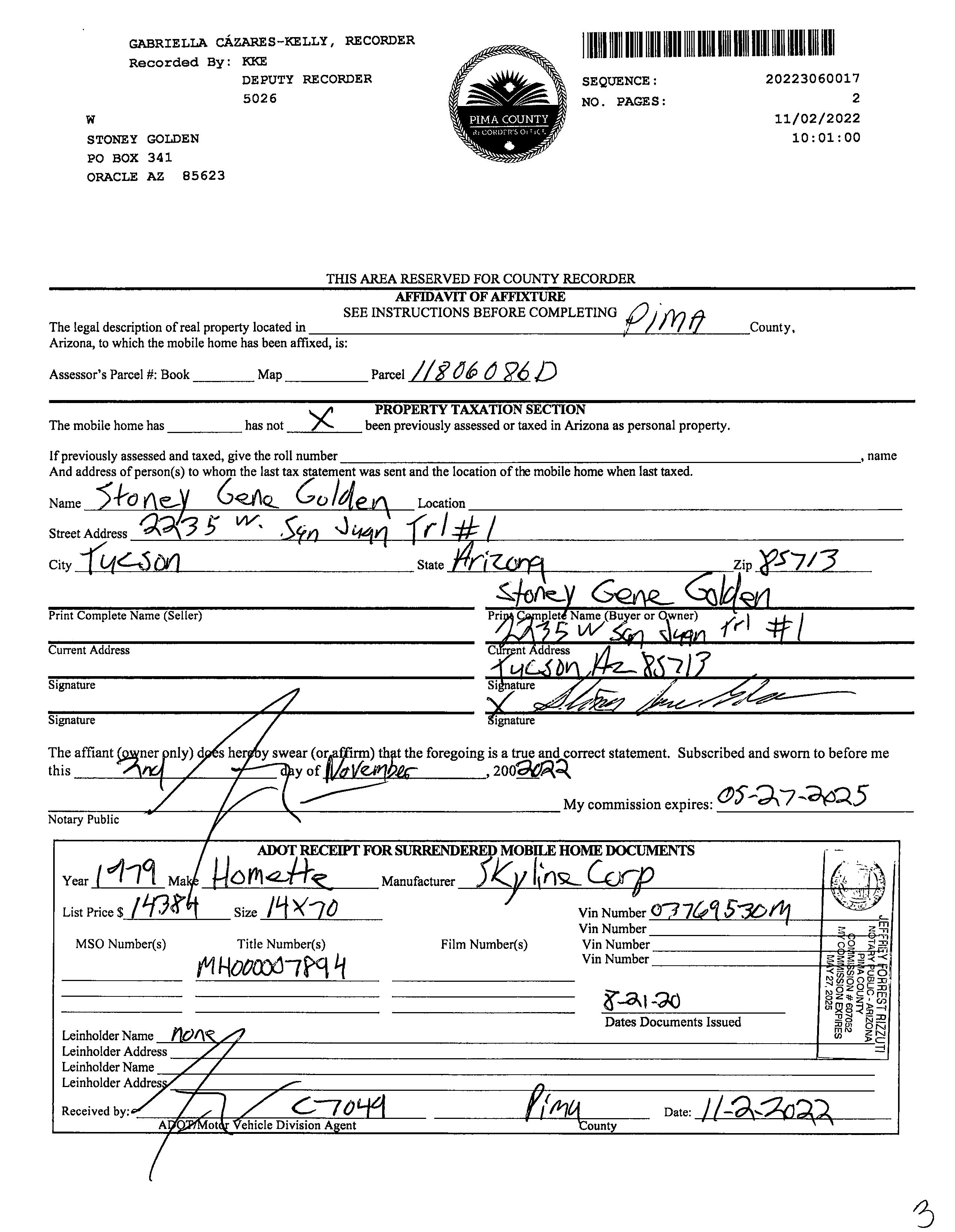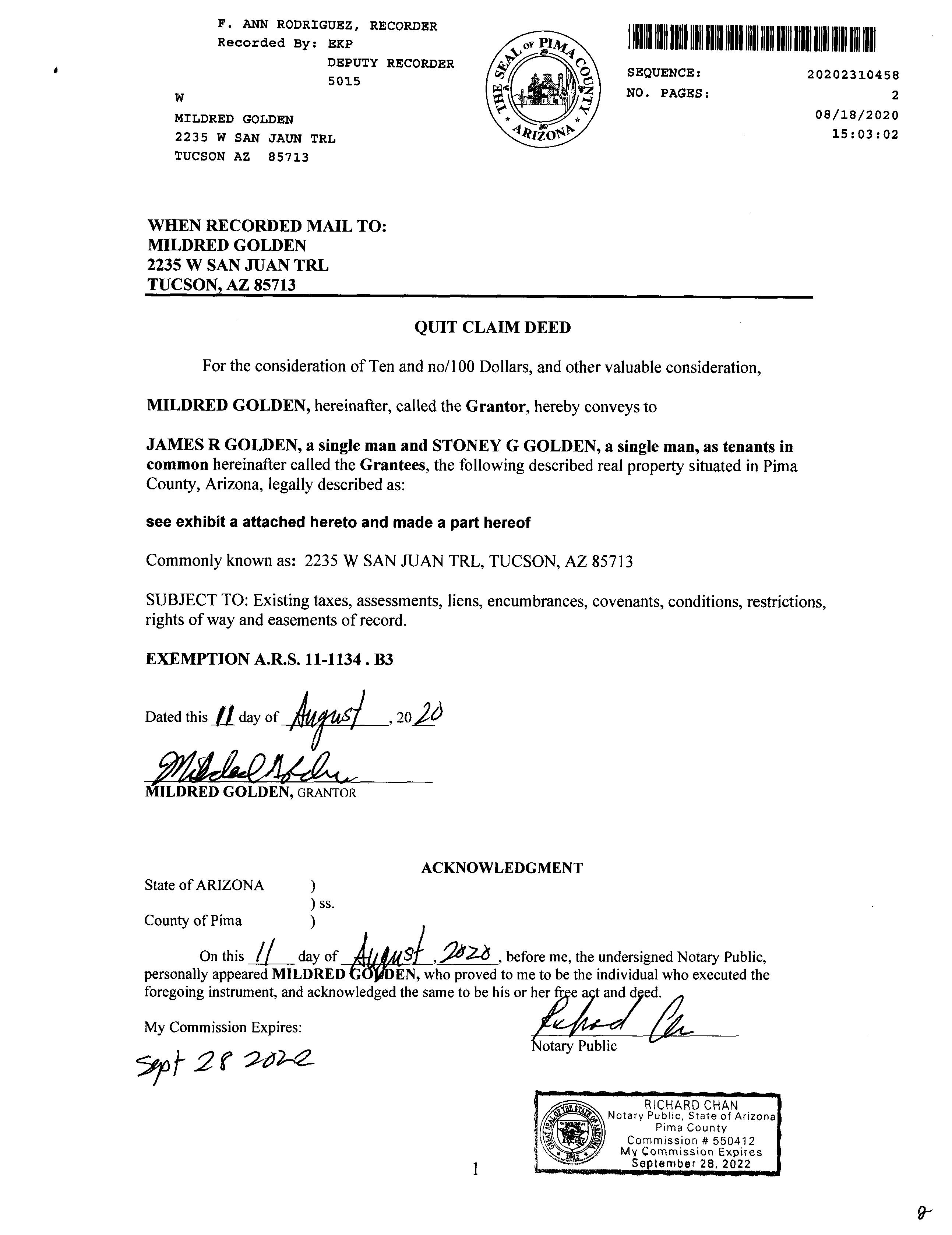 Owner Name : Golden James R / Golden Stoney G Mailing Address : 2235 W San Juan Trl, Tucson AZ 85713-3799 C038