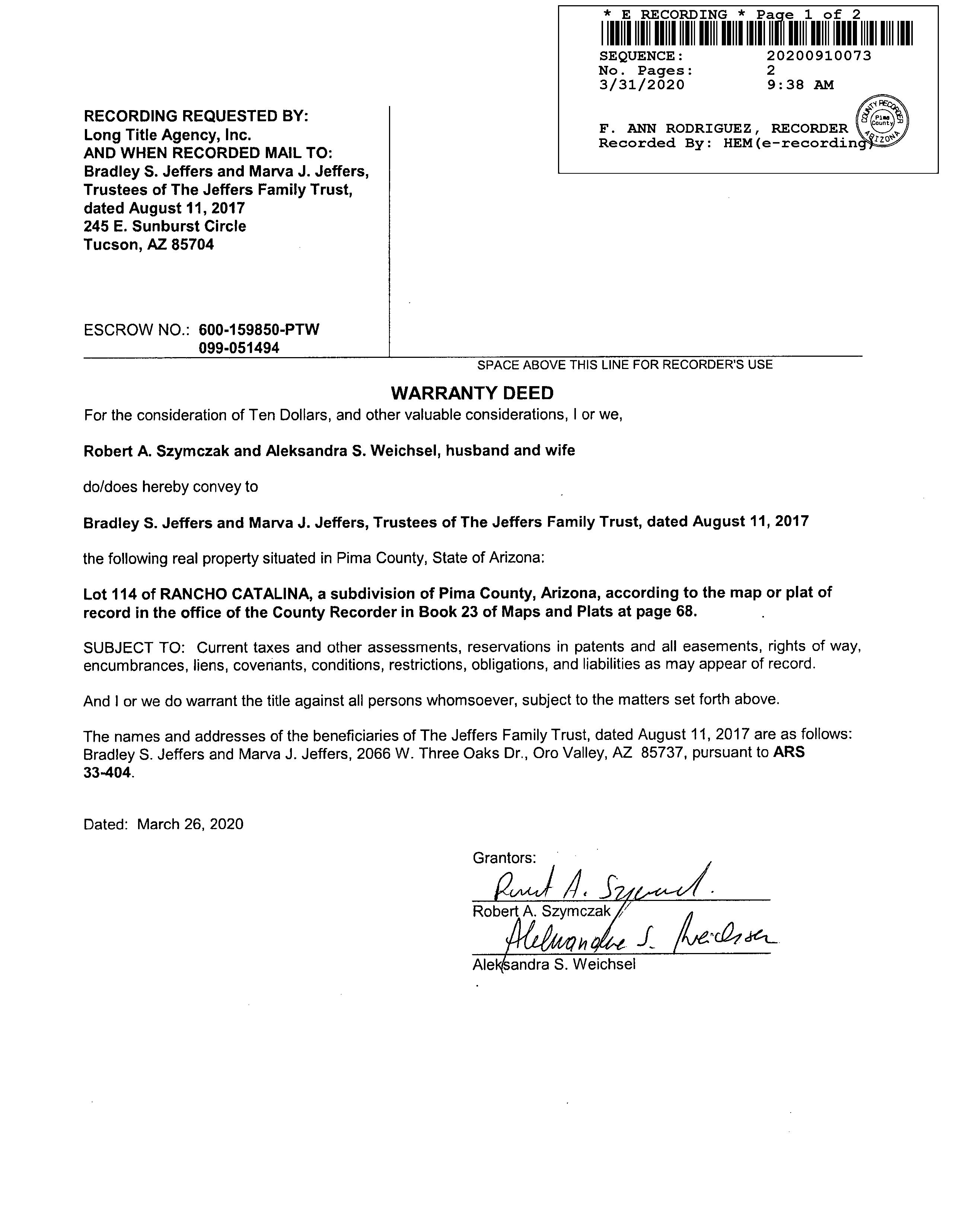 APN / Alternate APN: 225-14-3170 / Deed Type: Warranty Deed Land Use: Sfr Subdivision / Tract: Northern Heights / Lot Size: 4,676 Year Built / Eff: 2001 / Rec. Date / Price: 02/15/2023 / $330,000 Living Area: 1,538 # of units: Document #: 460097 Bedrooms: Pool: Total Tax Value: $183,817 Bath(F/H): / #8 318 W Hardy Rd Oro Valley Az 85704 Owner Name: Giampa Jamie / APN / Alternate APN: 225-11-0590 / Deed Type: Warranty Deed Land Use: Sfr Subdivision / Tract: Shadow Mountain Estates / Lot Size: 37,313 Year Built / Eff: 1959 / Rec. Date / Price: 08/31/2022 / $425,000 Living Area: 1,558 # of units: Document #: 2430575 Bedrooms: Pool: Total Tax Value: $210,601 Bath(F/H): /