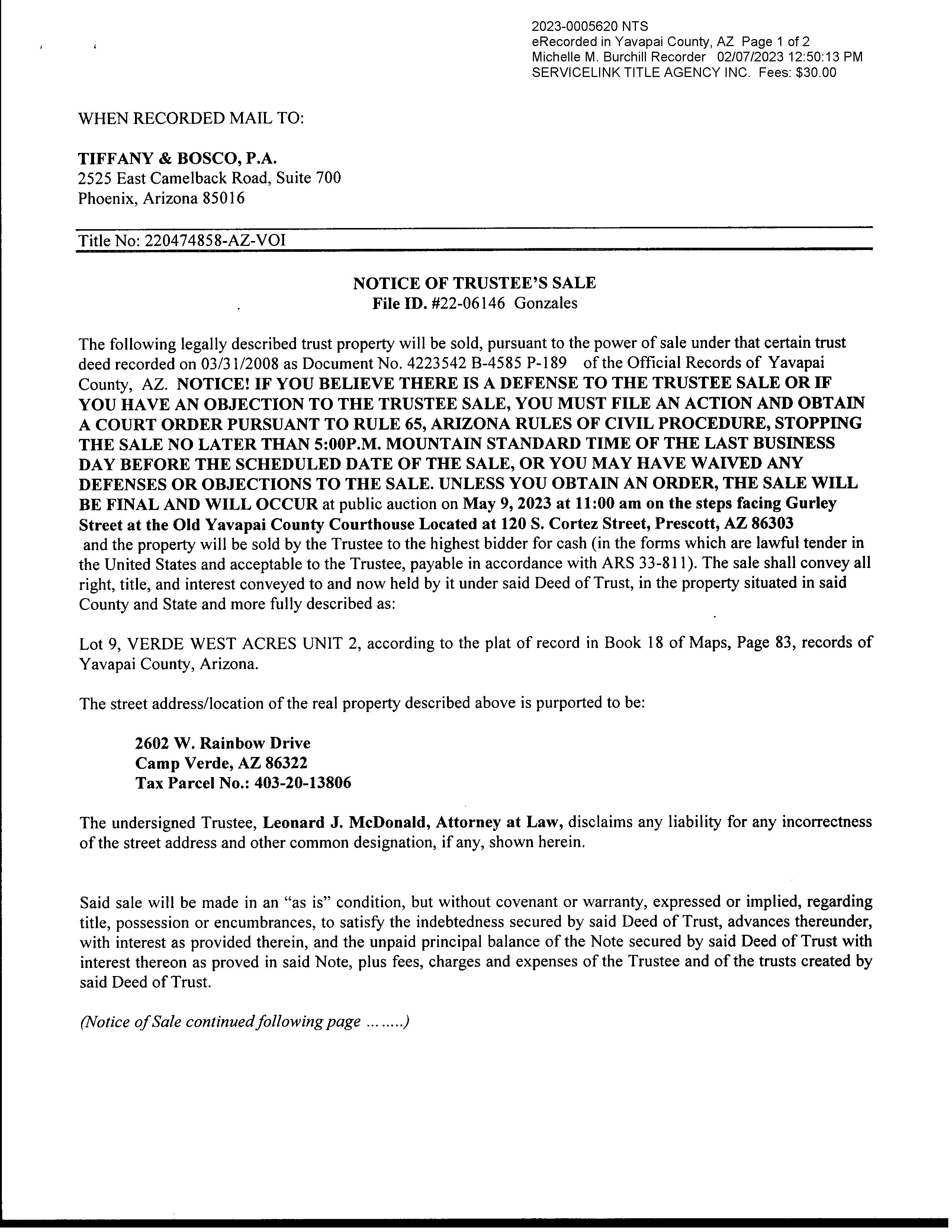 Attorney Name : TIFFANY & BOSCO PA Auction City : PRESCOTT
