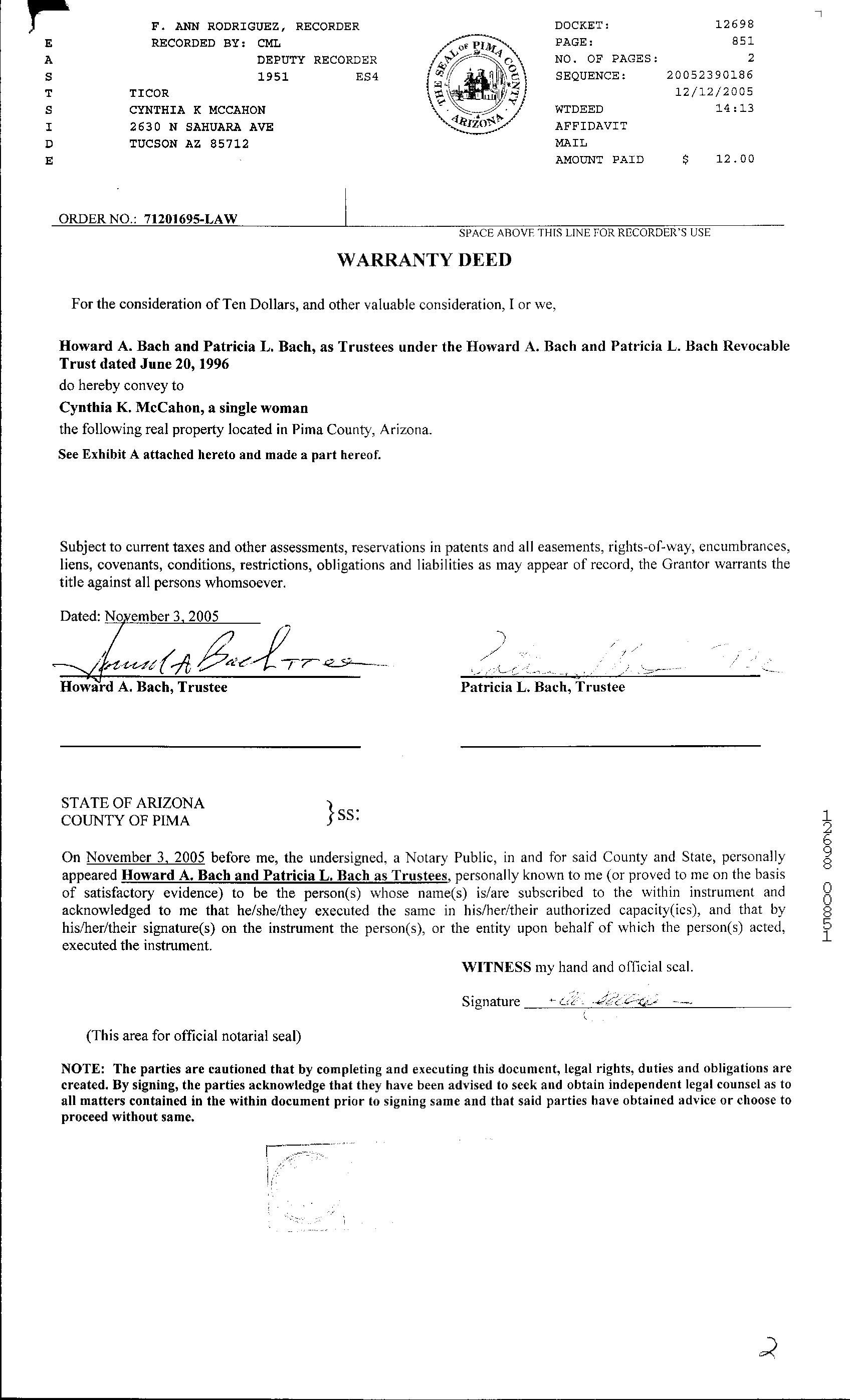 Seller Name : Bach Howard A & P L Trust