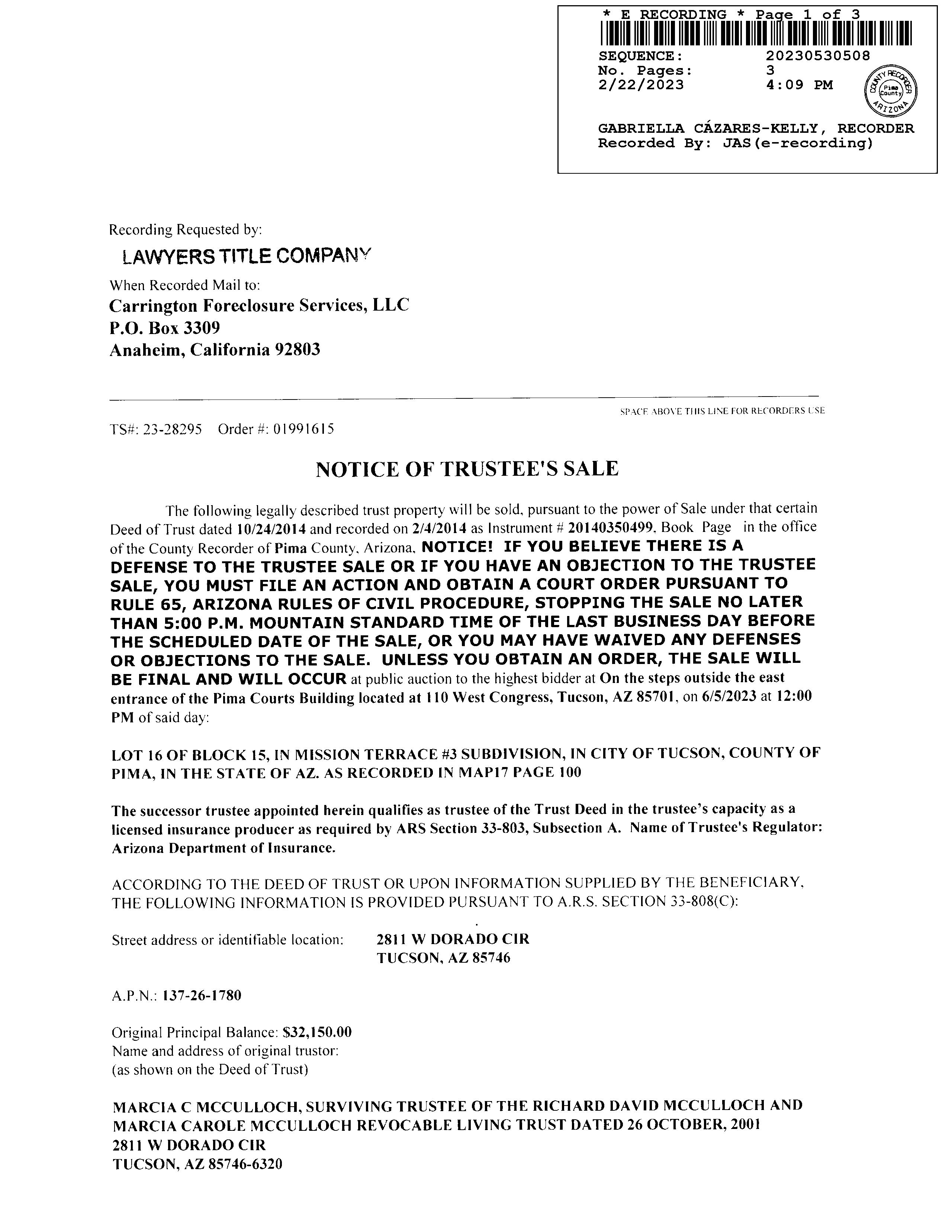 Subject Property : 2811 W Dorado Cir Tucson AZ 85746