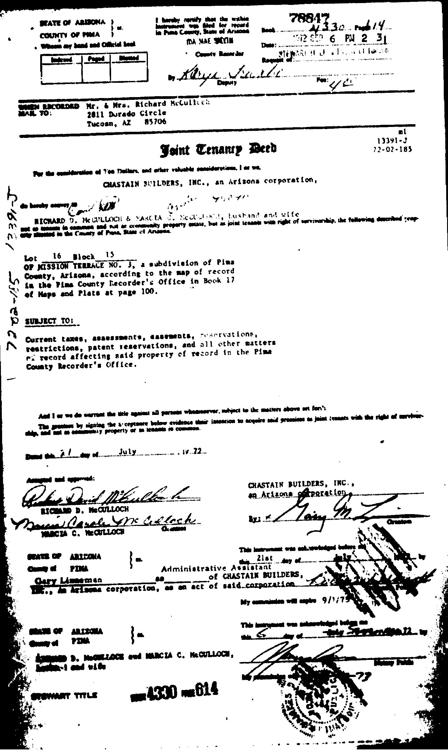 Carole APN / Alternate APN: 137-26-1780 / Deed Type: Deed (reg) Land Use: Sfr Subdivision / Tract: Mission Terrace 03 / Lot Size: 8,805 Year Built / Eff: 1972 / Rec. Date / Price: 09/06/1972 / $ Living Area: 2,204 # of units: Document #: 4330-614 Bedrooms: Pool: Total Tax Value: $155,444 Bath(F/H): / #1 6422 S Cactus Wren Pl Tucson Az 85746