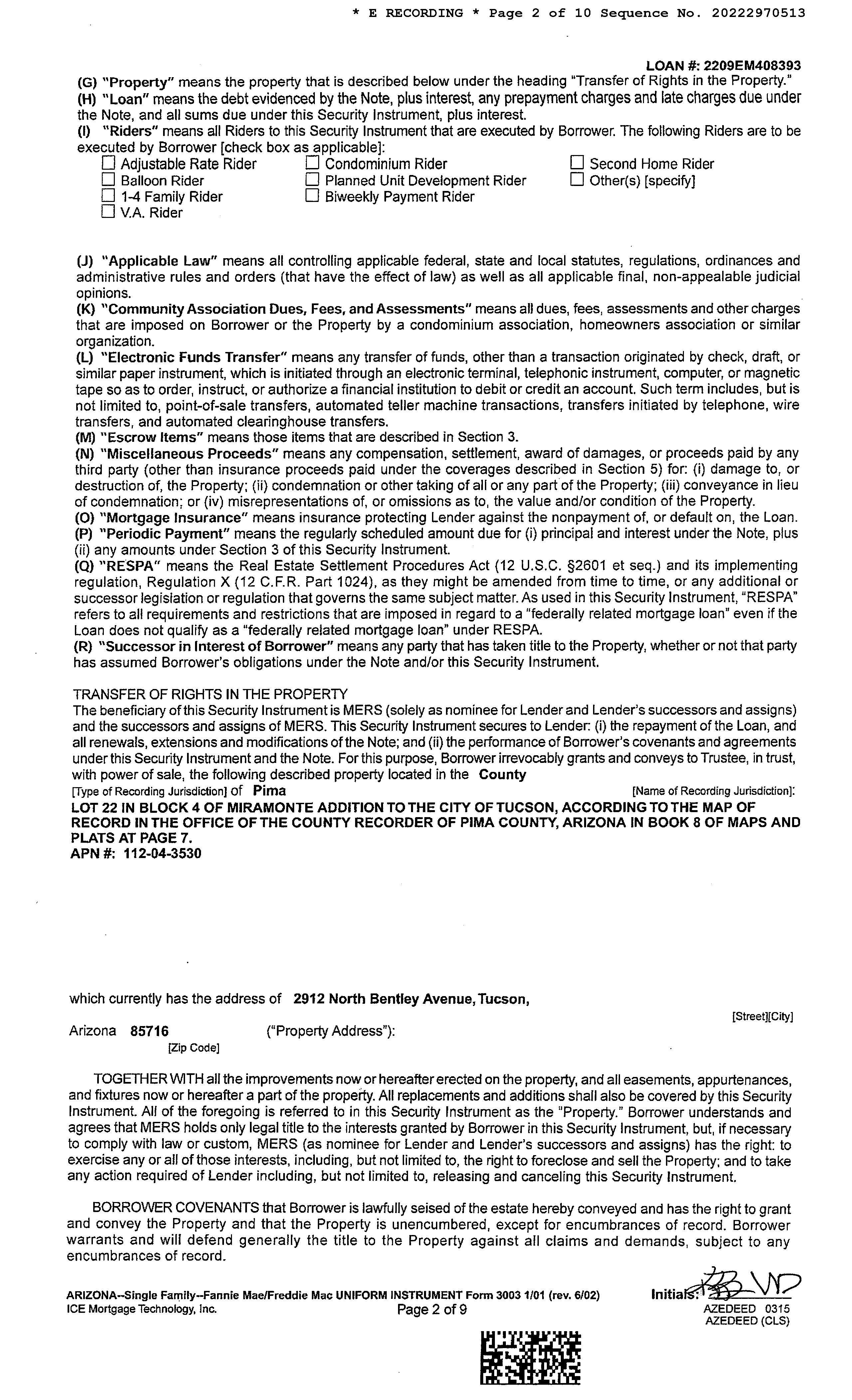 OWNER: BRUHN VAN & KARMEN AFFIDAVIT 2022 512 10/24/2022 SITUS: 2912 N BENTLEY AVE TUCSON MAIL: 330 S PELICAN AVE PLAT: LOT 00022 BLOCK 004 LEGAL: MIRAMONTE LOT 22 BLK 4 CURRENT TAXES INFORMATION THROUGH 10/21/2022 LAND IMPR EXEMPT RATE AREA SPECIAL DISTRICTS PRIMARY 12,507 0 0 11.1537 0150 SECONDARY 50 13,757 0 2.7742 2022 TOTAL TAX BILLED 1,741.97 2022 TAX AMT TAX DUE INTEREST DATE PAID TOTAL DUE FIRST HALF 870.99 870.99 11.61 882.60 SECOND HALF 870.98 870.98 0.00 870.98 TOTAL CURRENT TAXES DUE 11/22 1,753.58 12/22 1,765.20 (ESTIMATED) IMPROVEMENTS RESIDENTIAL PHYSICAL CONDITION AVERAGE BLDG SQFT 877 FULL CASH VALUE 138,074 YEAR BUILT 1948 LAND USE 01 31 NUMBER OF STORIES 1.0 LOT SIZE 1 STDLT STORIES HEIGHT 0 SCHOOL DISTRICT 0150 EXTERIOR WALLS STUCCO LAND FULL CASH VALUE 502 GRADE MATERIALS IMPR FULL CASH VALUE 137,572