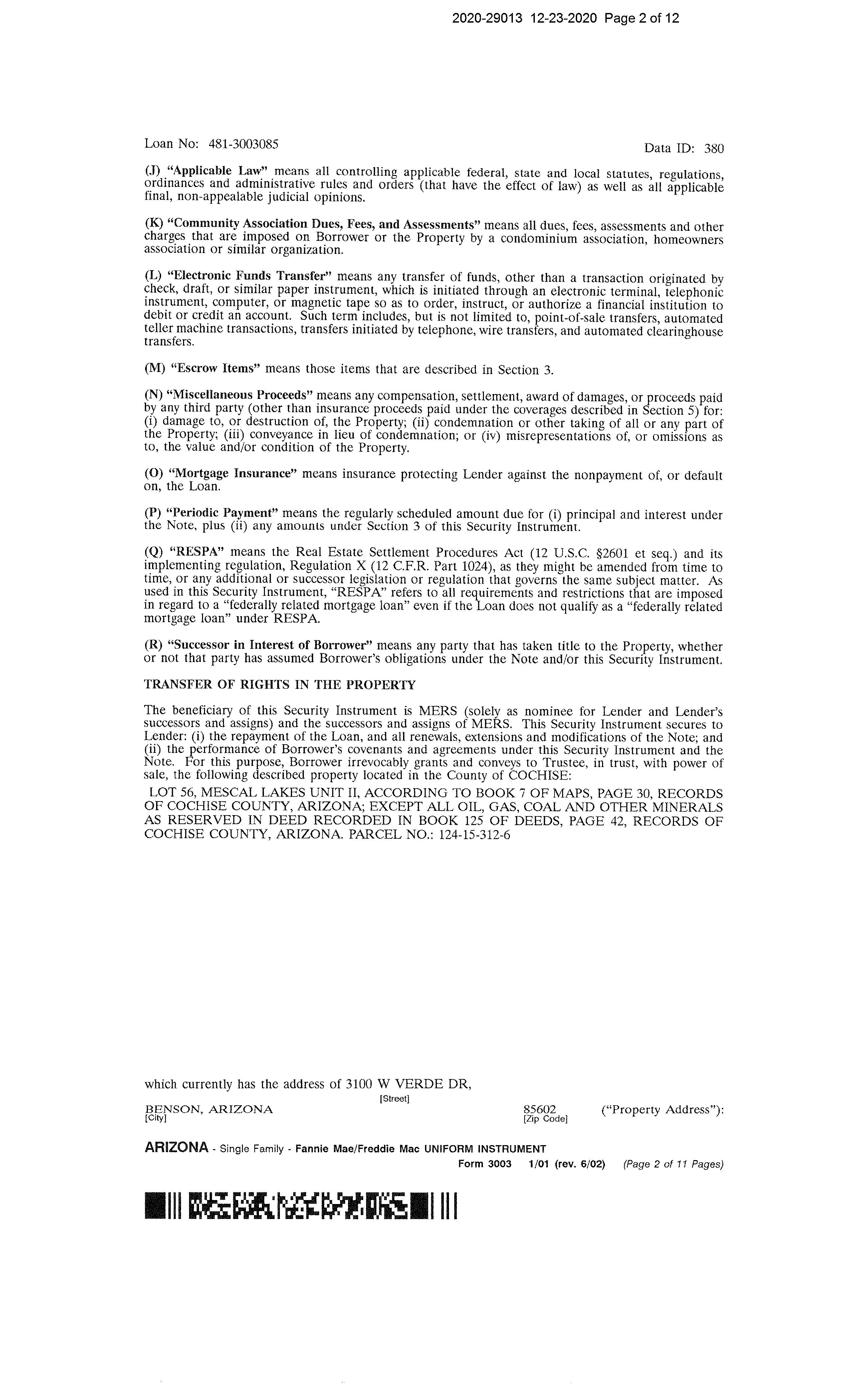 Subject Property: 3100 W Verde Dr Benson Az 85602 Owner Name: Mayer John B /