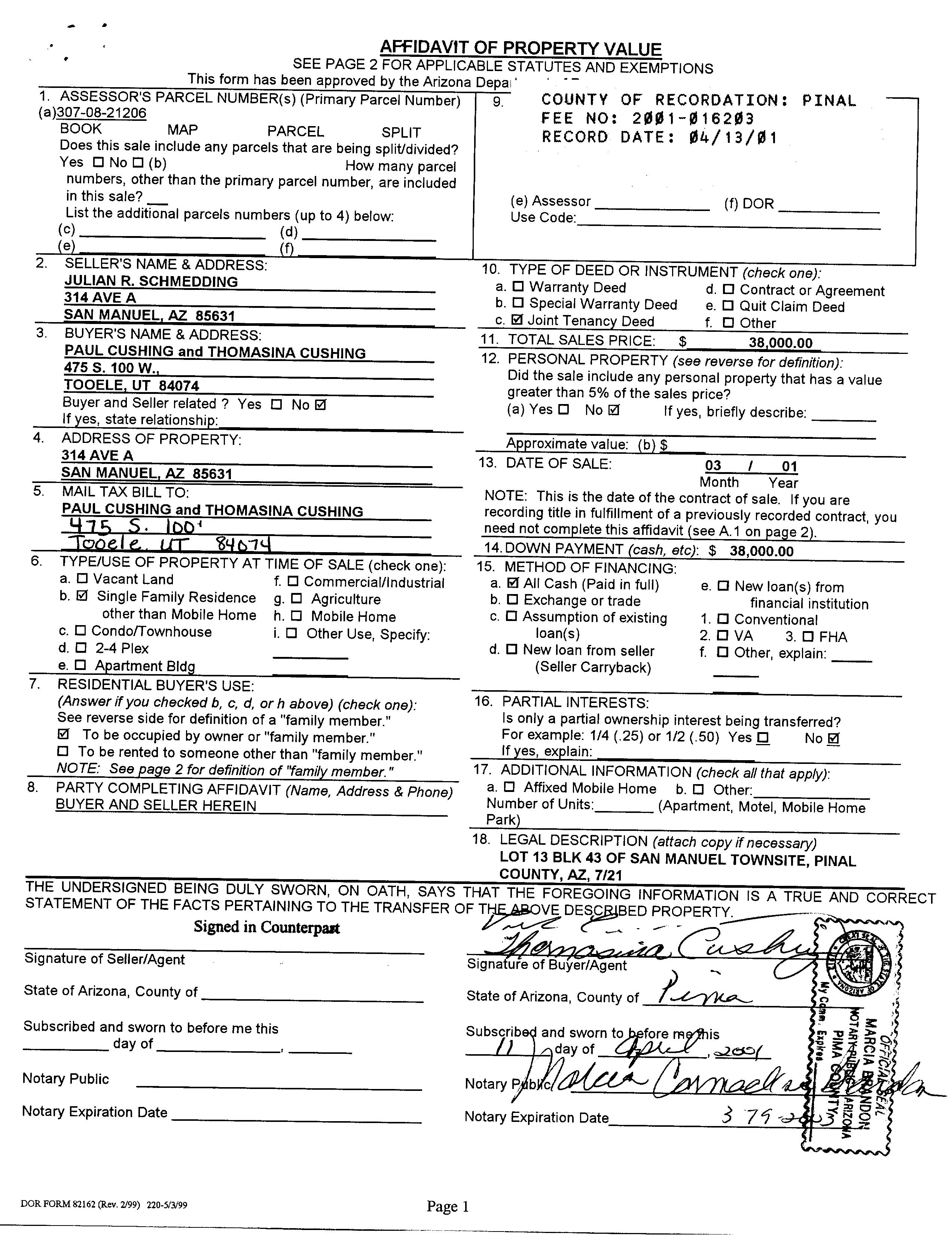 OWNER: CUSHING PAUL C & THOMASINA G LIV TR 2007 2528 01/05/2007 SITUS: 314 S AVENUE A SAN MANUEL