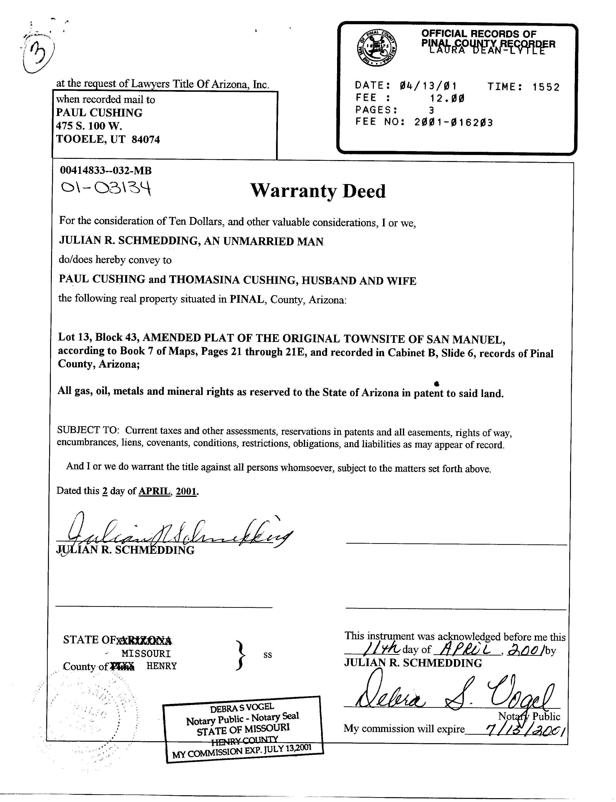 PINAL (PL), AZ Document:DED WAR 2001.16203 Page:3 of 5 Printed on:6/19/2024 10:19 AM Branch :FC0 User :JSTI