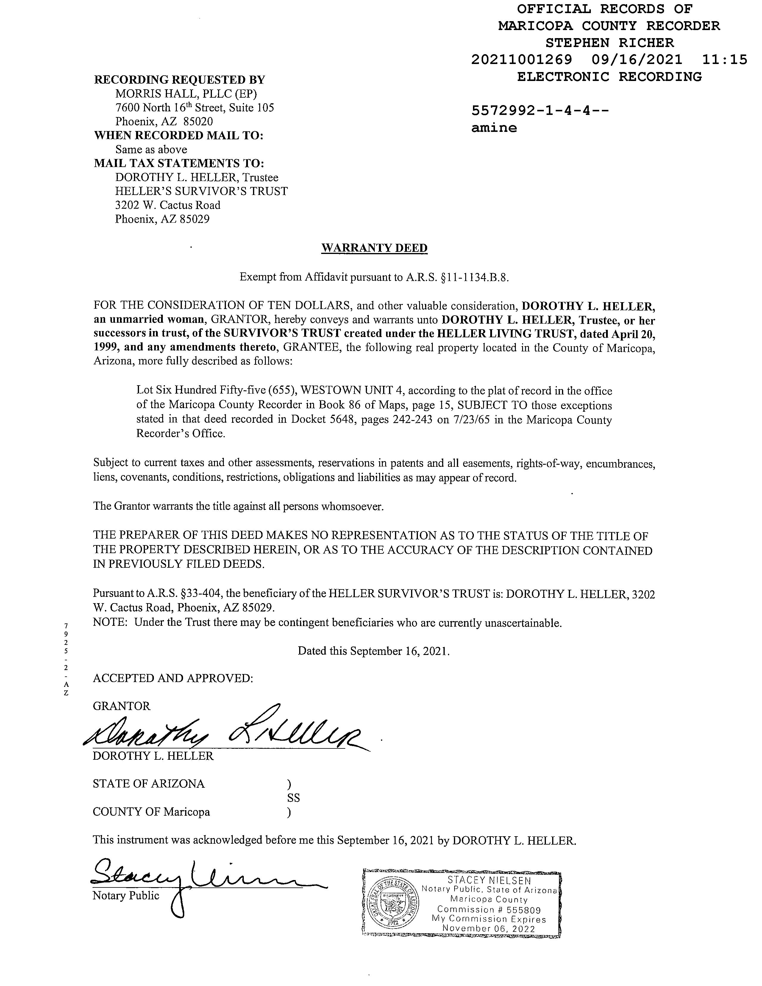 Subject Property : 3202 W Cactus Rd Phoenix AZ 85029 Owner Information Owner Name : Survivors Trust Mailing Address : 3202 W Cactus Rd, Phoenix AZ 85029-2327 C021 Vesting Codes : / / Trust Owner OccupiedIndicator : O Location Information Legal Description : Lot 655 Westown Unit 4 County : Maricopa, Az Subdivision : Westown 4 Lt 373-502, Trs A & B Census Tract / Block : 1040.00 / 3 Map Reference : 8615 Township-Range- Sect : 03N-02E-14 School District : Washington 6 Legal Lot : 655 Munic/Township : Phoenix APN : 149-42-153 Neighbor Code : 06-006 Owner Transfer Information Recording/Sale Date : 09/16/2021 / 09/16/2021 Deed Type : Warranty Deed Document # : 1001269 Property Characteristics Gross Area : 1,734 Capacity :Garage 2 Air Cond : Refrigeration Living Area : 1,734 Roof Material : Asphalt Shingle Quality : Average Total Rooms : 7 Heat Type : Forced Air Condition : Average Year Built / Eff : 1961 Cooling Type : Forced Air Bath Fixtures : 6 # of Stories : 1 Exterior wall : Paint Blk Pool Size : 448 Parking Type : Garage Pool : Pool Property Information Land Use : Sfr Lot Acres : 0.15 State Use : Single Fam Resurban Subd ( 3 ) Zoning : R1-6 Lot Size : 6,623 Customer Name : Lisa Mrazek Customer Company Name : First American Title Insurance Company Prepared On : 09/06/2022 © 2022 CoreLogic. All rights reserved