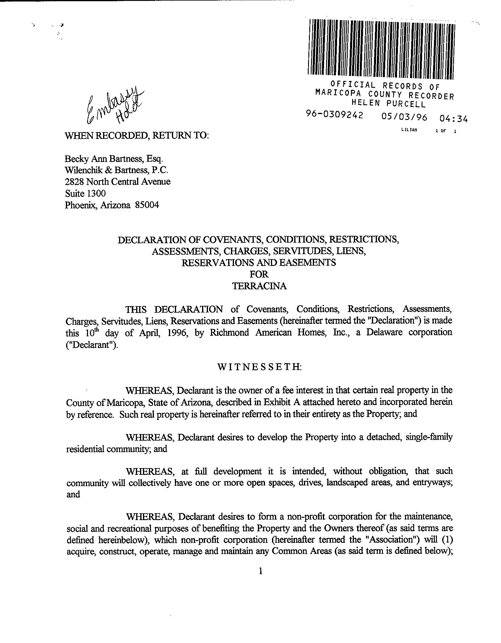 MARICOPA, AZ Document:RES 1996.309242 Page:1 of 34 Printed on:4/24/2023 4:27 PM Branch :FC0 User :JSTI