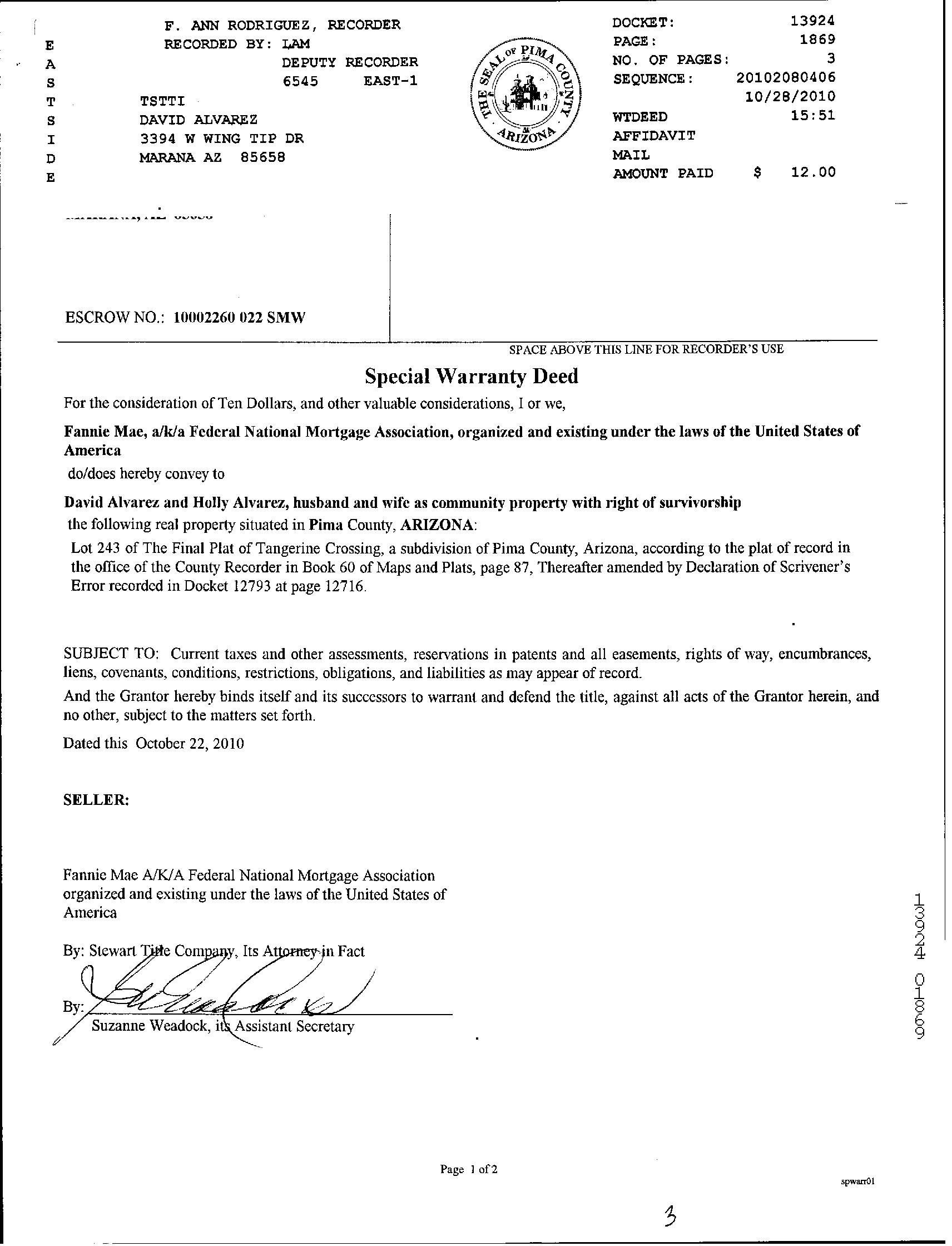 Mailing Address : 3394 W Wing Tip Dr, Marana AZ 85658-4690 H016