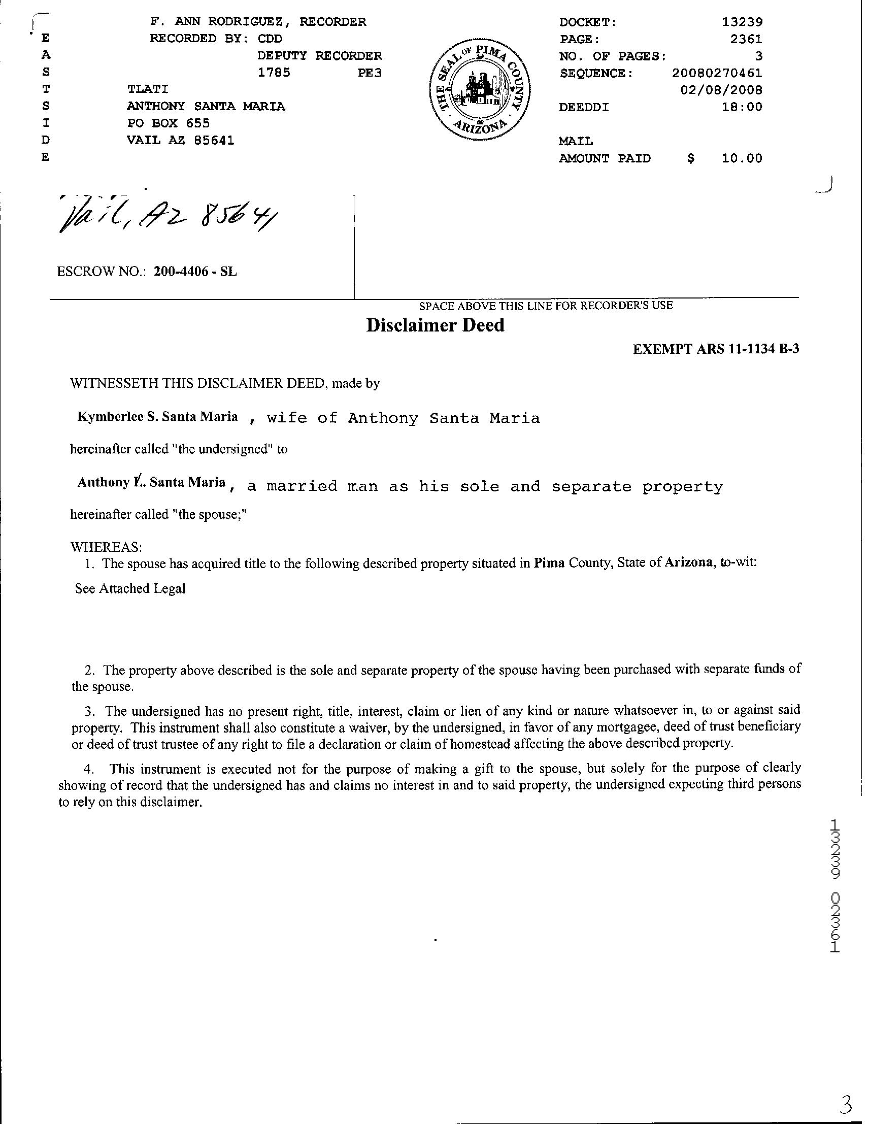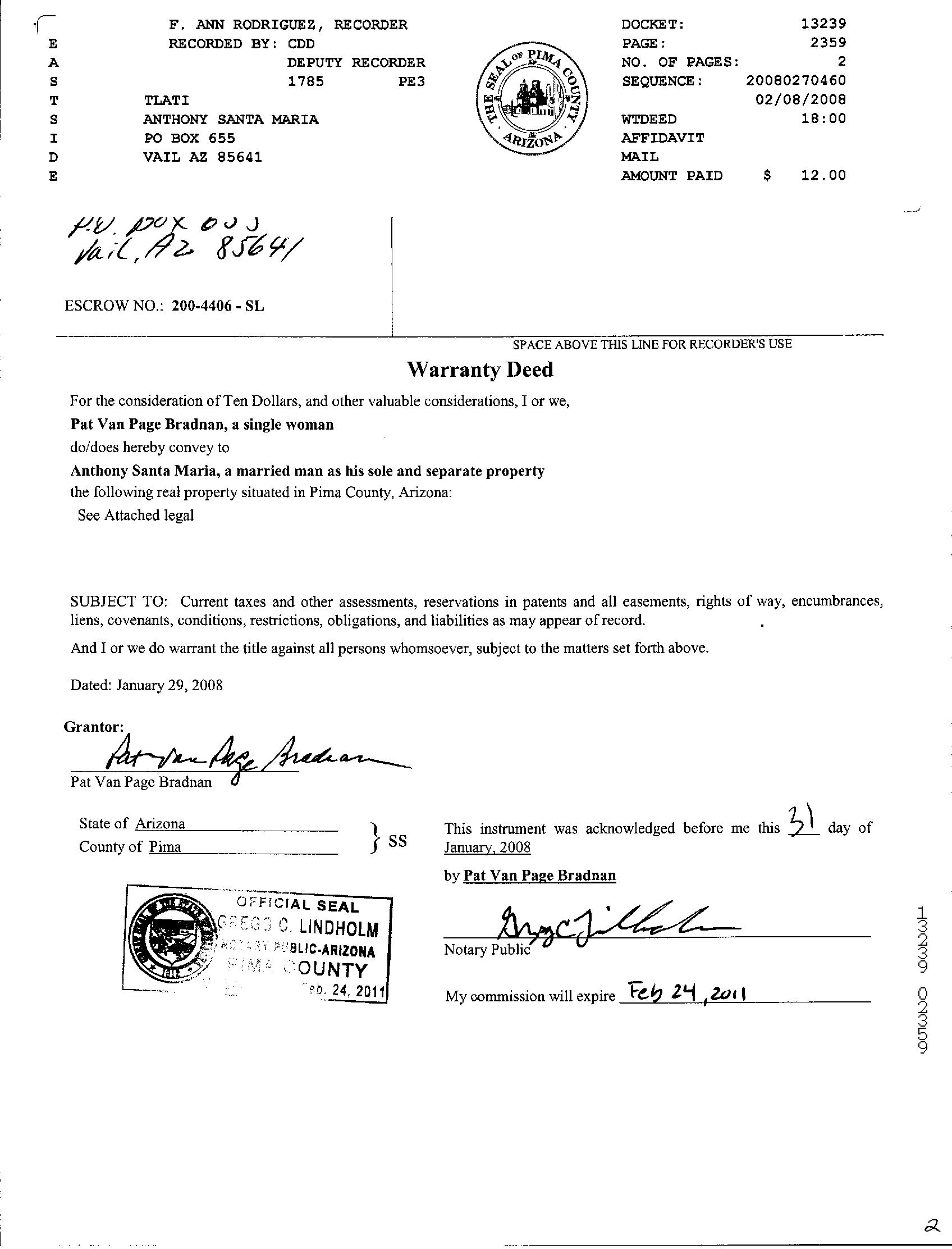 + FIRST AMERICAN TITLE, FC0, LMRA PIMA, AZ 08/18/2022 05:28PM RL13 INVESTIGATIVE SEARCH RESULTS PAGE 1 OF 1 SEARCH PARAMETERS PARCEL: 134-15-0150 PARCEL: 134-15-0150 INSTRUMENT REC DATE OWNER: SANTA MARIA ANTHONY 13239 2359 02/08/2008 SITUS: 350 S PANTANO RD TUC MAIL: PO BOX 30241 TUCSON AZ 85751-0241 PLAT: LOT 00013 BLOCK 0 LEGAL: PROSE LOT 13 CURRENT TAXES INFORMATION THROUGH 07/28/2022 LAND IMPR EXEMPT RATE AREA SPECIAL DISTRICTS PRIMARY 8,193 0 0 11.6619 0150 SECONDARY 7,560 960 0 2.8778 2021 TOTAL TAX BILLED 1,191.25 2021 TAX AMT TAX DUE INTEREST DATE PAID TOTAL DUE FIRST HALF 595.63 0.00 0.00 10/23/2021 0.00 SECOND HALF 595.62 0.00 0.00 05/28/2022 0.00 TOTAL CURRENT TAXES DUE 08/22 0.00 09/22 0.00 IMPROVEMENTS COMMERCIAL BLDG SQFT 0 FULL CASH VALUE 47,336 YEAR BUILT 1998 LAND USE 10 40 NUMBER OF STORIES 1.0 LOT SIZE 20,311 SQ FT STORIES HEIGHT 0 SCHOOL DISTRICT 0150 EXTERIOR WALLS LAND FULL CASH VALUE 42,000 GRADE MATERIALS IMPR FULL CASH VALUE 5,336 SALES SALE DATE SALE AMOUNT INSTRUMENT TYPE SELLER NAME VALIDITY 02/08/2008 100,000 13239 2359 WD BRADNAN PAT V 05/09/1990 60,000 8784 1557 WD BRADNAN MICHAEL L M ADDITIONAL PROPERTY INFORMATION STANDARD LAND USE: COMMERCIAL (NEC) END SEARCH