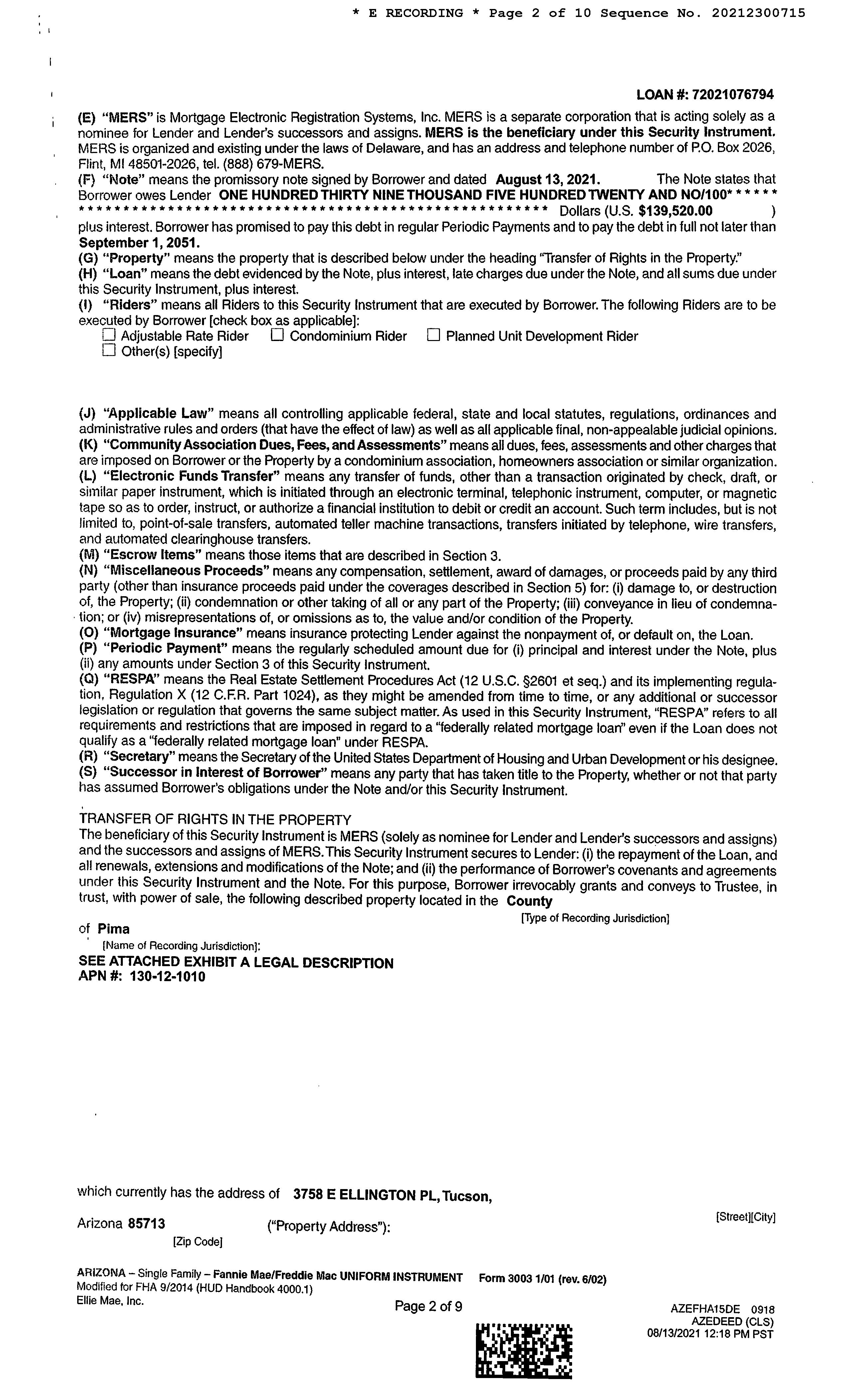 Subject Property : 3758 E Ellington Pl Tucson AZ 85713