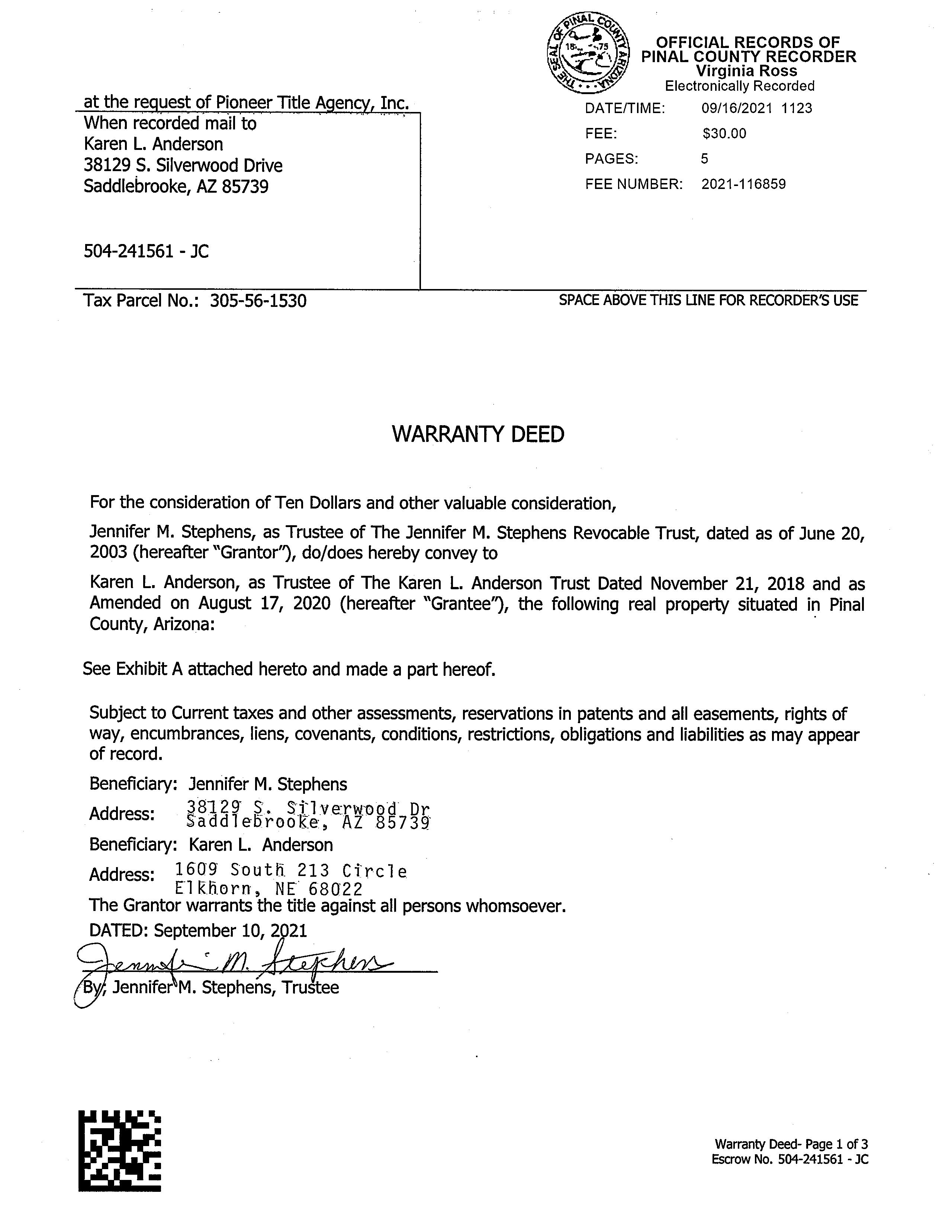 Owner Name: Anderson Karen / APN / Alternate APN: 305-56-153 / Deed Type: Warranty Deed