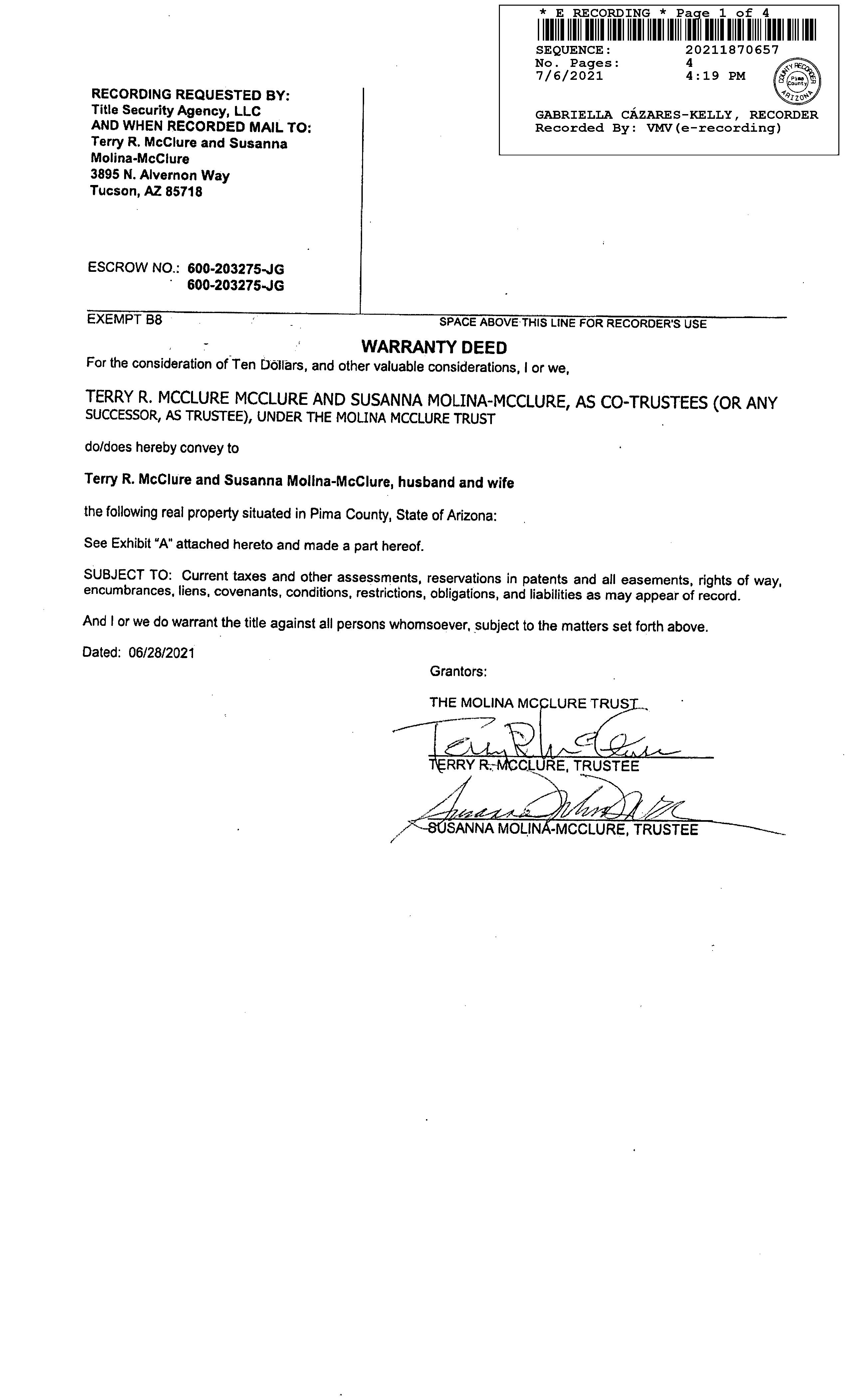 Mc Clure / APN / Alternate APN: 111-01-021A / Deed Type: Land Use: Sfr Subdivision / Tract: / Lot Size: 81,893 Year Built / Eff: 1999 / Rec. Date / Price: / $ Living Area: 1,760 # of units: Document #: Bedrooms: Pool: Total Tax Value: $255,196 Bath(F/H): / #1 3725 E River Rd Tucson Az 85718 Owner Name: Peck John T Trust / APN / Alternate APN: 111-01-006A / Deed Type: Warranty Deed Land Use: Sfr Subdivision / Tract: / Lot Size: 67,082 Year Built / Eff: 1956 / Rec. Date / Price: 03/14/2023 / $350,000 Living Area: 1,568 # of units: Document #: 730459 Bedrooms: Pool: Total Tax Value: $209,184 Bath(F/H): / #2 3524 N Lilly Pond Pl Tucson Az 85712 Owner Name: