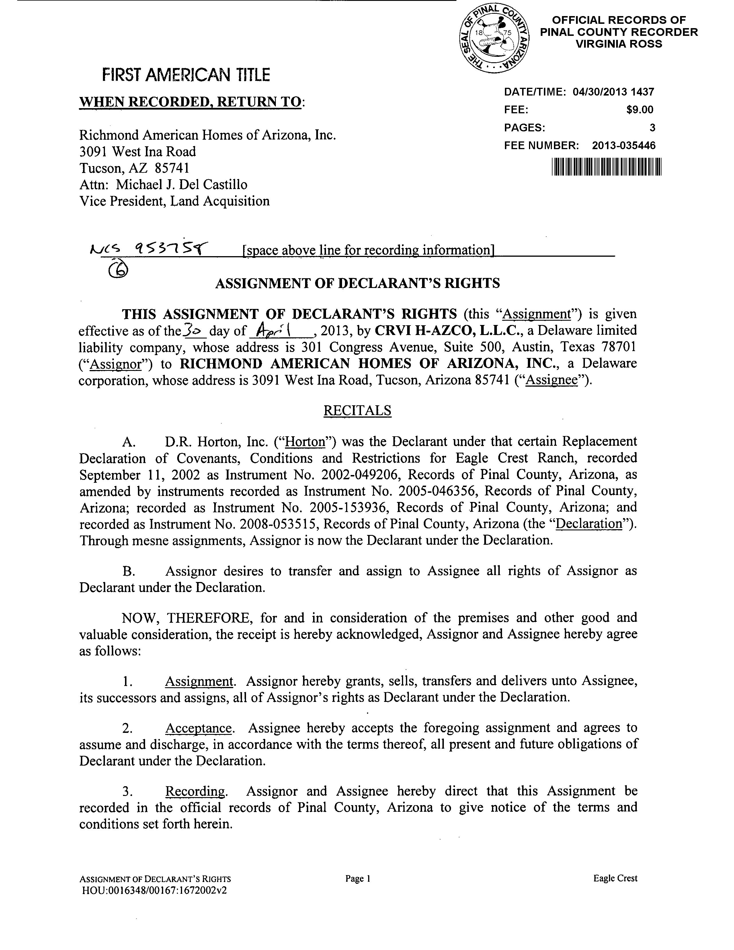 PINAL (PL), AZ Document:ASN 2013.35446 Page:1 of 3 Printed on:4/11/2023 11:53 AM Branch :FC0 User :JSTI