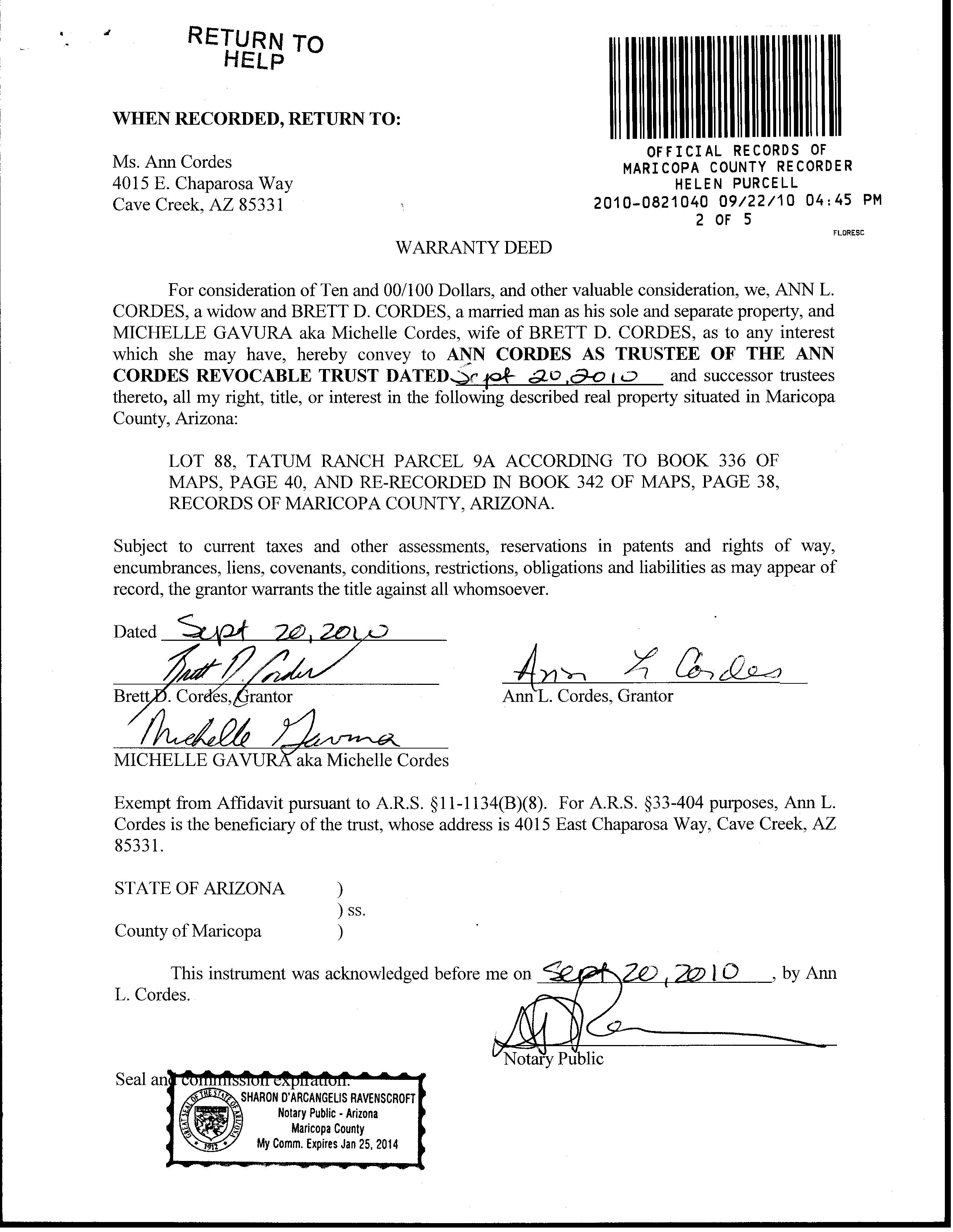Name: Ann Cordes / APN / Alternate APN: 211-62-428 / Deed Type: Warranty Deed Land Use: Sfr Subdivision / Tract: Tatum Ranch Prcl 9a / Lot Size: 5,446 Year Built / Eff: 1994 / Rec. Date / Price: 07/28/2009 / $180,700 Living Area: 1,345 # of units: Document #: 694058 Bedrooms: Pool: Total Tax Value: $251,700 Bath(F/H): / #1 4019 E Chaparosa Way Cave Creek Az 85331