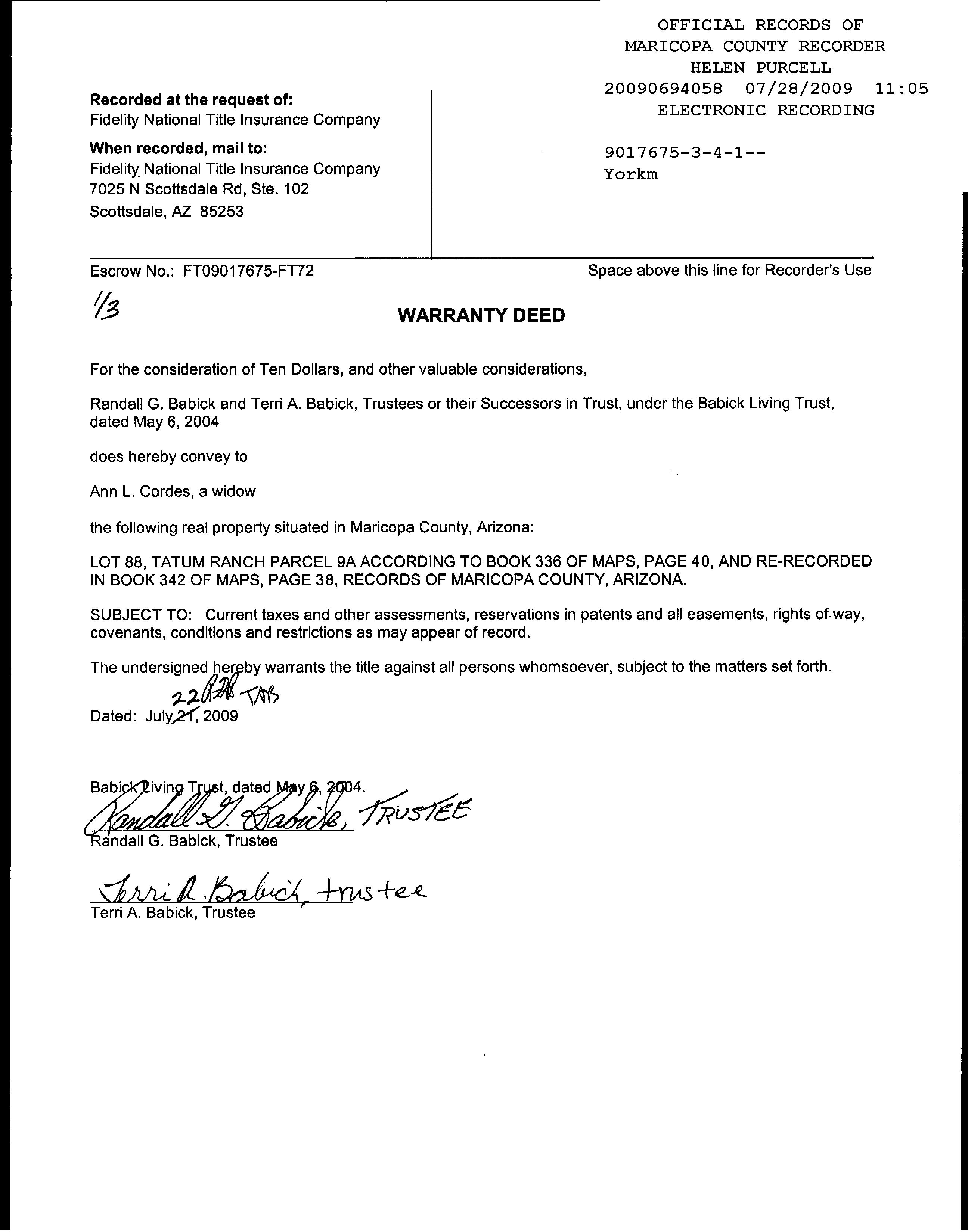 MARICOPA, AZ Document:DED WAR 2009.694058 Page:1 of 3 Printed on:5/19/2023 9:44 AM Branch :FC0 User :JSTI