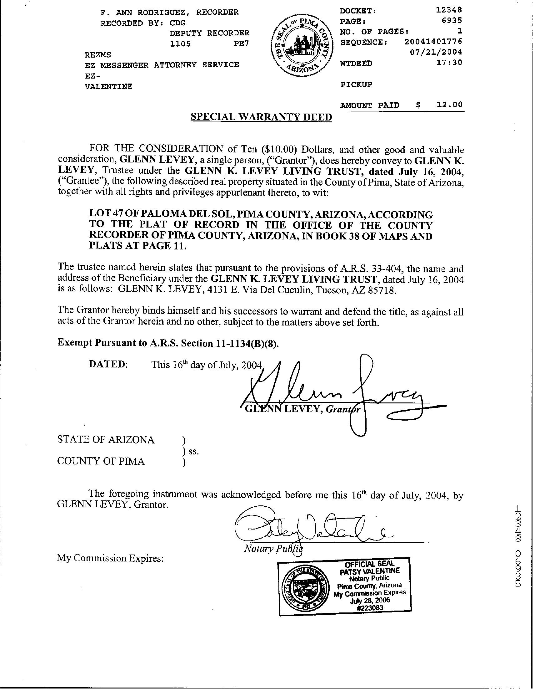 Recording/Sale Date : 07/21/2004 / 07/16/2004 Deed Type : Special Warranty Deed