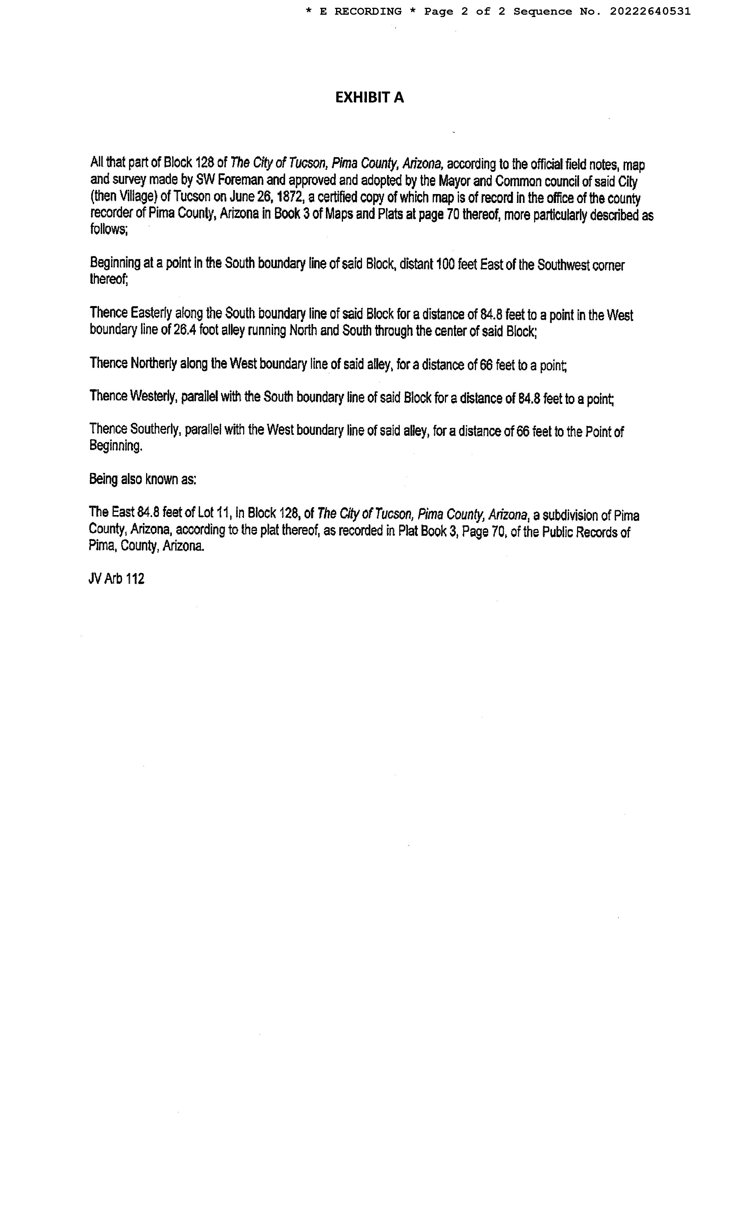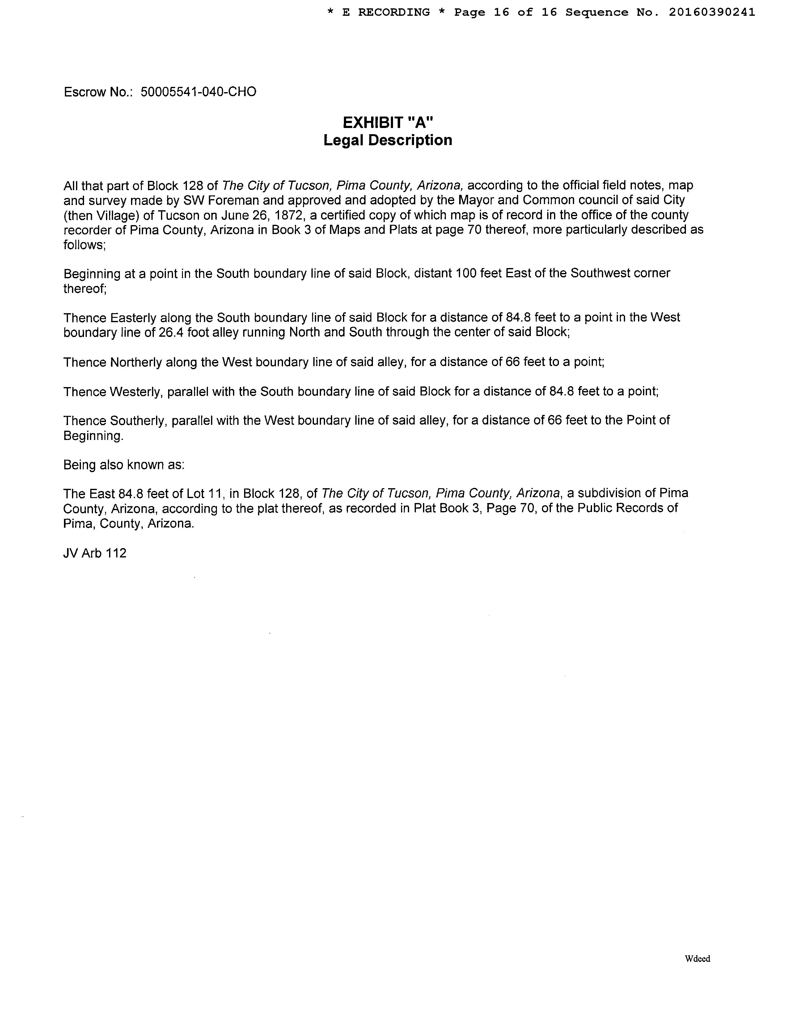 Legal Description : Tucson E84.8' Lot 11 Blk 128 Historic Property (potential Additional Tax) Per Ars 42-12104(a)
