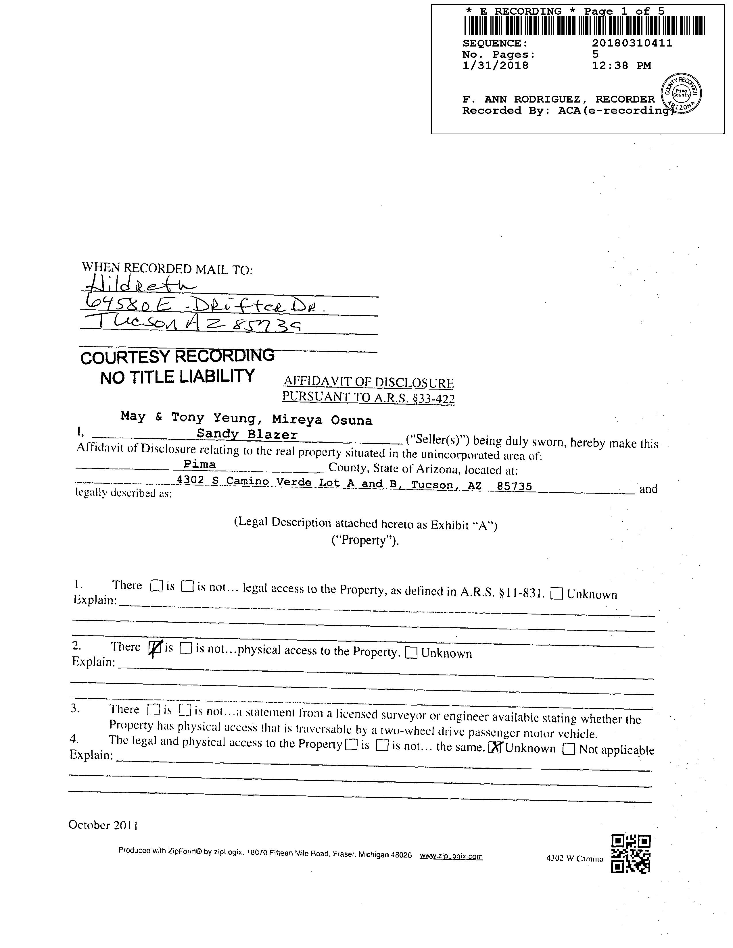 Subject Property :   4302 S Camino Verde Tucson AZ 85735
