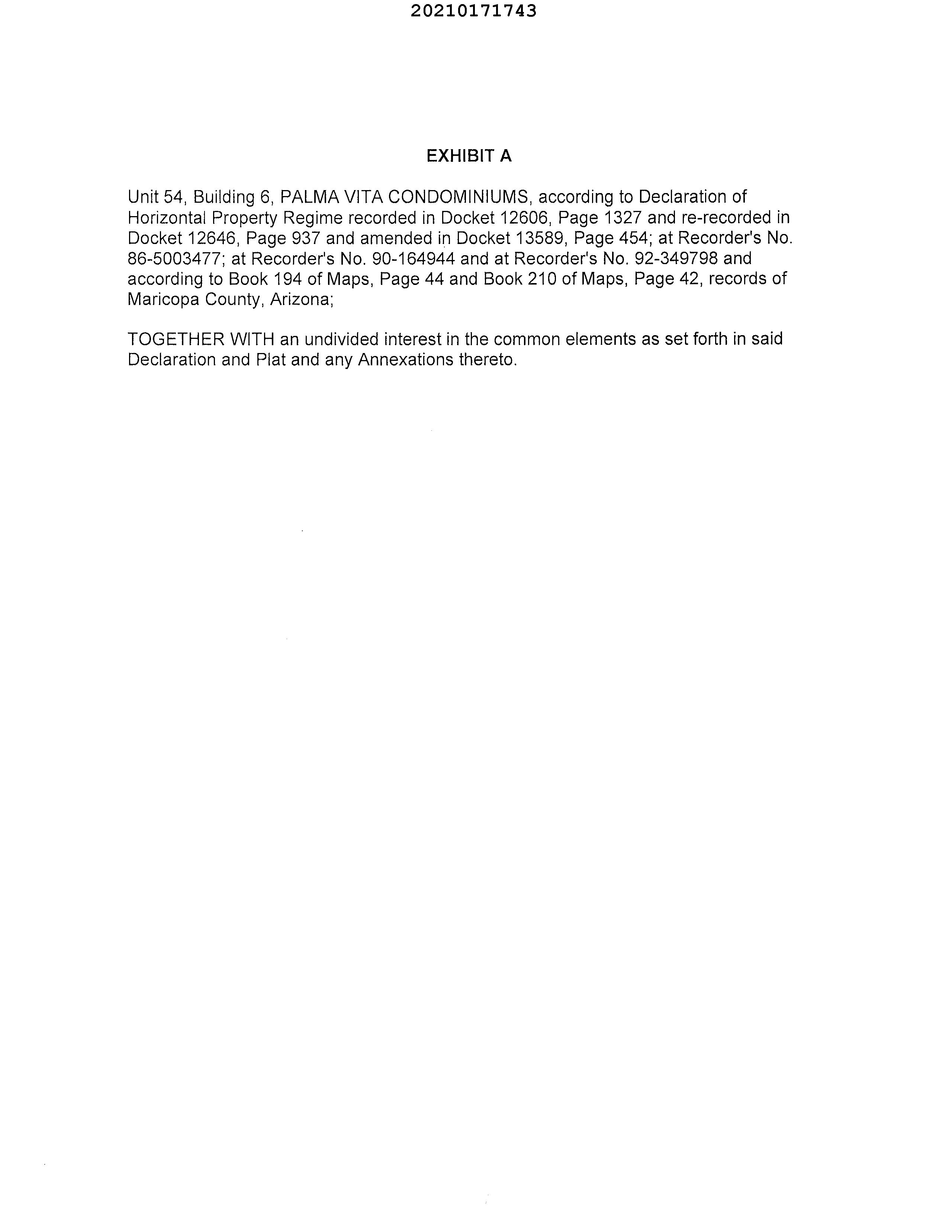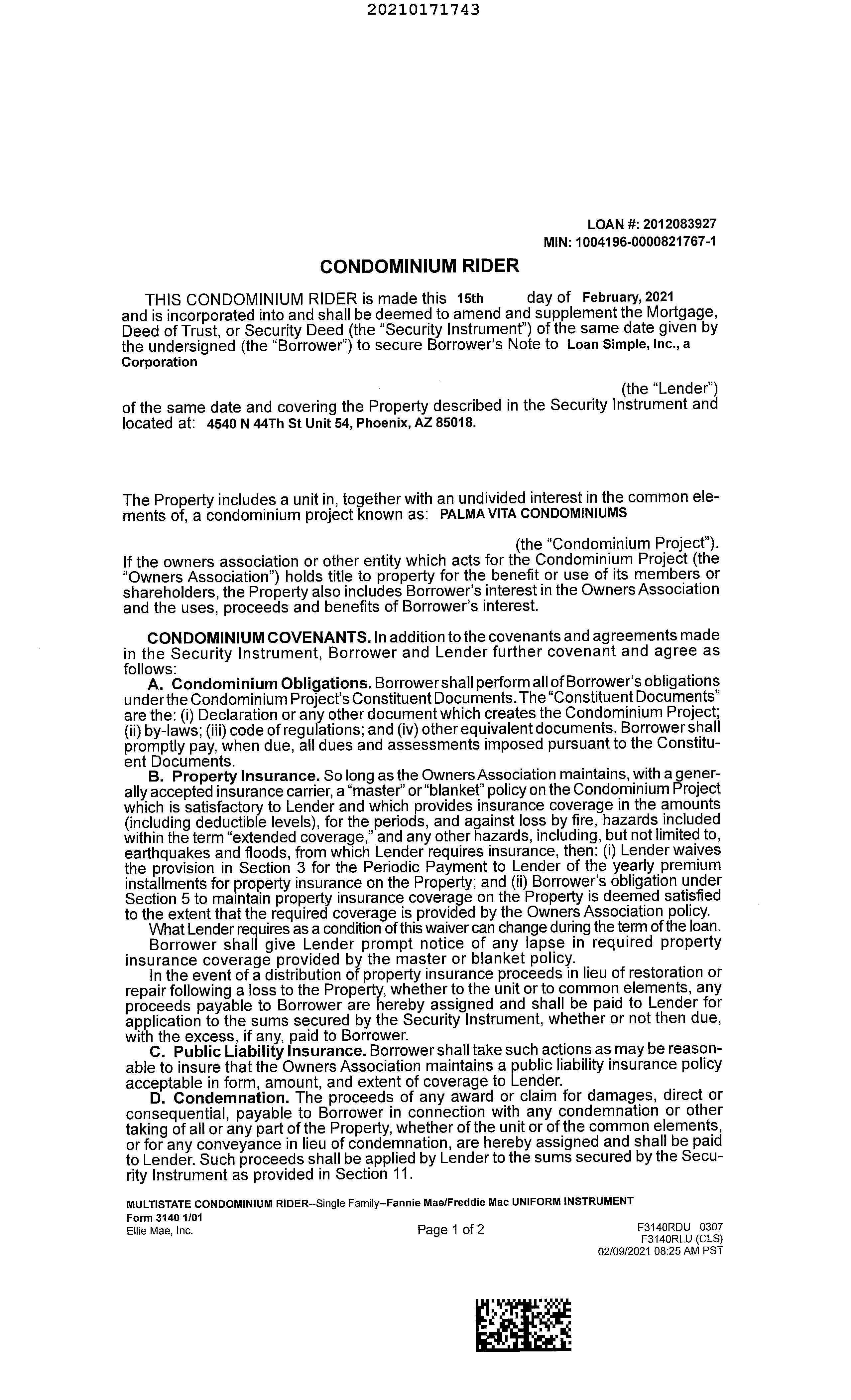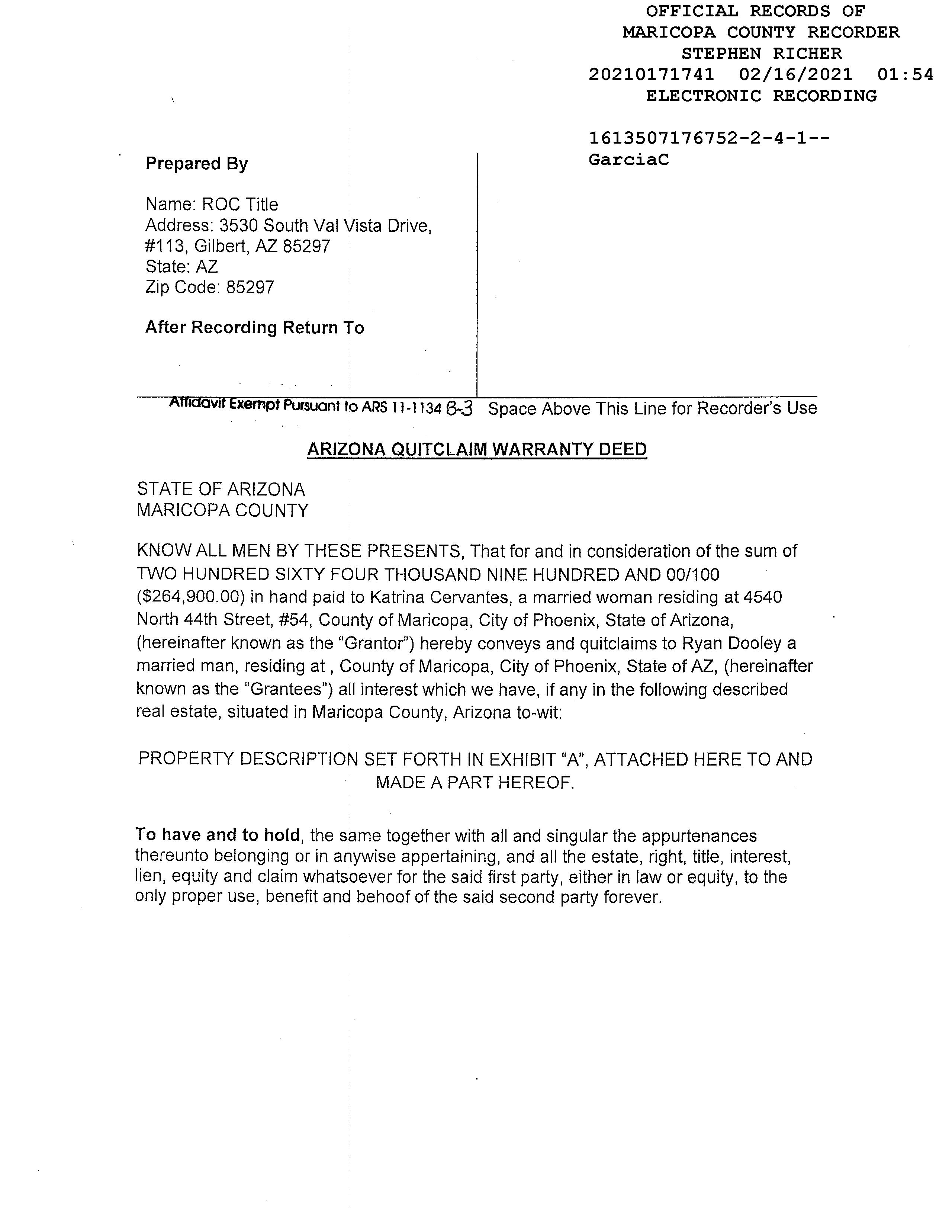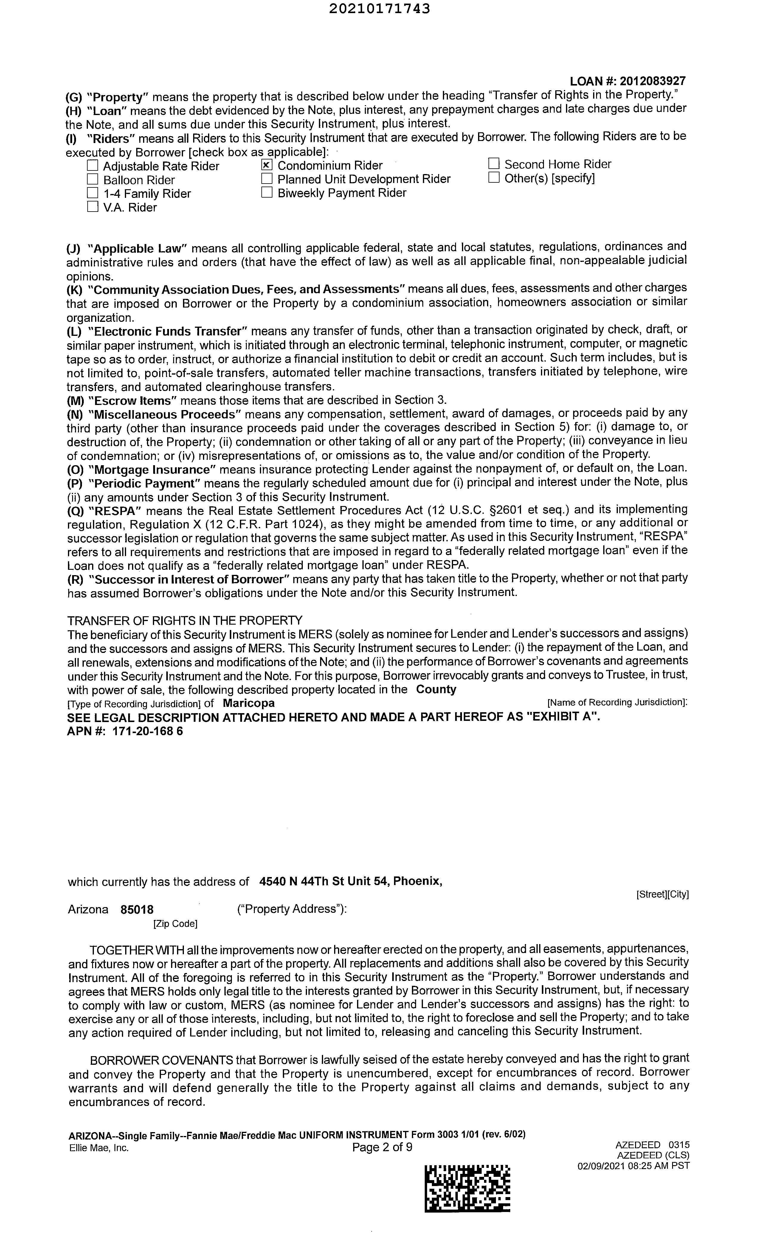 Subject Property : 4540 N 44th St # 1 Phoenix AZ 85018 Owner Information Owner Name : Koondel Robyn Mailing Address : 4450 N 44th St #1, Phoenix AZ 85018 C044 Vesting Codes : / / Trust Owner OccupiedIndicator : A Location Information Legal Description : Lot 1 Palma Viva Condominiums Replat Mcr 210-42 Unit 1 Tog W A 1/70 Int In All Common Elements Ex Any Pt Ly W/in Rd P/d 90-251856 County : Maricopa, Az Subdivision : Palma Viva Condo Rep Census Tract / Block : 1082.00 / 1 Map Reference : 21042 Township-Range- Sect : 02N-04E-19 School District : Scottsdale 48 Legal Lot : 1 Munic/Township : Phoenix APN : 171-20-115 Neighbor Code : 18-007 Owner Transfer Information Recording/Sale Date : 01/31/2002 / 01/23/2002 Deed Type : Special Warranty Deed Document # : 108001 Last Market Sale Information Recording/Sale Date : 10/12/1990 / 10/00/1990 Deed Type : Deed (reg) Sale Price : $132,000 Price Per SqFt : $70.66 Document # : 459399 Title Company : Fidelity National Title Insura Lender : No New Mtg Seller Name : Schiffner Prior Sale Information Prior Rec/Sale Date : / 10/00/1982 Prior Deed Type : Deed (reg) Prior Sale Price : $150,500 Prior 1st Mtg Amt/Type : $50,000 / Conv Prior Doc Number : 16326-7 Customer Name : Lisa Mrazek Customer Company Name : First American Title Insurance Company Prepared On : 08/25/2022 © 2022 CoreLogic. All rights reserved