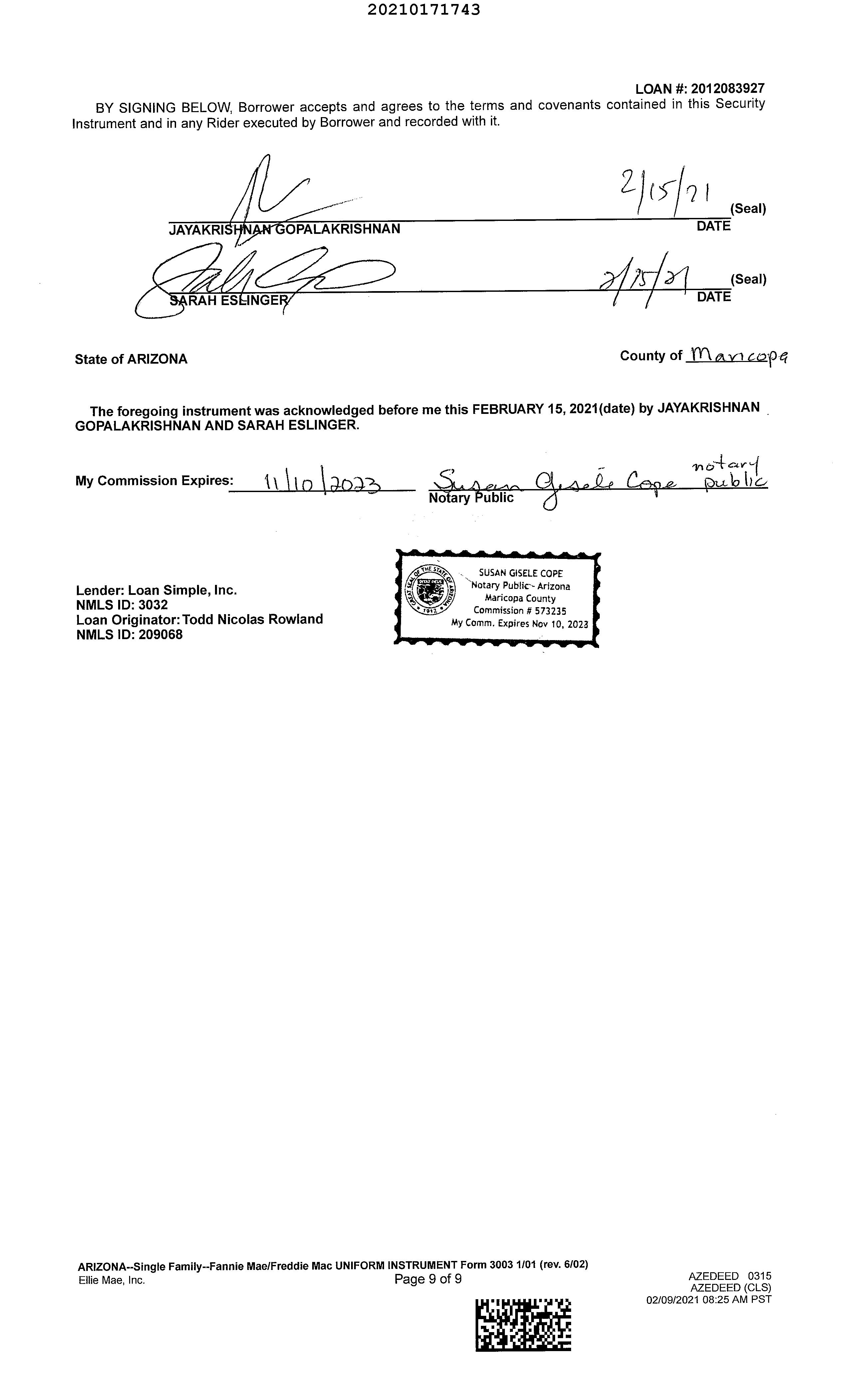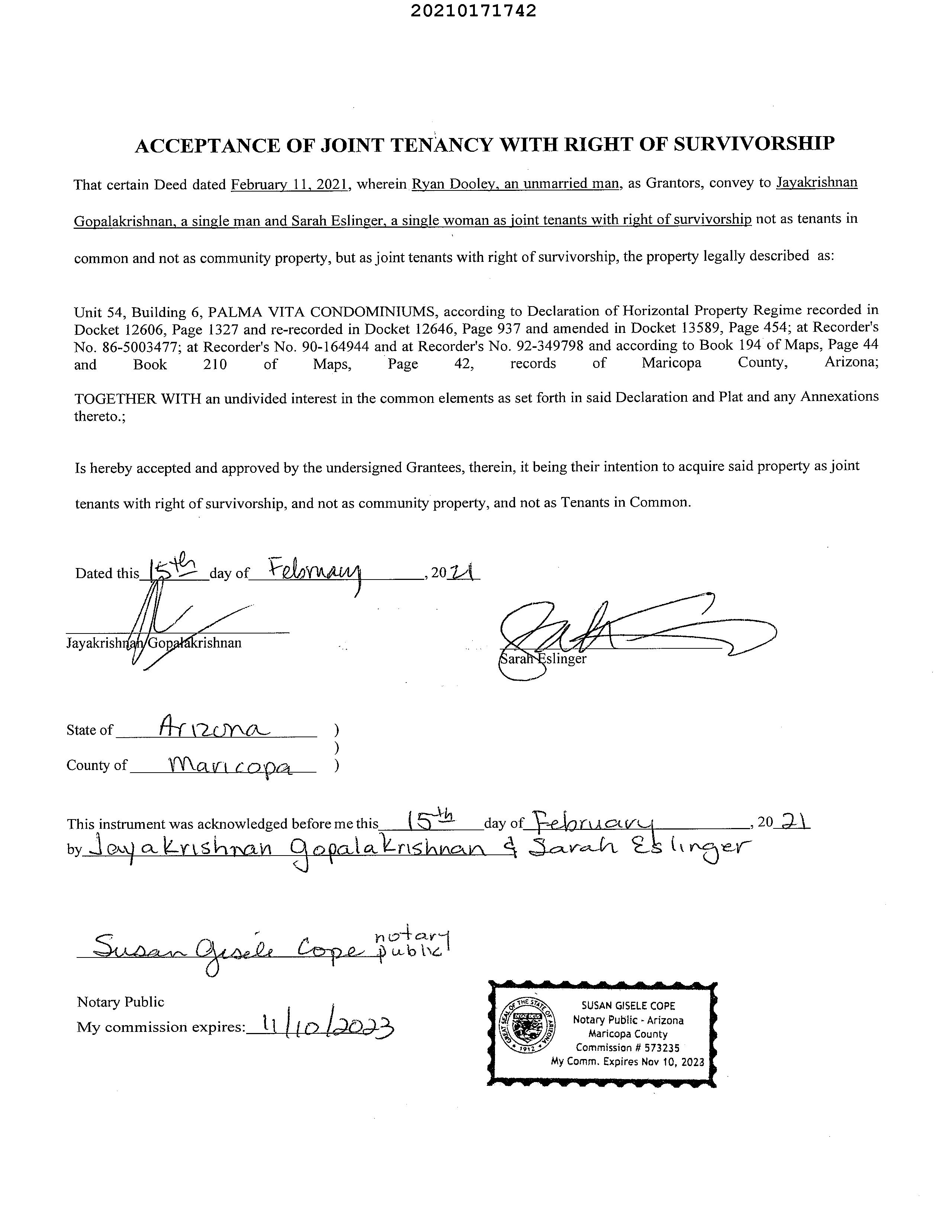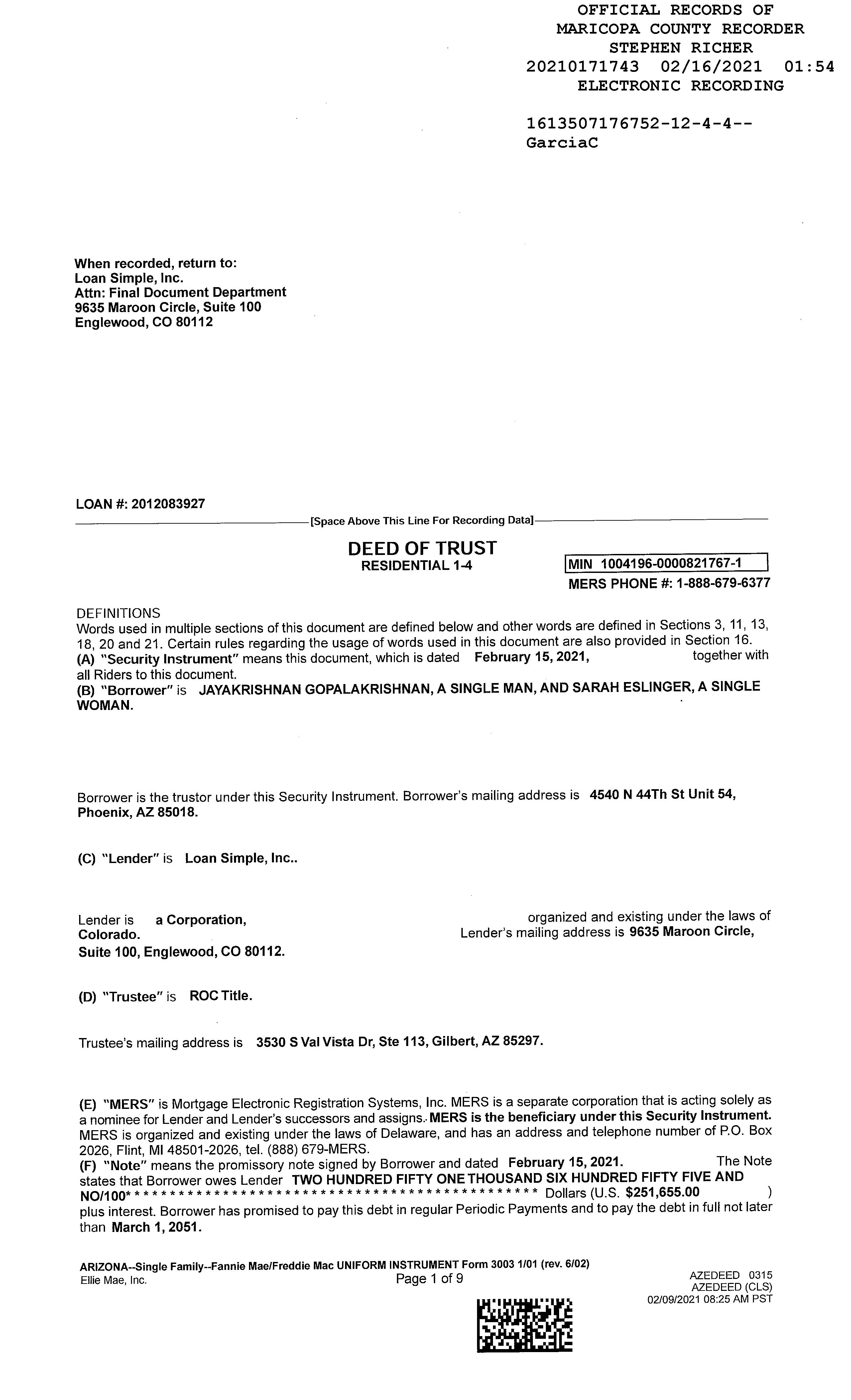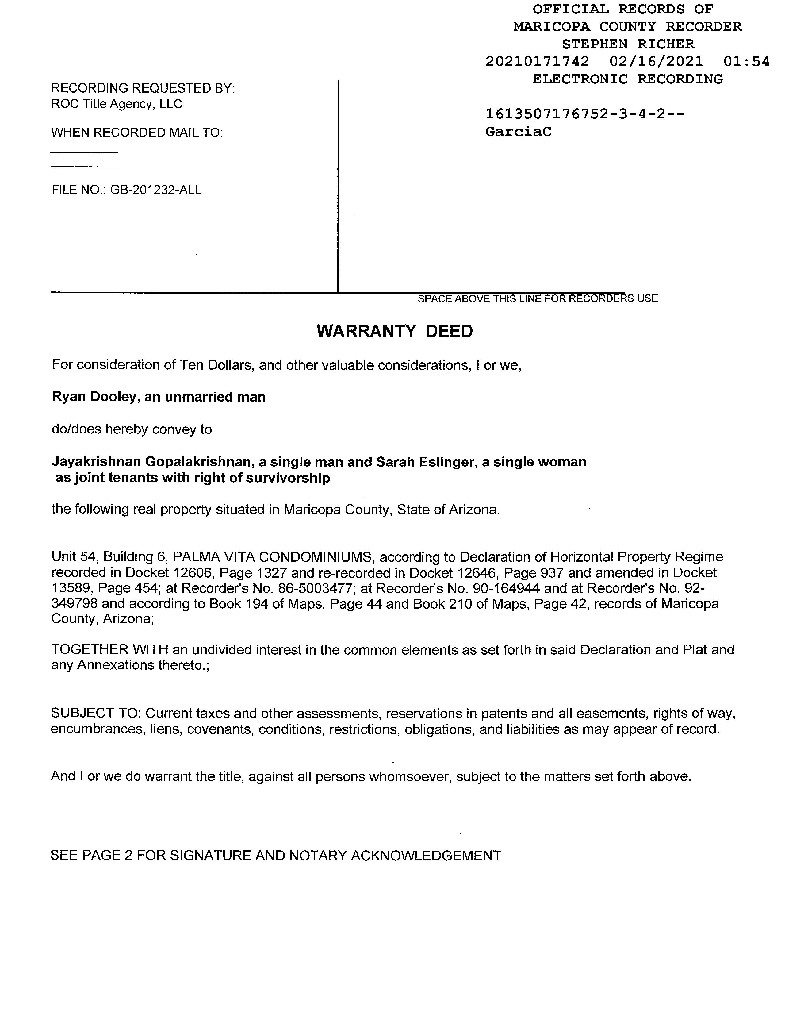 Subject Property : 4540 N 44th St # 1 Phoenix AZ 85018 Owner Information Owner Name : Koondel Robyn Mailing Address : 4450 N 44th St #1, Phoenix AZ 85018 C044 Vesting Codes : / / Trust Owner OccupiedIndicator : A Location Information Legal Description : Lot 1 Palma Viva Condominiums Replat Mcr 210-42 Unit 1 Tog W A 1/70 Int In All Common Elements Ex Any Pt Ly W/in Rd P/d 90-251856 County : Maricopa, Az Subdivision : Palma Viva Condo Rep Census Tract / Block : 1082.00 / 1 Map Reference : 21042 Township-Range- Sect : 02N-04E-19 School District : Scottsdale 48 Legal Lot : 1 Munic/Township : Phoenix APN : 171-20-115 Neighbor Code : 18-007 Owner Transfer Information Recording/Sale Date : 01/31/2002 / 01/23/2002 Deed Type : Special Warranty Deed Document # : 108001 Last Market Sale Information Recording/Sale Date : 10/12/1990 / 10/00/1990 Deed Type : Deed (reg) Sale Price : $132,000 Price Per SqFt : $70.66 Document # : 459399 Title Company : Fidelity National Title Insura Lender : No New Mtg Seller Name : Schiffner Prior Sale Information Prior Rec/Sale Date : / 10/00/1982 Prior Deed Type : Deed (reg) Prior Sale Price : $150,500 Prior 1st Mtg Amt/Type : $50,000 / Conv Prior Doc Number : 16326-7 Customer Name : Lisa Mrazek Customer Company Name : First American Title Insurance Company Prepared On : 08/25/2022 © 2022 CoreLogic. All rights reserved
