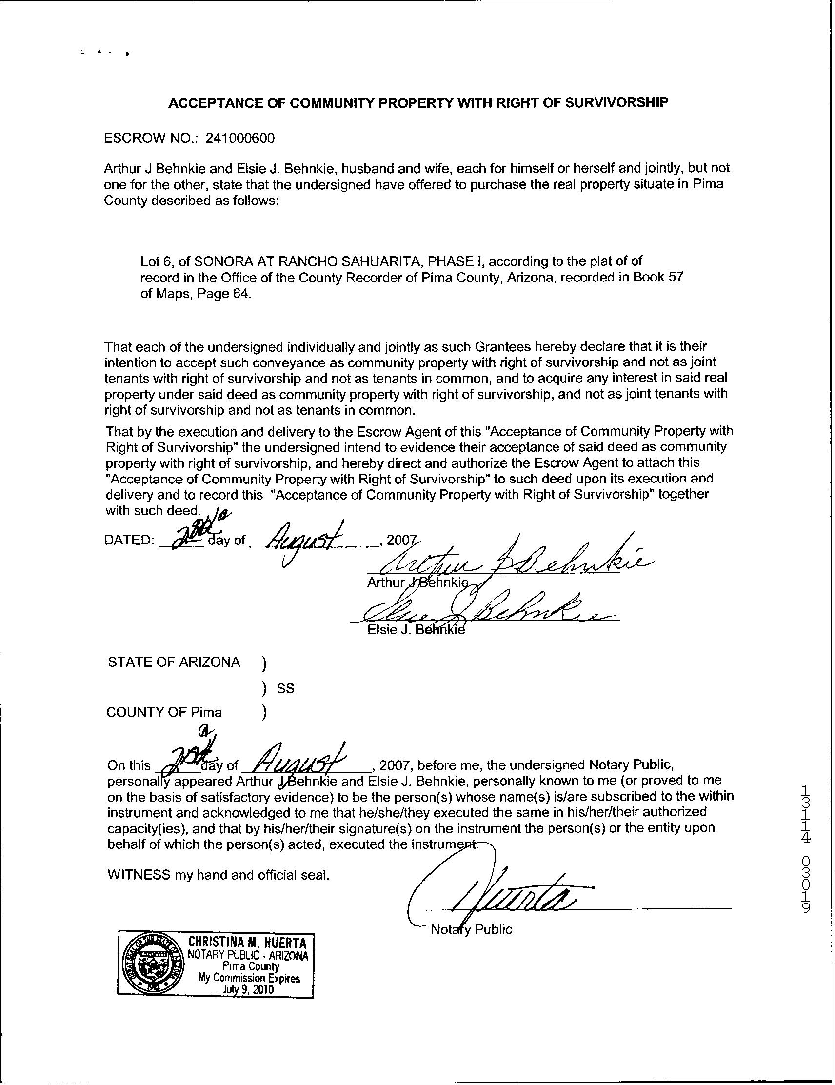 Type: Special Warranty Deed Land Use: Sfr Subdivision / Tract: Sonora/rho Sahuarita Ph I / Lot Size: 5,379 Year Built / Eff: 2004 / Rec. Date / Price: 08/08/2007 / $246,759 Living Area: 1,822 # of units: Document #: 13114-3018 Bedrooms: Pool: Total Tax Value: $179,632 Bath(F/H): /