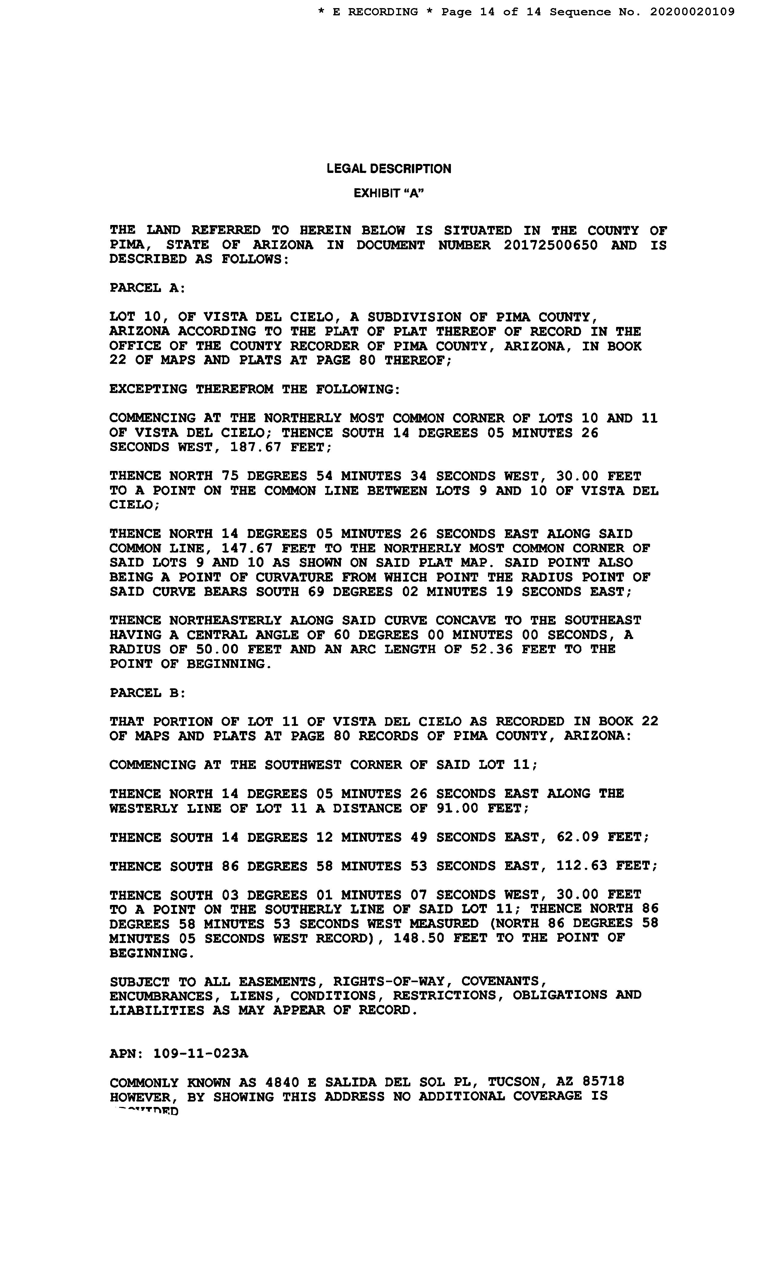 Legal Description : Vista Del Cielo Lot 10 Exc Nw Ptn & Sw Ptn Lot 11