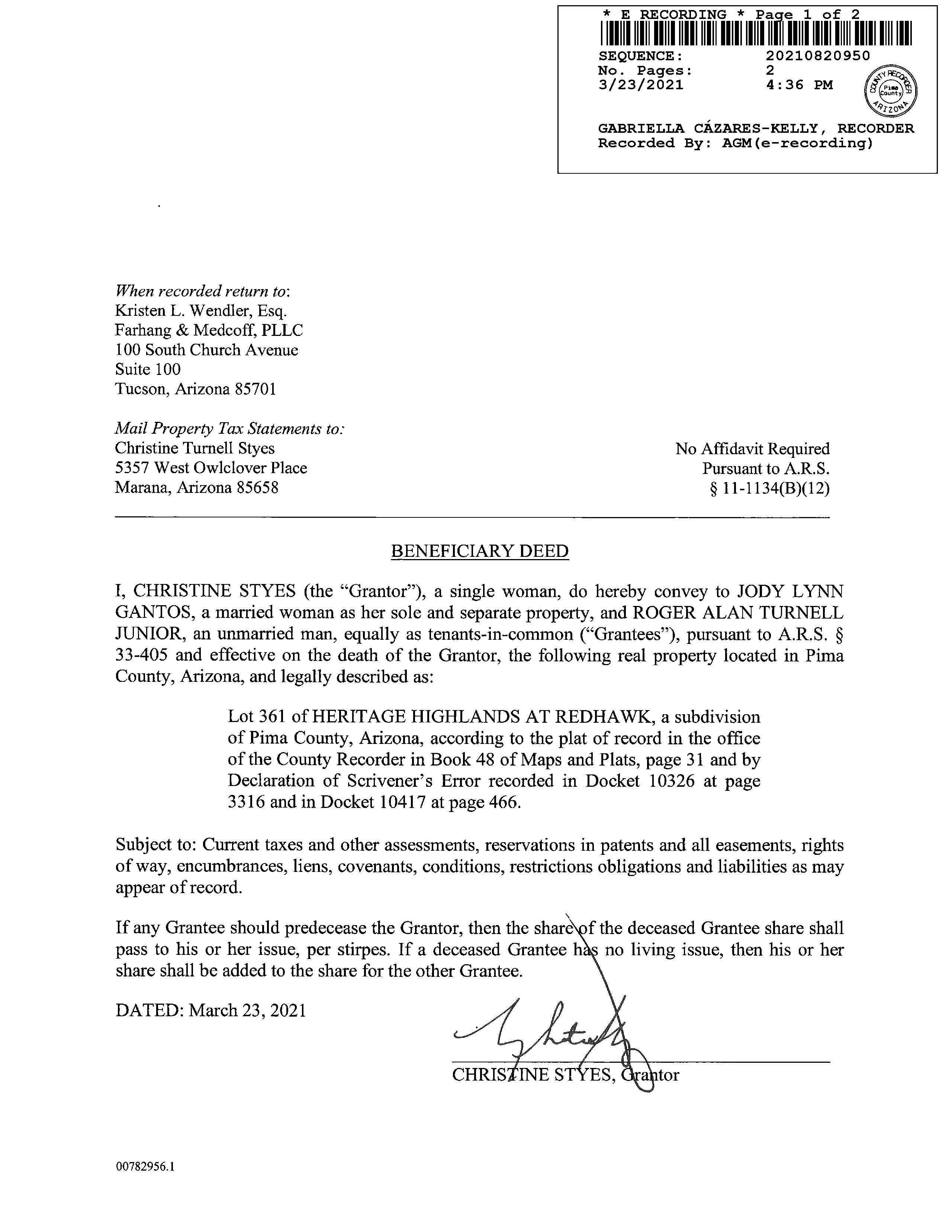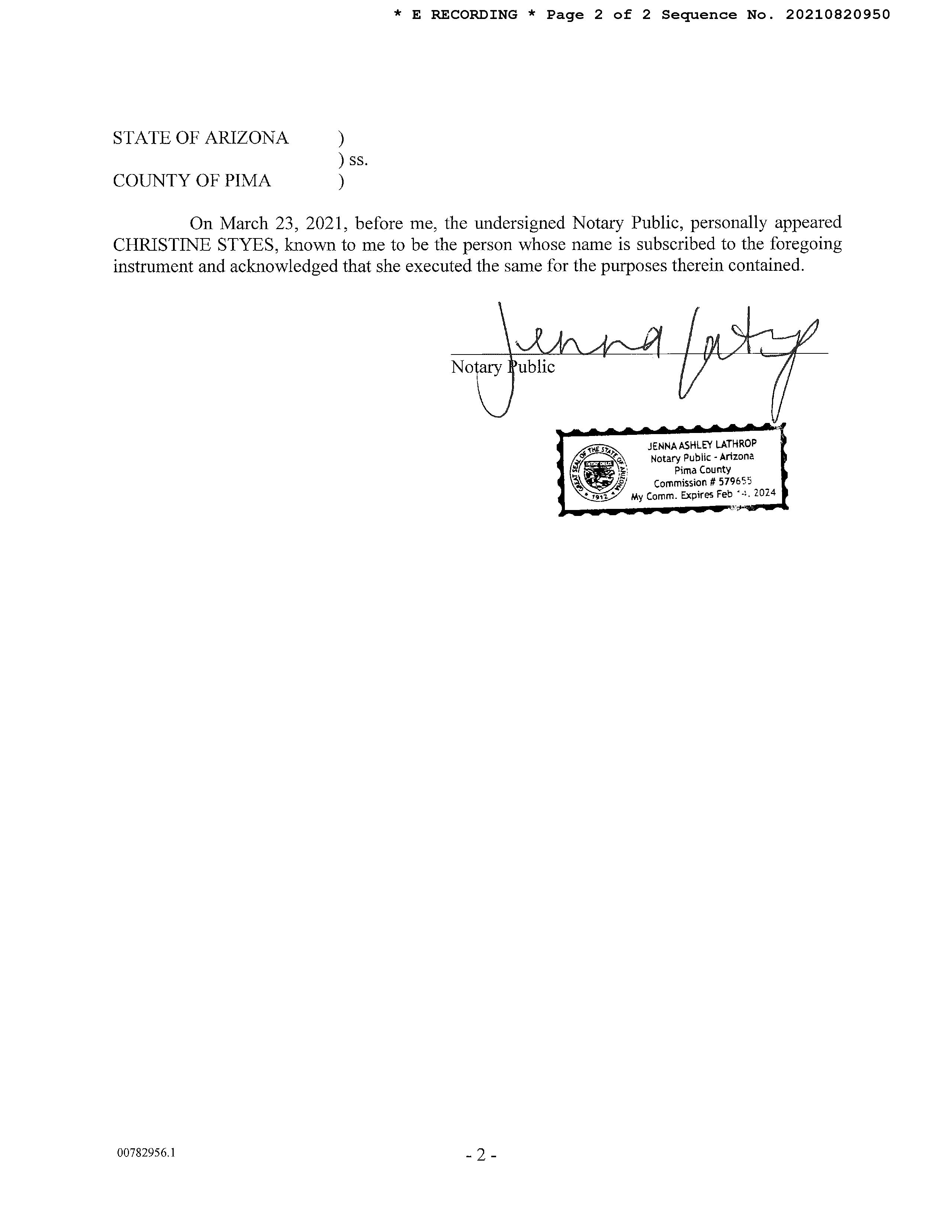 PIMA, AZ Document:DED BEN 2021.82.0950 Page:2 of 2 Printed on:3/15/2023 11:05 AM Branch :FC0 User :JSTI