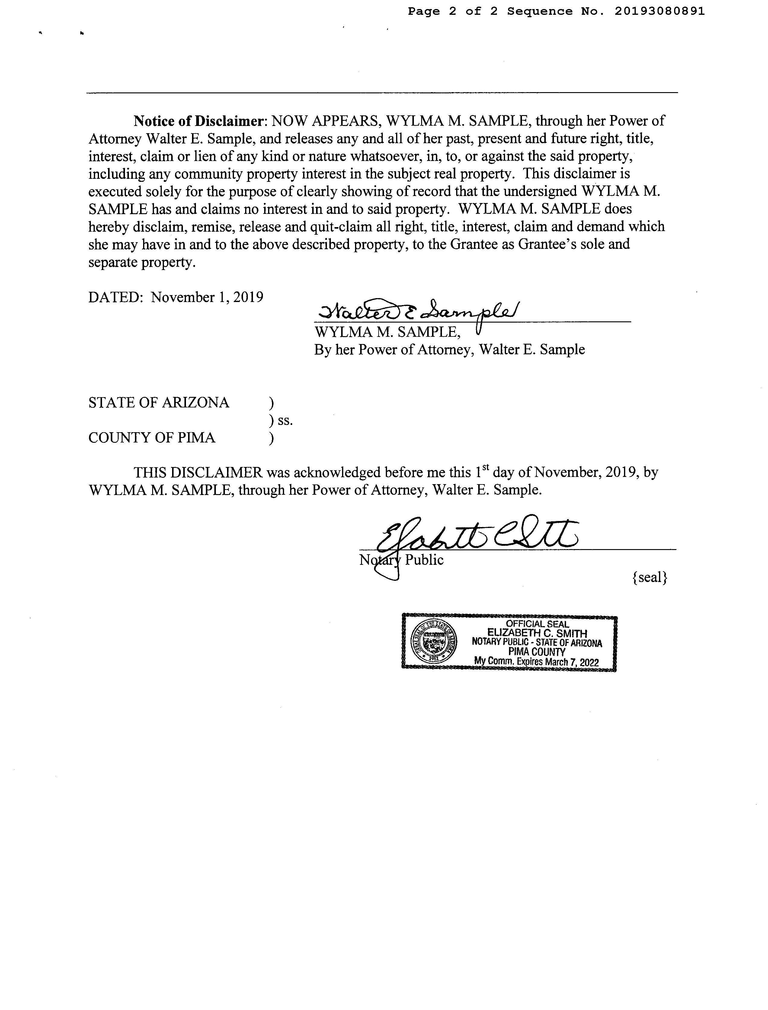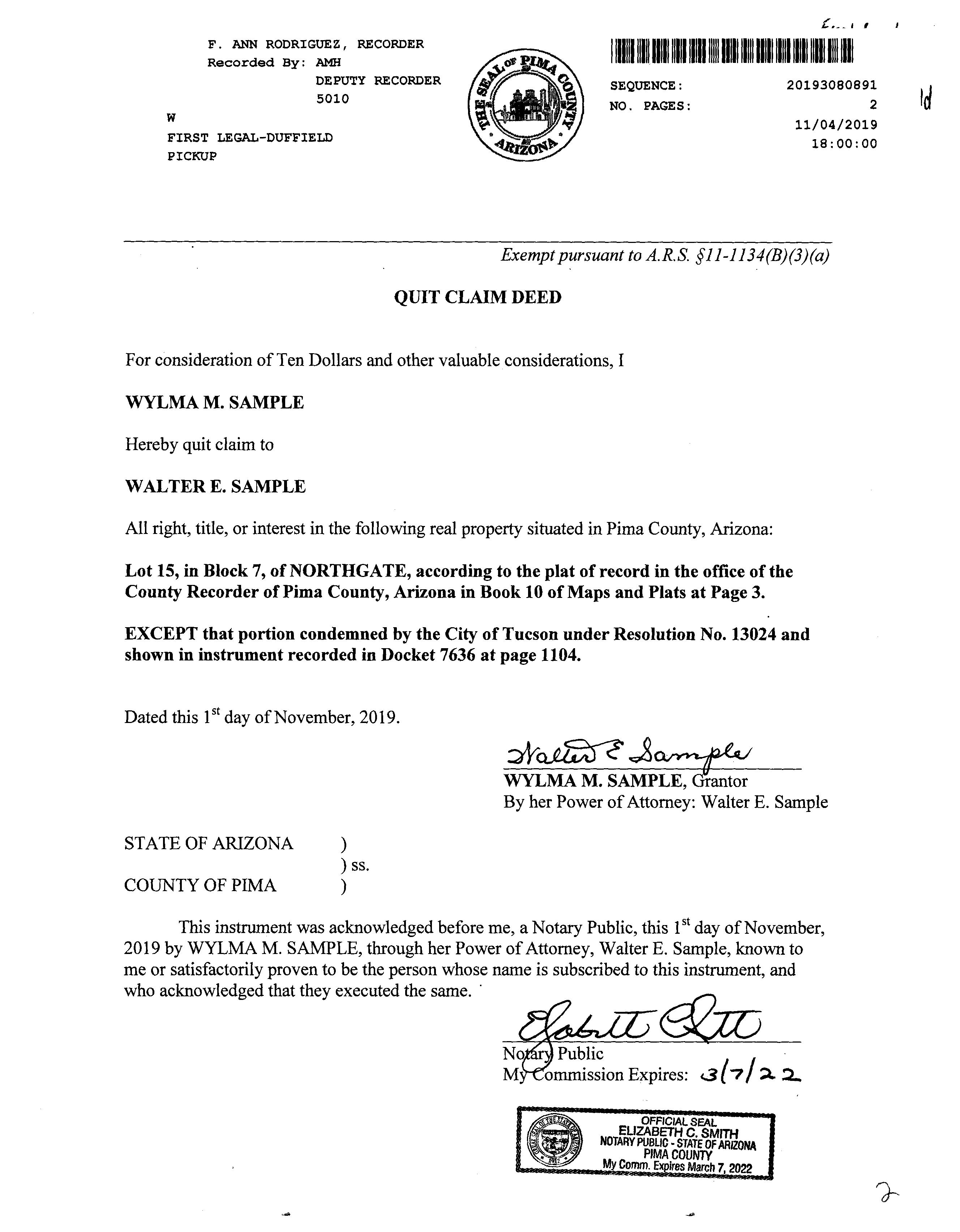 Recording/Sale Date : 11/04/2019 / 11/01/2019 Deed Type : Quit Claim Deed Document # : 3080894