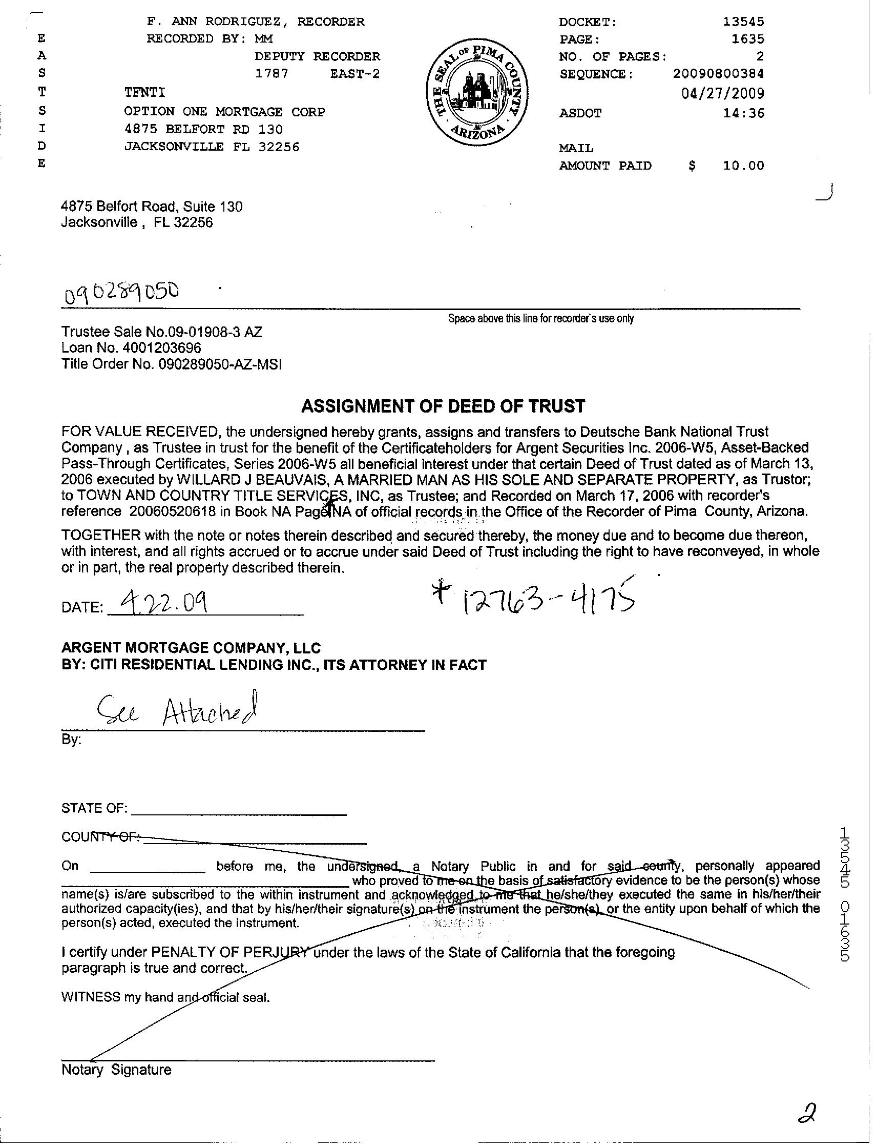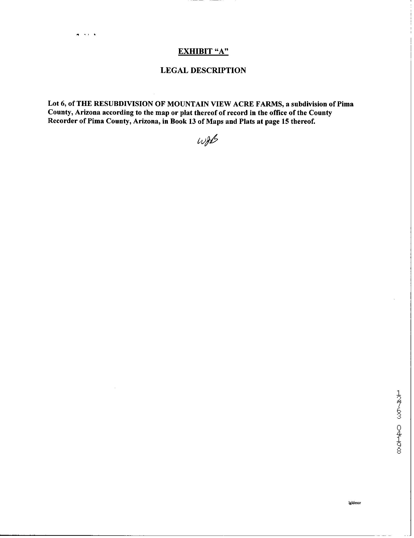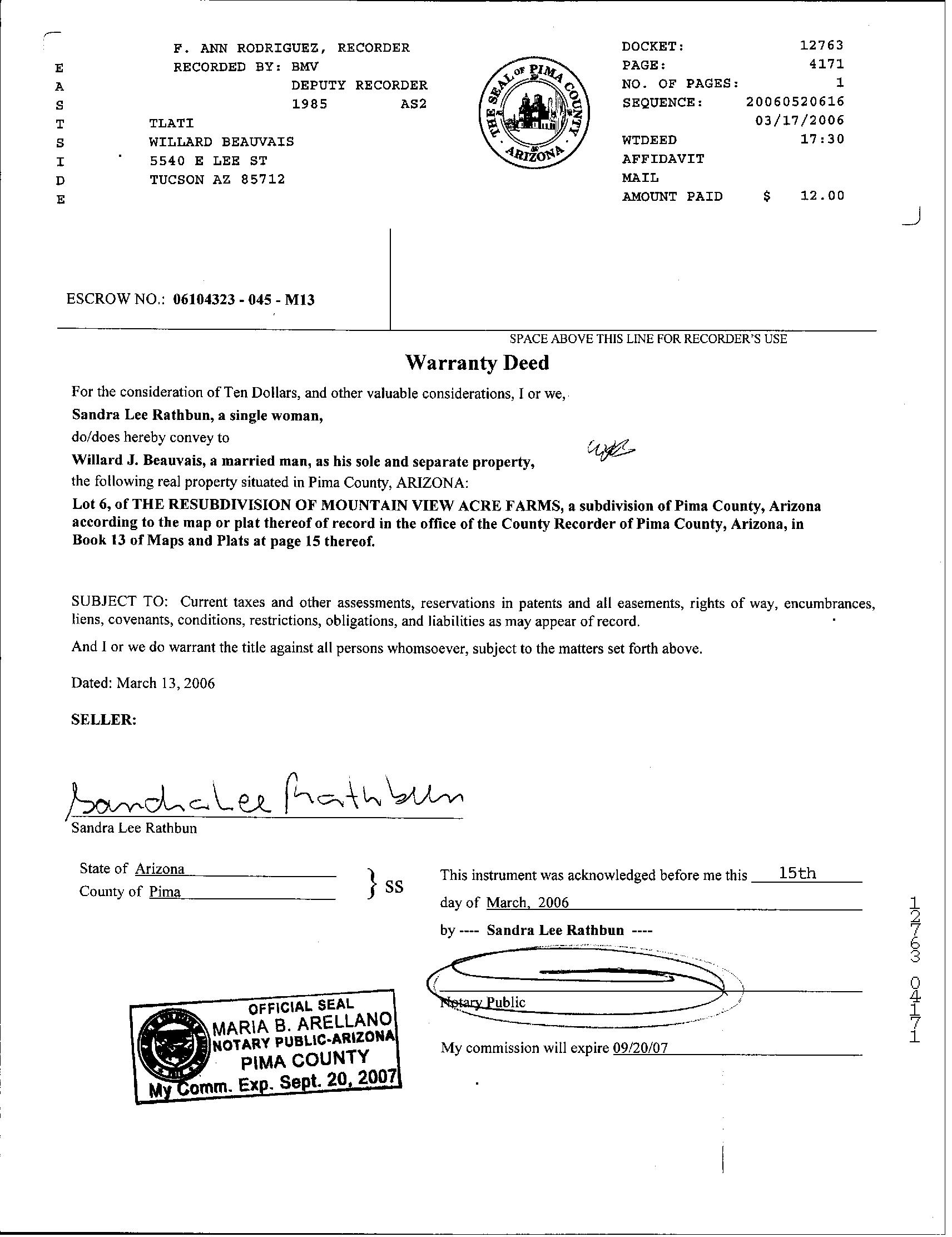+ FIRST AMERICAN TITLE, FC0, LMRA PIMA, AZ 08/18/2022  03:55PM  RL13  INVESTIGATIVE SEARCH RESULTS PAGE 1 OF 1 SEARCH PARAMETERS PARCEL:  121-06-2920 PARCEL: 121-06-2920 INSTRUMENT REC DATE OWNER: BEAUVAIS WILLARD J     12763 4171 03/17/2006  SITUS: 5540 E LEE ST TUC  MAIL: 5540 E LEE  TUCSON AZ 85712-4206  PLAT: LOT 00006 BLOCK 0 LEGAL: MOUNTAIN VIEW ACRE FARMS RESUB LOT 6  CURRENT TAXES INFORMATION THROUGH 07/28/2022 LAND IMPR EXEMPT RATE AREA SPECIAL DISTRICTS PRIMARY  24,475  0  0  11.6619  0150 SECONDARY  50  27,962  0  2.8778  2021 TOTAL TAX BILLED 3,149.84 2021  TAX AMT TAX DUE INTEREST DATE PAID TOTAL DUE FIRST HALF  1,574.92  0.00  0.00  10/23/2021  0.00  SECOND HALF  1,574.92  0.00  0.00  05/28/2022  0.00  TOTAL CURRENT TAXES DUE 08/22 0.00 09/22 0.00 IMPROVEMENTS RESIDENTIAL  BLDG SQFT  2,251 FULL CASH VALUE  280,121 YEAR BUILT  2005 LAND USE  01 31 NUMBER OF STORIES  1.0 LOT SIZE  1 STDLT STORIES HEIGHT  0 SCHOOL DISTRICT  0150 EXTERIOR WALLS  ADOBE LAND FULL CASH VALUE  502 GRADE MATERIALS IMPR FULL CASH VALUE  279,619 SALES SALE DATE SALE AMOUNT INSTRUMENT TYPE SELLER NAME VALIDITY 03/17/2006 375,000    12763 4171 WD RATHBUN SANDRA L 04/23/2004 135,000    12287 3381 WD SCHNAUFER MARK E 07/27/2001 118,500    11600 2019 WD CHINNOCK KEVIN J 02/29/1996 80,000    10241 3502 WD EDMUNDS MARIE ADDITIONAL PROPERTY INFORMATION STANDARD LAND USE: SFR END SEARCH