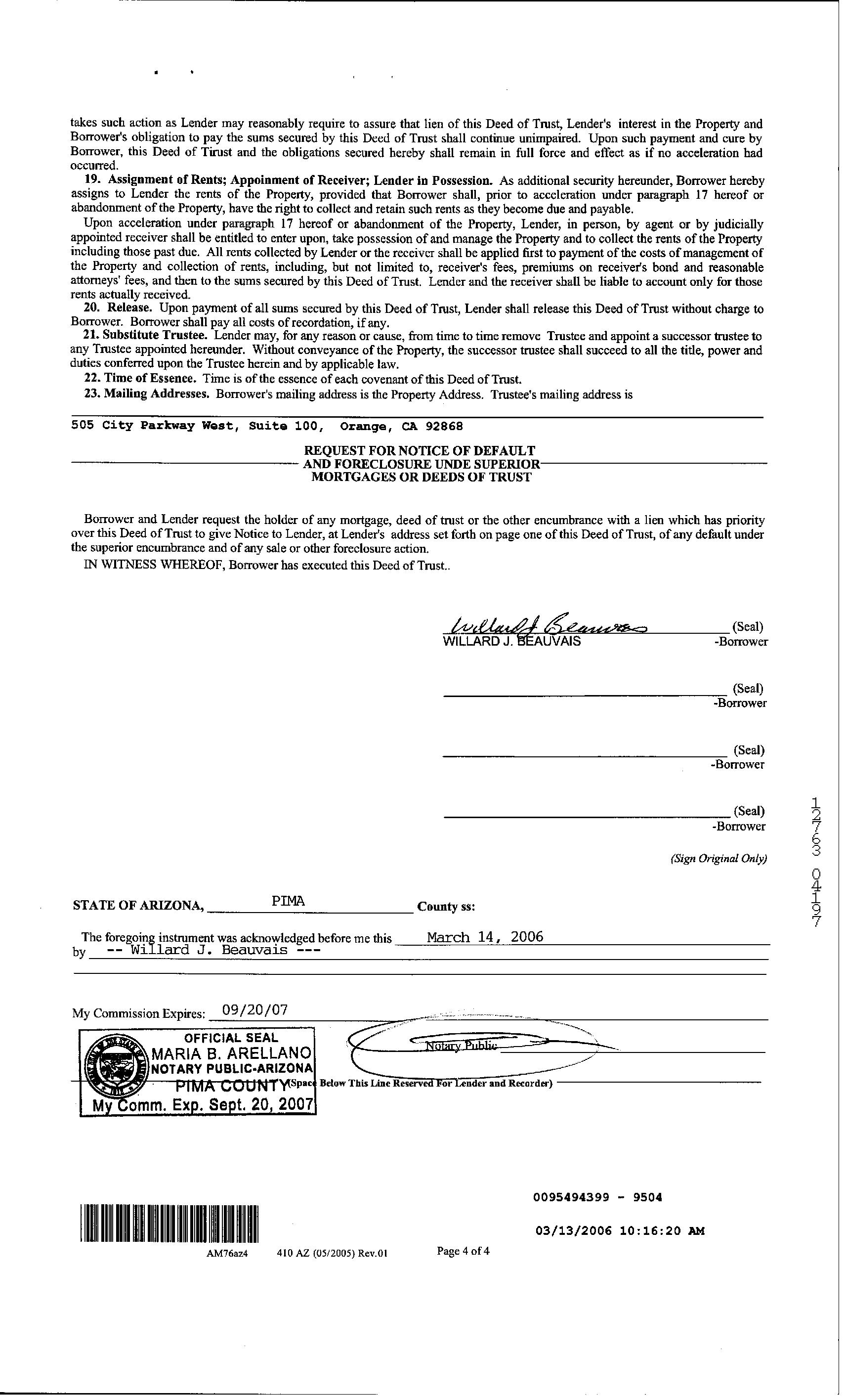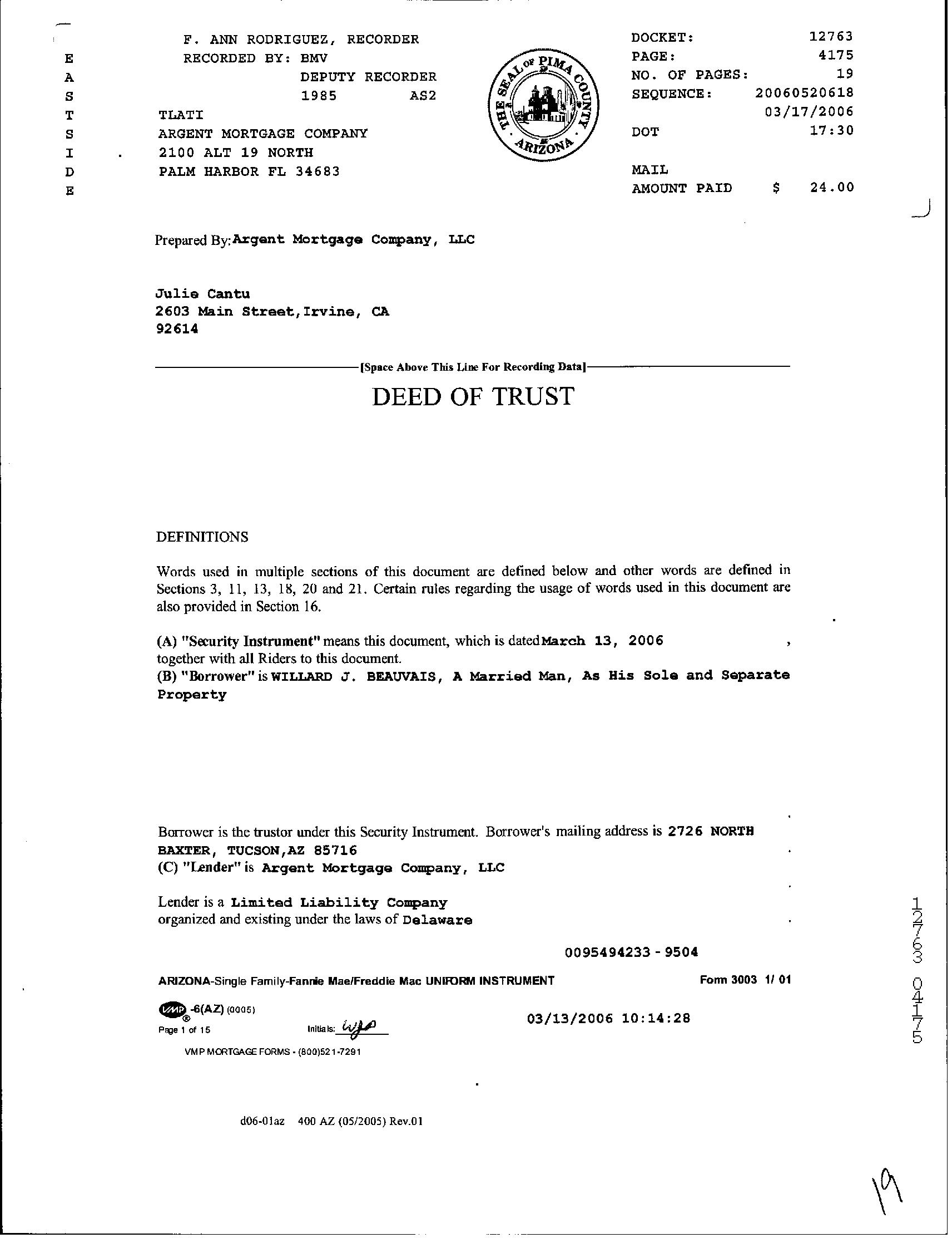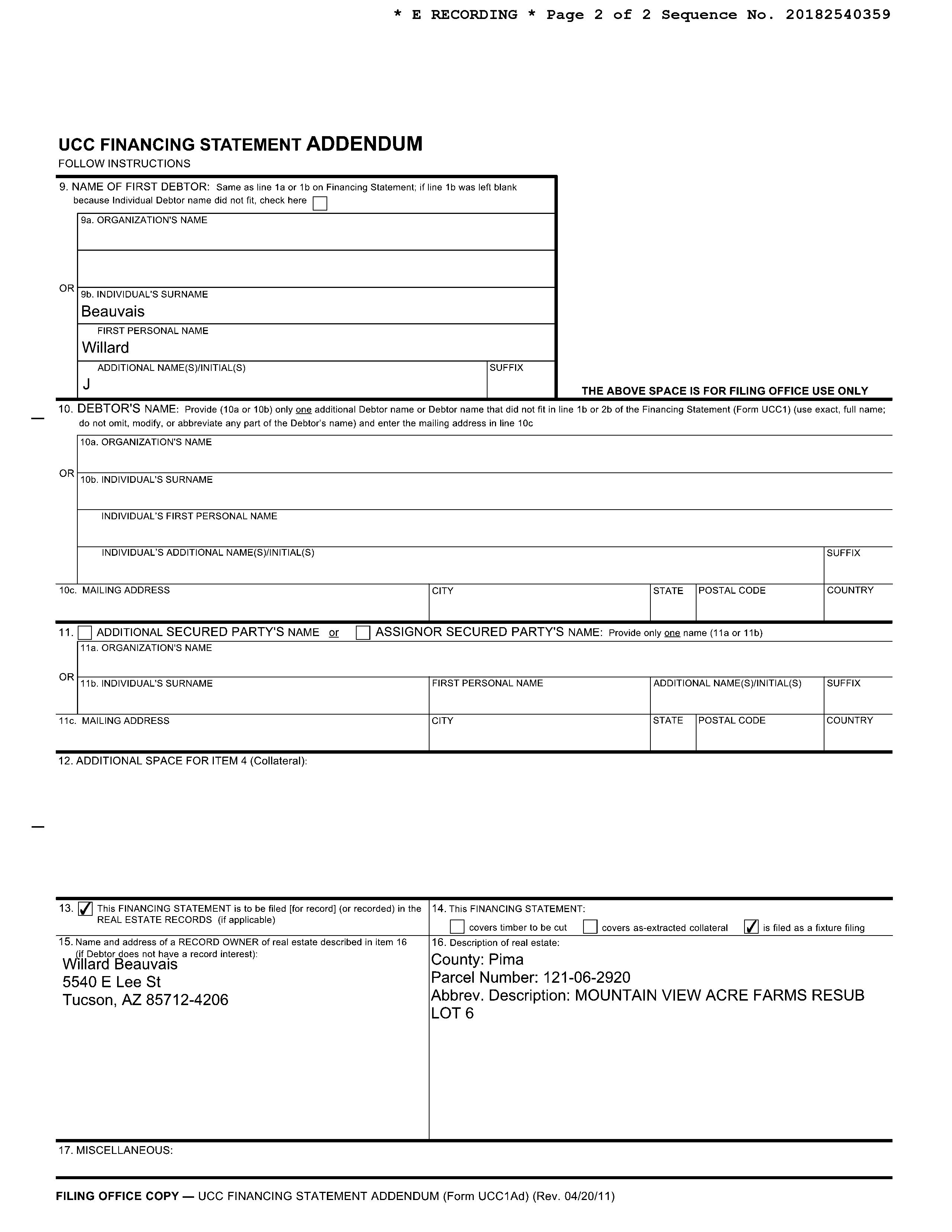Subject Property :   5540 E Lee St Tucson AZ 85712 Owner Information Owner Name : Beauvais Willard J Mailing Address : 5540 E Lee St, Tucson AZ 85712-4206 C013 Vesting Codes : Married Man / / Separate Property Owner OccupiedIndicator : O Location Information Legal Description : Mountain View Acre Farms Resub Lot 6 County : Pima, Az APN : 121-06-2920 Census Tract / Block : 30.02 / 1 Subdivision : Mountain View Acre Farms Resub Township-Range- Sect : 14S-14E-1 Map Reference : 01-14S-14E Legal Book/Page : 13-15 School District : Tucson Unified Legal Lot : 6 Munic/Township : Tucson Unified Market Area : 50 Last Market Sale Information Recording/Sale Date : 03/17/2006 / 12/00/2005 1st Mtg Int. Rate/Type : 7.35% / Adjustable Int Rate Loan Sale Price : $375,000 1st Mtg Document # : 12763-4175 Document # : 12763-4171 1st Mtg Term : 30 Deed Type : Warranty Deed Price Per SqFt : $166.59 1st Mtg Amount/Type : $300,000 / Cnv 2nd Mtg Amount/Type : $75,000 / Conv Title Company : Lawyers Title Lender : Argent Mtg Co Llc Seller Name : Rathbun Sandra L Prior Sale Information Prior Rec/Sale Date : 04/23/2004 / 04/00/2004 Prior Lender : American Hm Mtg Prior Sale Price : $135,000 Prior 1st Mtg Amt/Type : $121,500 / Conv Prior Doc Number : 12287-3381 Prior 1st Mtg Rate/Type : / Fixed Rate Loan Prior Deed Type : Warranty Deed Customer Name : Lisa Mrazek Customer Company Name : First American Title Insurance Company Prepared On : 08/18/2022 © 2022 CoreLogic. All rights reserved