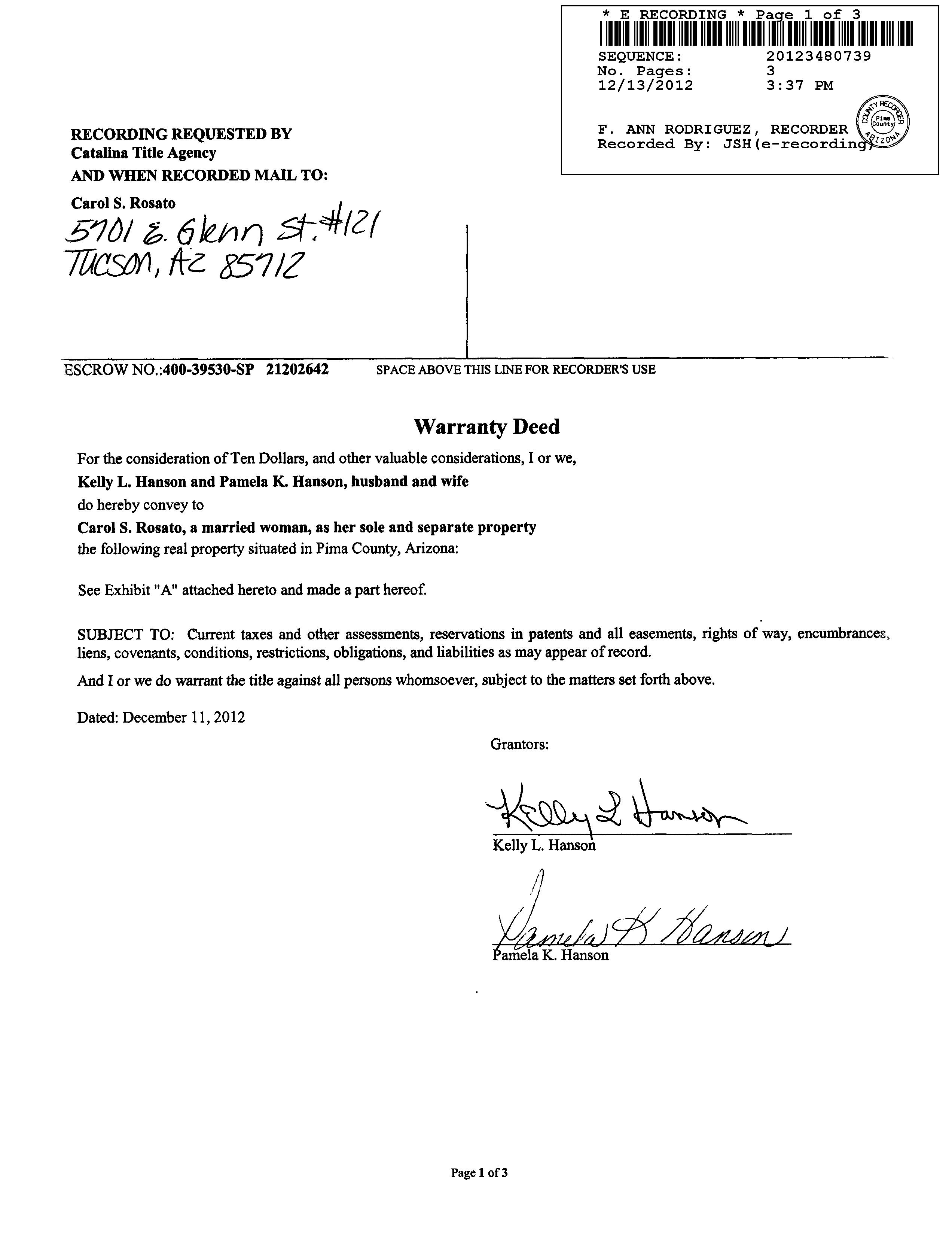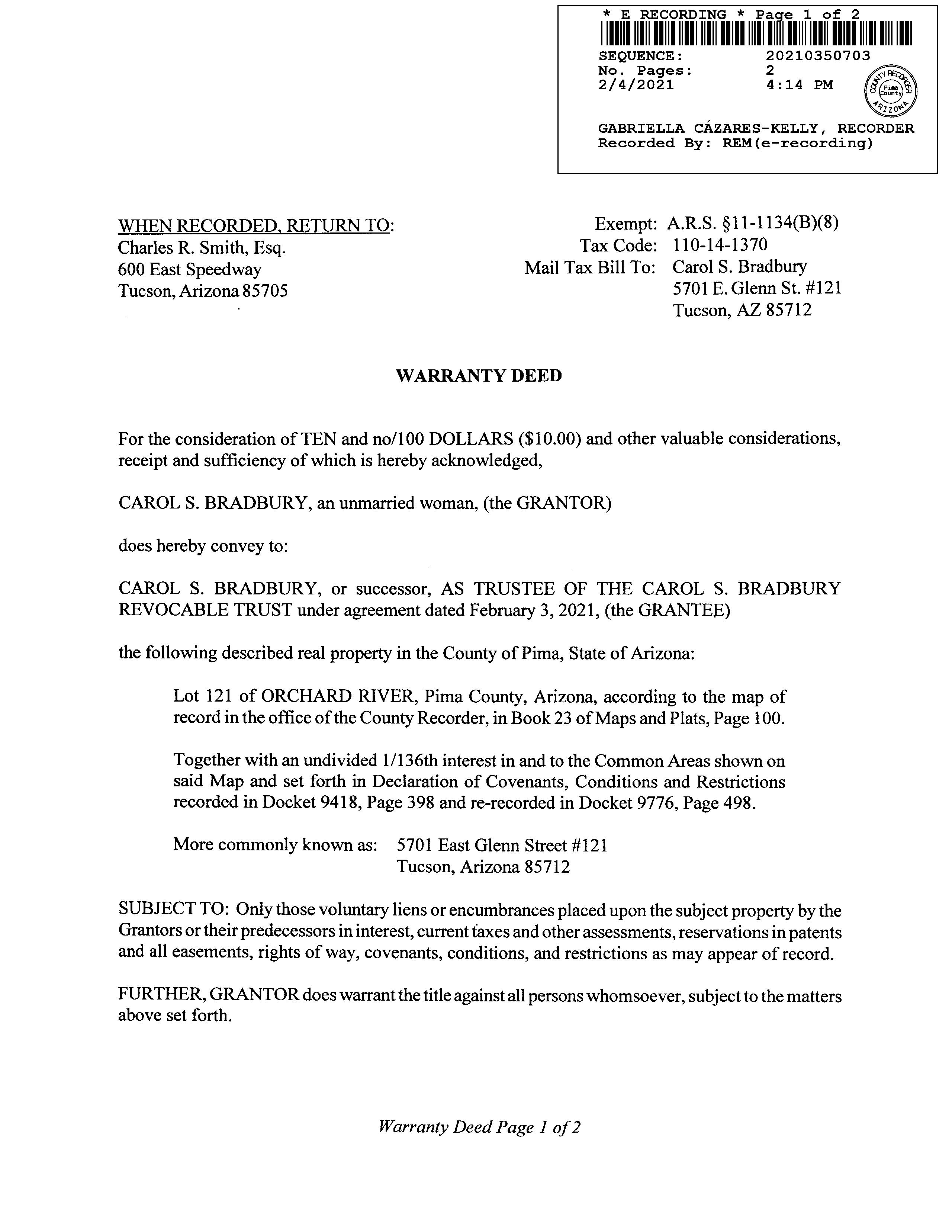 Carol S / APN / Alternate APN: 110-14-1370 / Deed Type: Warranty Deed Land Use: Condominium Subdivision / Tract: Orchard River / Lot Size: 2,562 Year Built / Eff: 1973 / Rec. Date / Price: 12/13/2012 / $81,000 Living Area: 1,284 # of units: Document #: 3480739 Bedrooms: Pool: Total Tax Value: $121,919 Bath(F/H): / #1 5701 E Glenn St # 129 Tucson Az 85712 Owner Name: