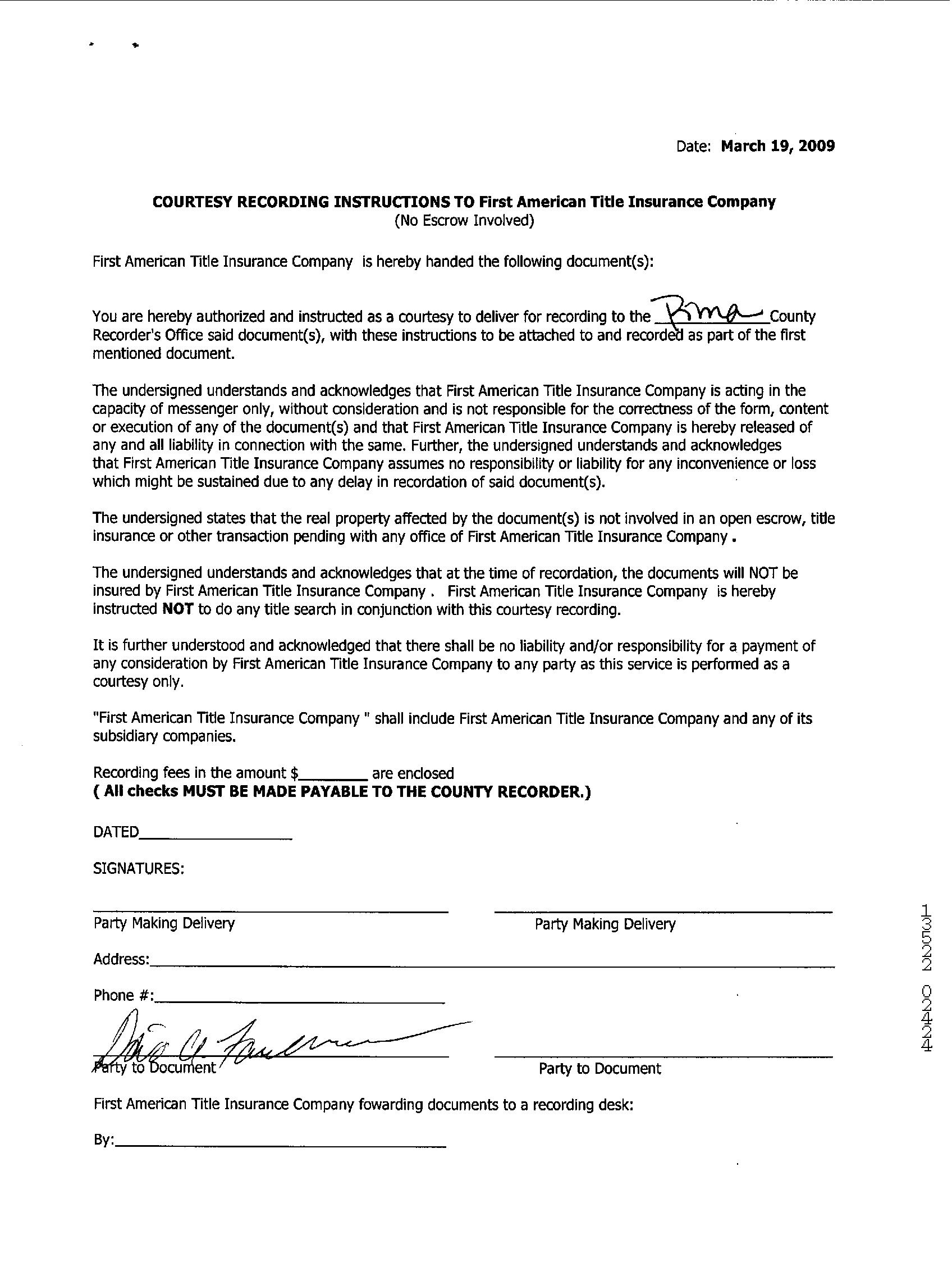This report is not an insured product or service or a representation of the condition of title to real property. It is not an abst ract, legal opinion, opinion of title, title insurance commitment or preliminary report, or any form of Title Insurance or Guaranty. This report is issued exclusively for the benefit of the Applicant therefor and may not be used or relied upon by any other person. This report may not be reproduced in any manner without First American or Title Security's prior written consent. First American or Title Security does not represent or warrant that the information herein is complete or free from error, and the information herein is provided without any warranties of any kind, as-is, and with all faults. As a material part of the consideration given in exchange for the issuance of this report, recipient agrees that First American or Title Security's sole liability for any loss or damage caused by an error or omission due to inaccurate information or negligence in preparing this report shall be limited to the fee charged for the report. Recipient accepts this report with this limitation and agrees that First American or Title Security would not have issued this report but for the limitation of liability described above. First American or Title Security makes no representation or warranty as to the legality or propriety of recipient's use of the information herein.