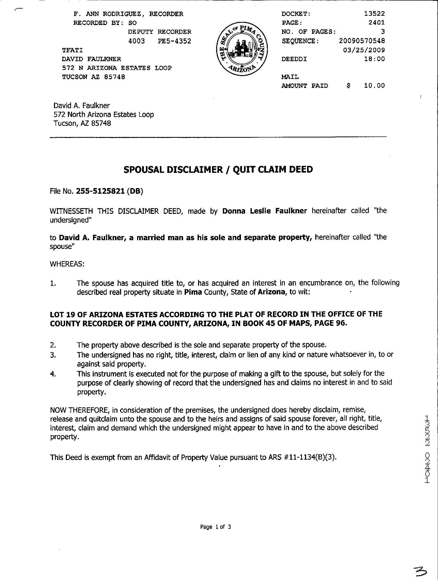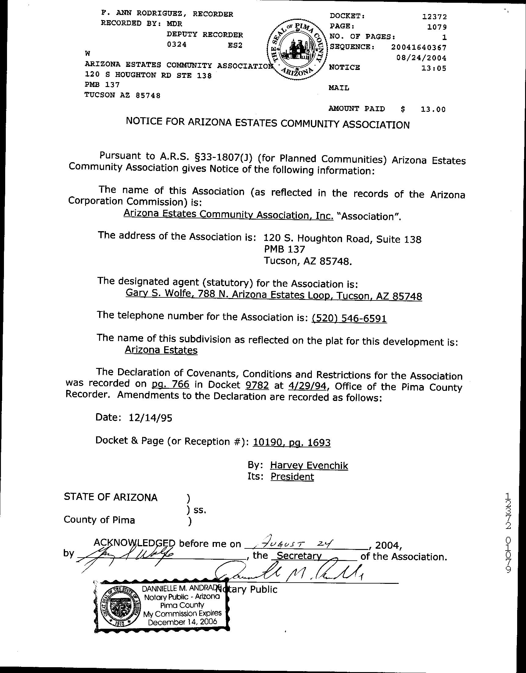 Owner Name : Ellwein Bruce D Subdivision : Arizona Estates