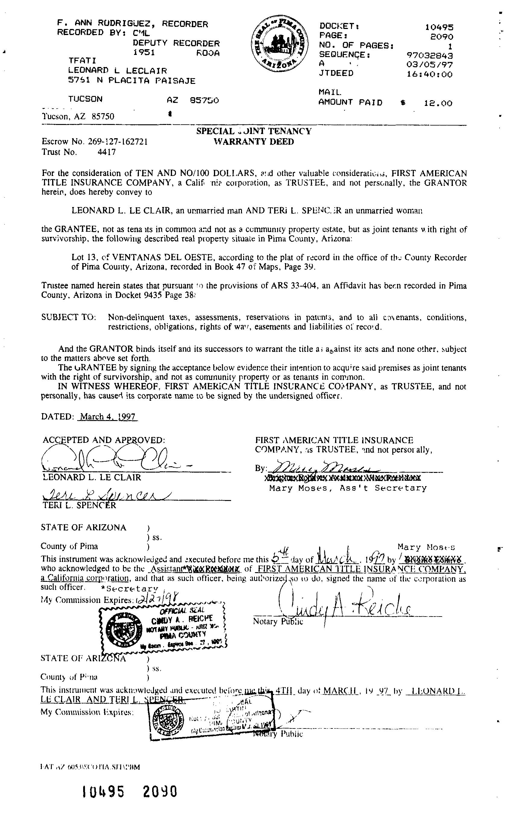 Title Company : Stewart Title & Tr/tucson
