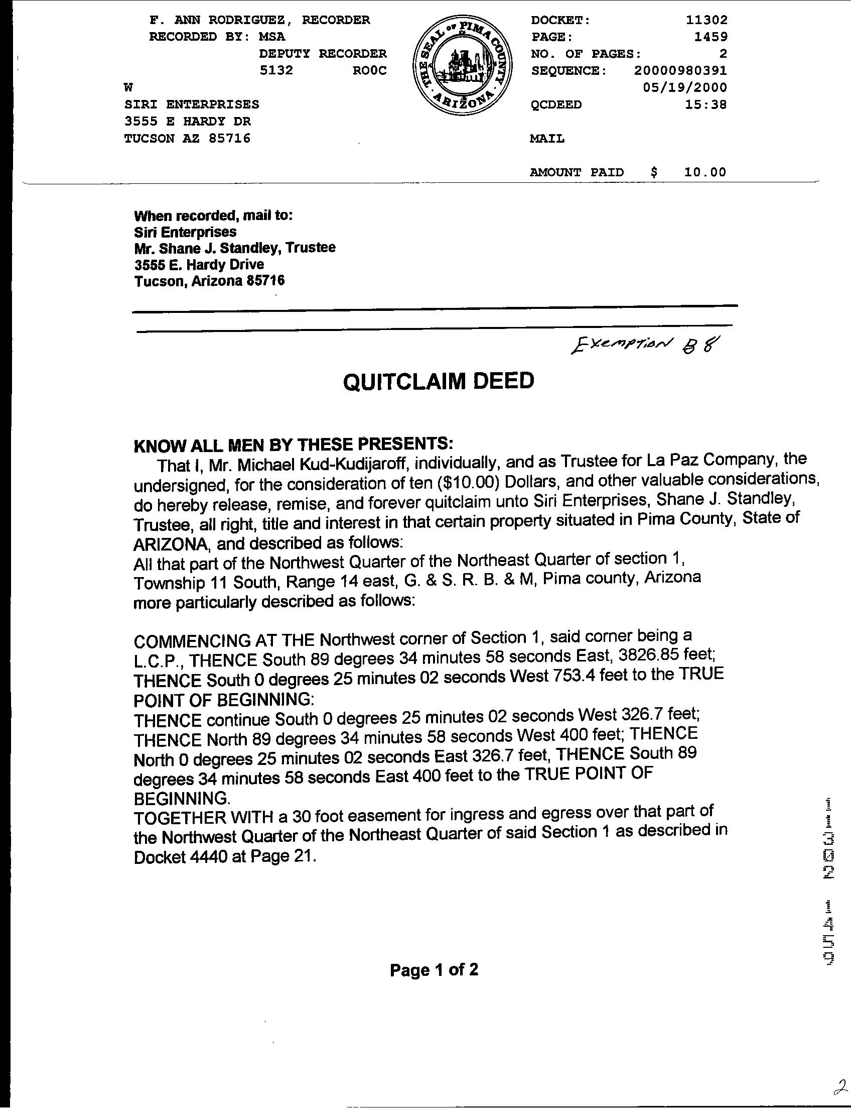 Mailing Address : 3555 E Hardy Dr, Tucson AZ 85716-1406 C011