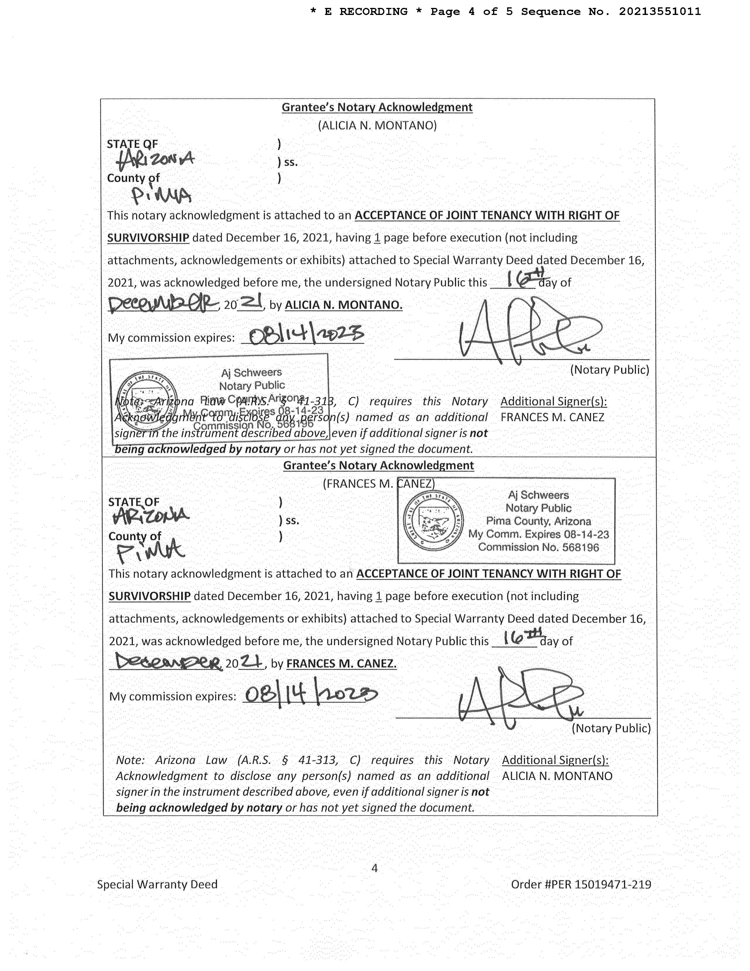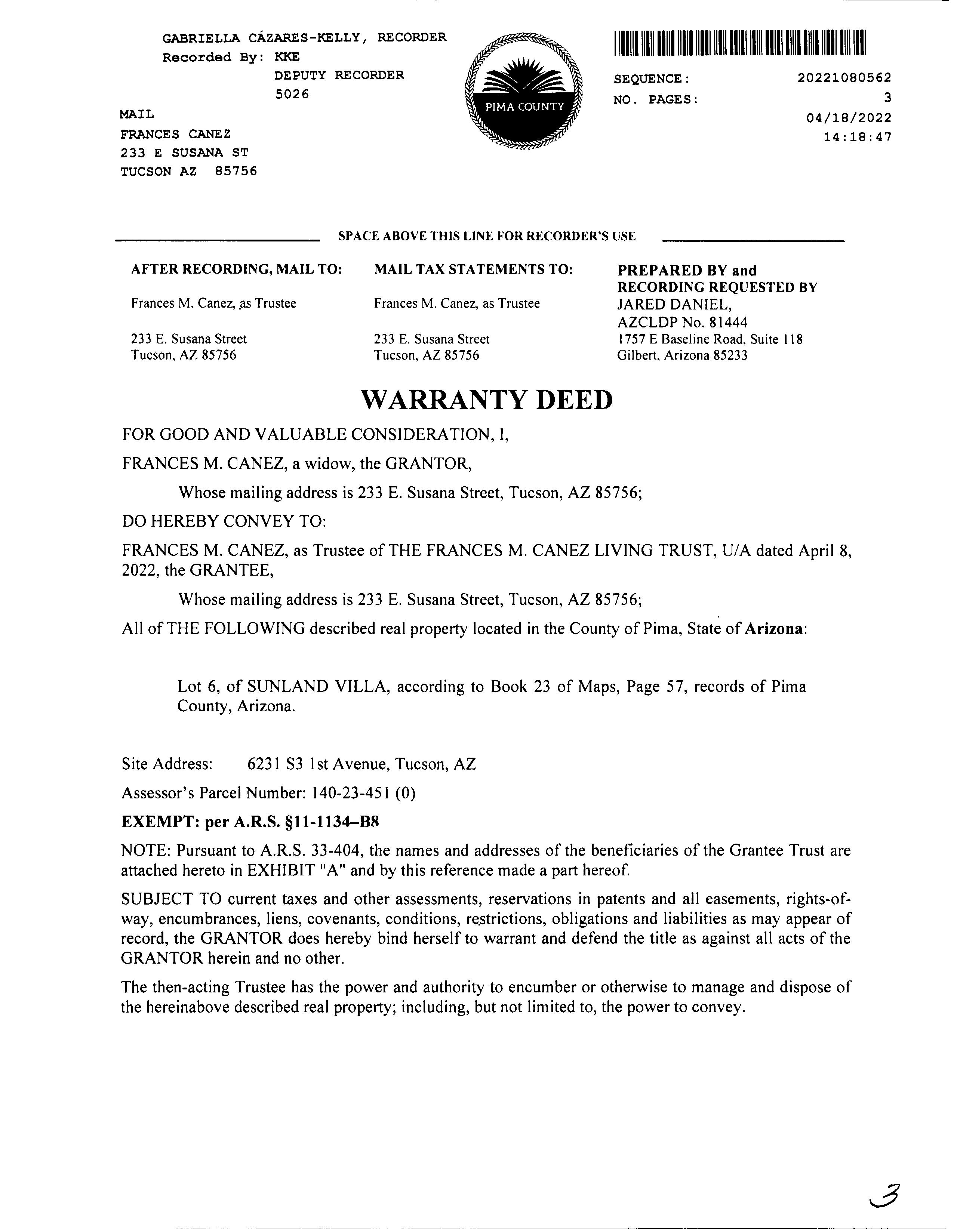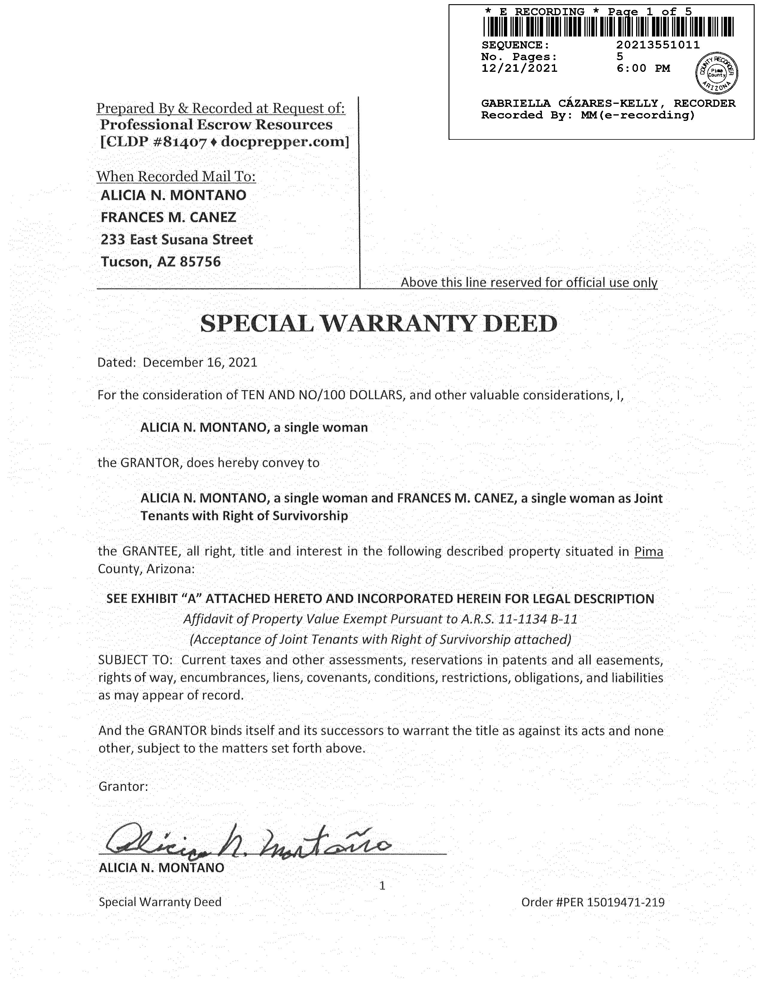 Subject Property: 6231 S 1st Ave Tucson Az 85706 Owner Name: Montano Alicia N /Canez Frances M