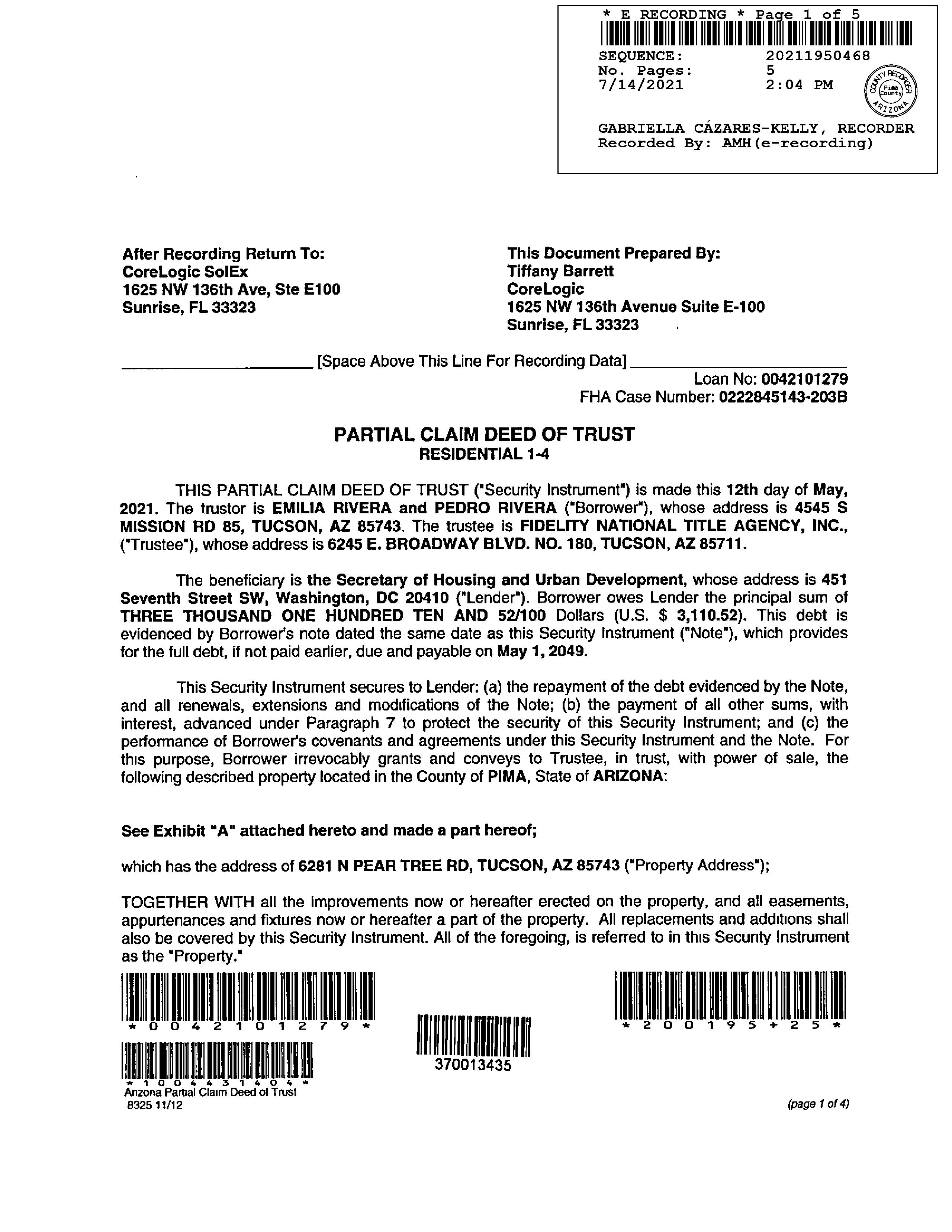 Subject Property: 6281 N Pear Tree Rd Tucson Az 85743 Owner Name: Rivera Emilia /Rivera Pedro APN / Alternate APN: 213-13-038H / Deed Type: Warranty Deed Land Use: Mobile Home Subdivision / Tract: / Lot Size: 48,787 Year Built / Eff: 1998 /1998 Rec. Date / Price: 04/17/2019 / $100,000 Living Area: # of units: Document #: 1070864 Bedrooms: Pool: Total Tax Value: $38,669 Bath(F/H): / #1 11858 W Raining Stars Ln Tucson Az 85743 Owner Name: Mc Bee Karen / APN / Alternate APN: 213-13-034G / Deed Type: Warranty Deed Land Use: Mobile Home Subdivision / Tract: / Lot Size: 38,768 Year Built / Eff: 1991 /1991 Rec. Date / Price: 09/08/2022 / $258,000 Living Area: # of units: Document #: 2510393 Bedrooms: Pool: Total Tax Value: $23,567 Bath(F/H): / #2 11838 W Raining Stars Ln Tucson Az 85743 Owner Name: