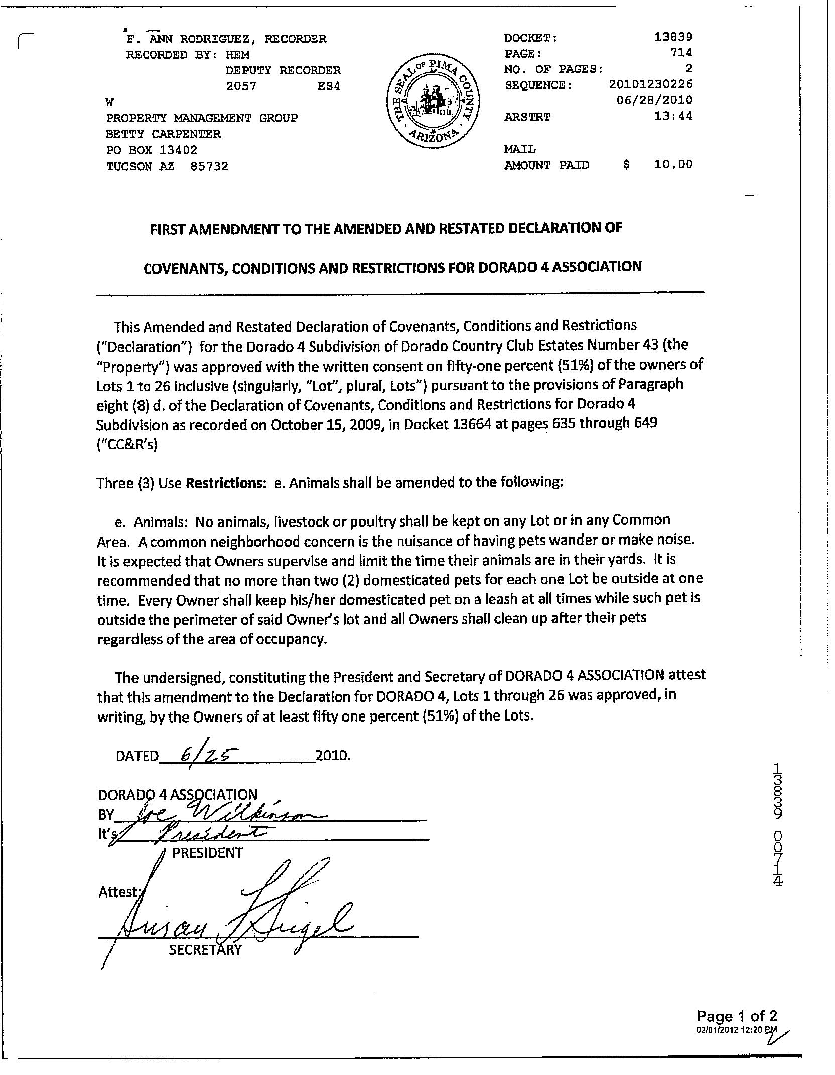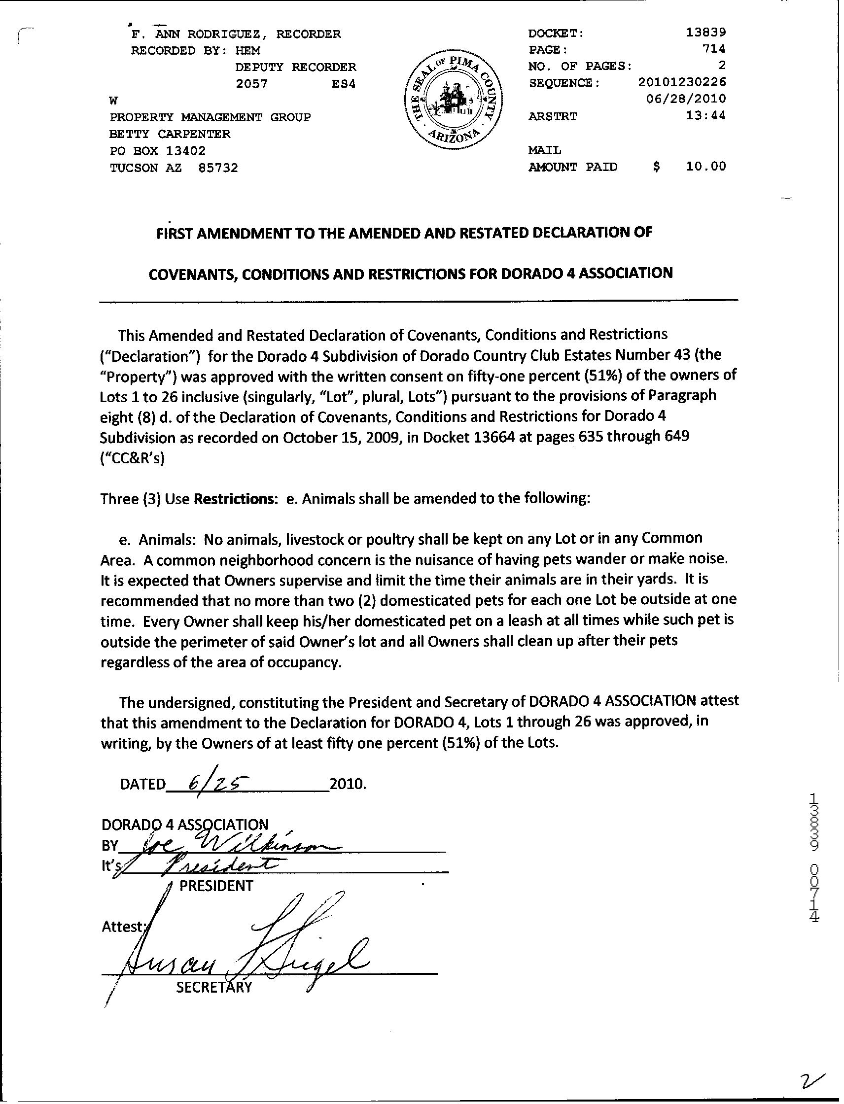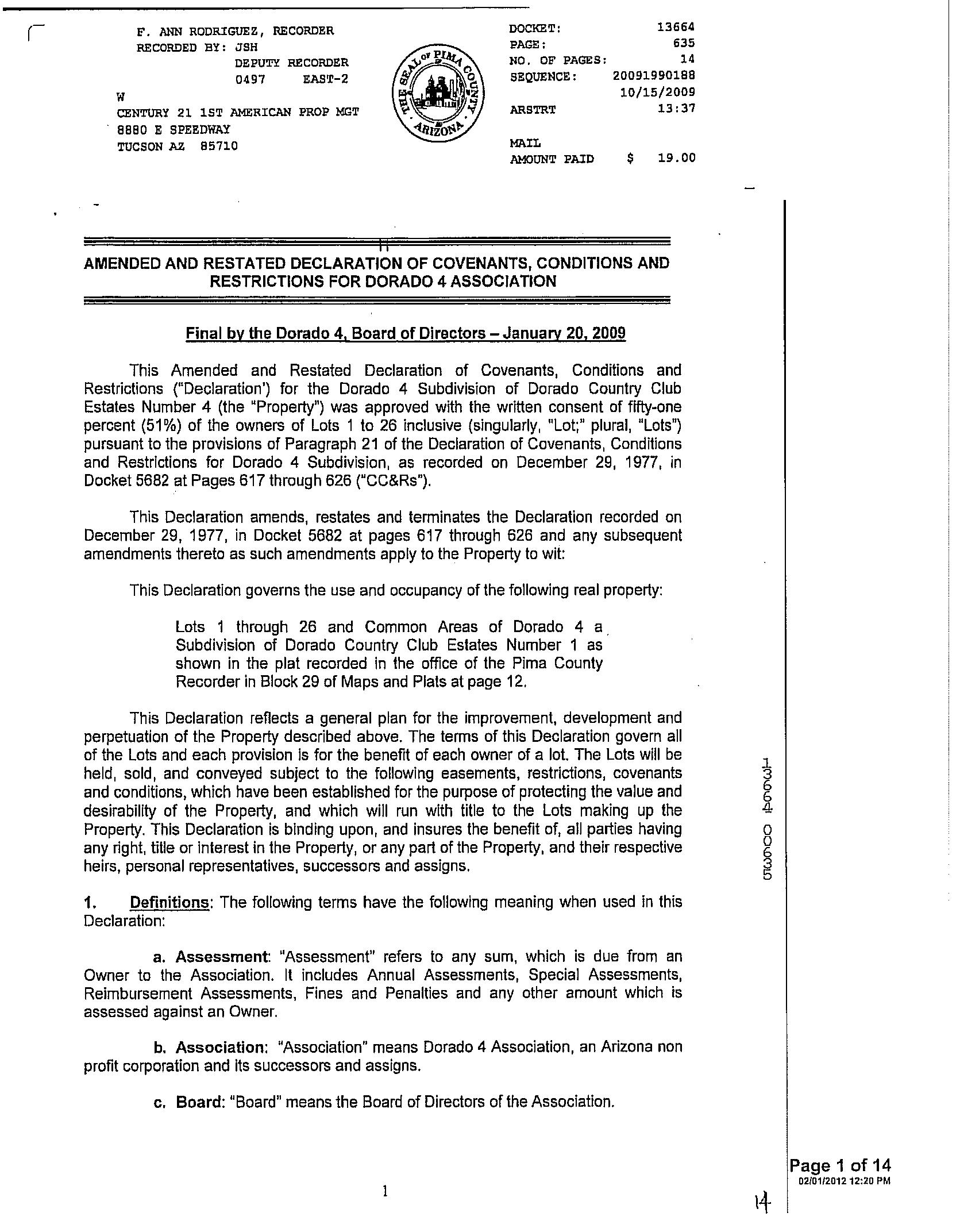 ©2021 First American Financial Corporation and/or its affiliates. All rights reserved. NYSE: FAF 05252610821 COVENANTS, CONDITIONS & RESTRICTIONS PREPARED FOR : First American Title Insurance Company, and the operating divisions thereof, make no express or implied warranty respecting the information presented and assume no responsibility for errors or omissions. First American, the eagle logo, First American Title, and firstam.com are registered trademarks or trademarks of First American Financial Corporation and/or its affiliates. 6551 E. Dorado Blvd Tucson, AZ 85715