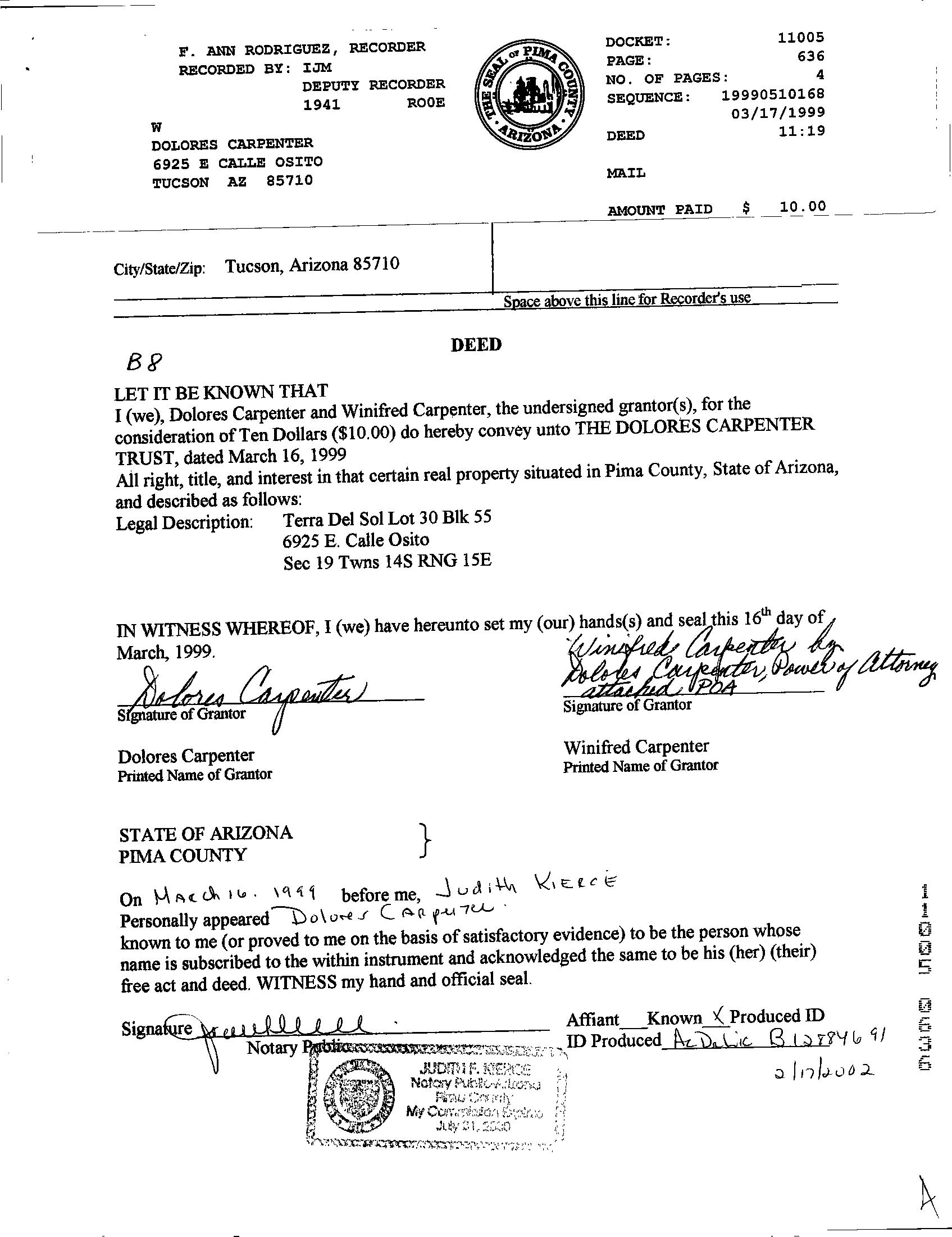 Mailing Address : 6925 E Calle Osito, Tucson AZ 85710-5453 C003