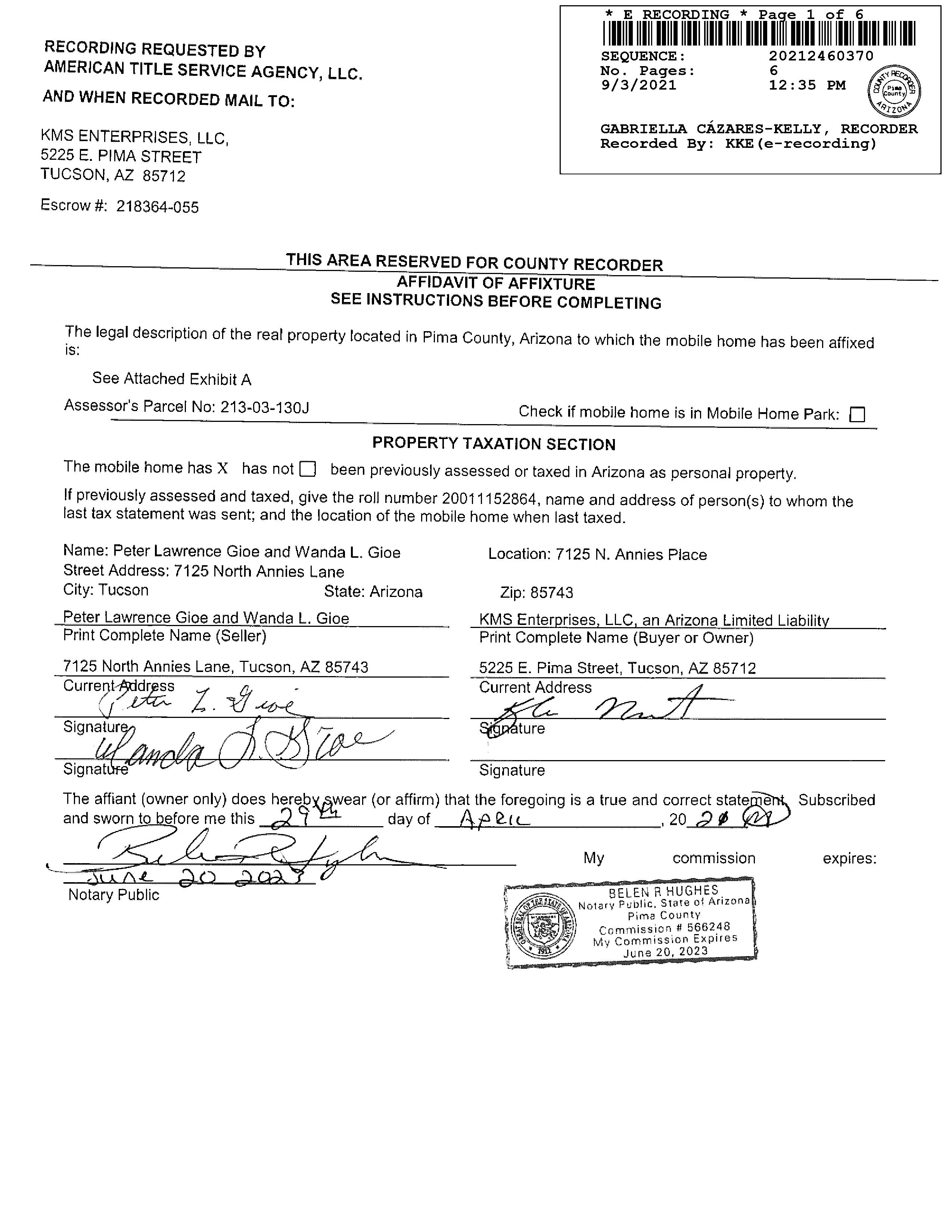 APN / Alternate APN: 213-03-120F / Deed Type: Joint Tenancy Deed Land Use: Mobile Home Subdivision / Tract: / Lot Size: 43,560 Year Built / Eff: 1997 /1997 Rec. Date / Price: 07/29/2022 / $309,000 Living Area: # of units: Document #: 2100846 Bedrooms: Pool: Total Tax Value: $100,178 Bath(F/H): / #7 7060 N Pelto Path Tucson Az 85743 Owner Name: Branum Cynthia / APN / Alternate APN: 213-03-138A / Deed Type: Warranty Deed Land Use: Mobile Home Subdivision / Tract: / Lot Size: 43,560 Year Built / Eff: 1994 /1994 Rec. Date / Price: 01/31/2023