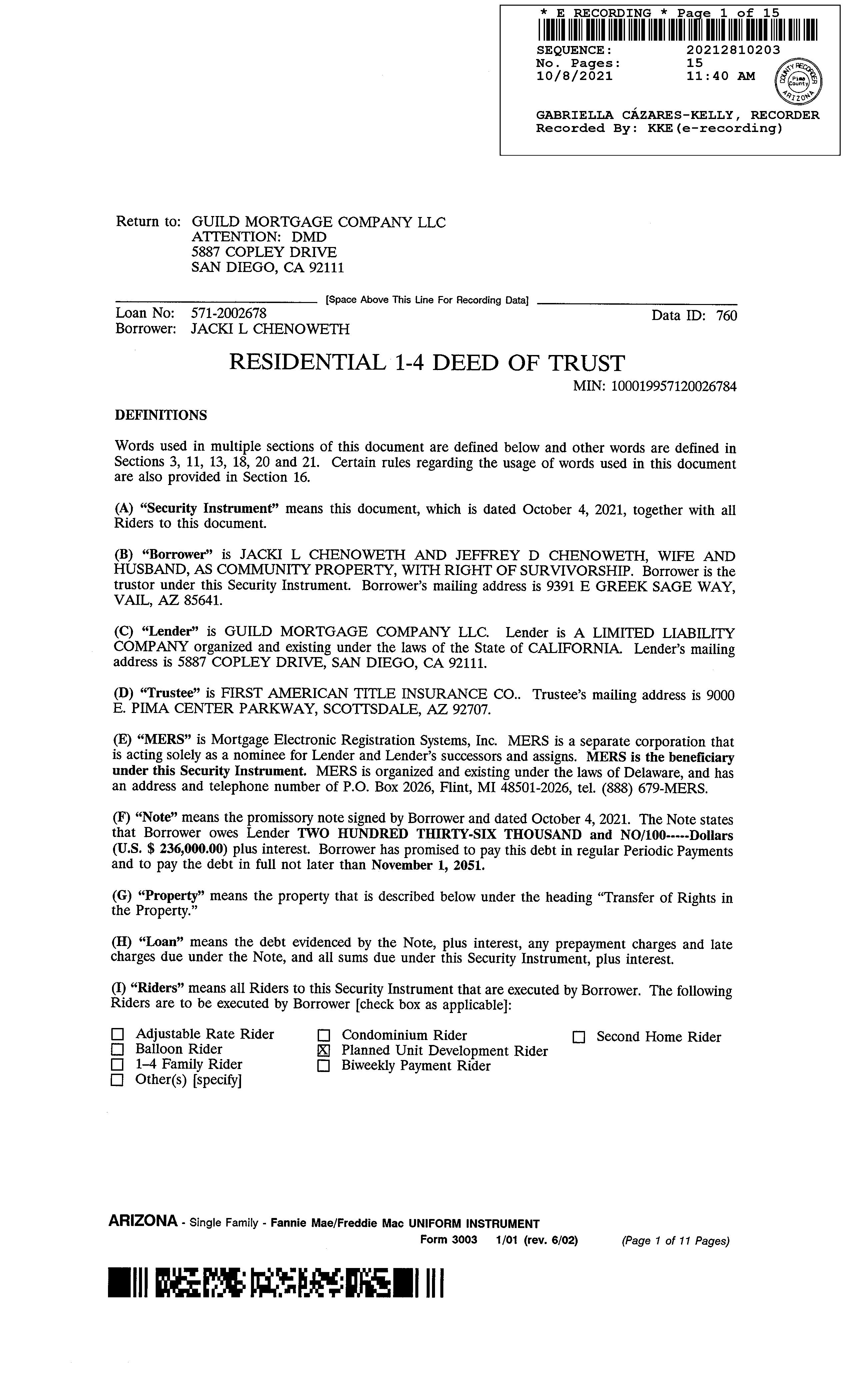Owner Name: Chenoweth Jacki L /Chenoweth Jeffery D APN / Alternate APN: 305-67-1370 / Deed Type: Warranty Deed Land Use: 163 Subdivision / Tract: Sycamore Canyon / Lot Size: 7,602 Year Built / Eff: 2007 / Rec. Date / Price: 06/15/2017 / $187,000 Living Area: 1,756 # of units: