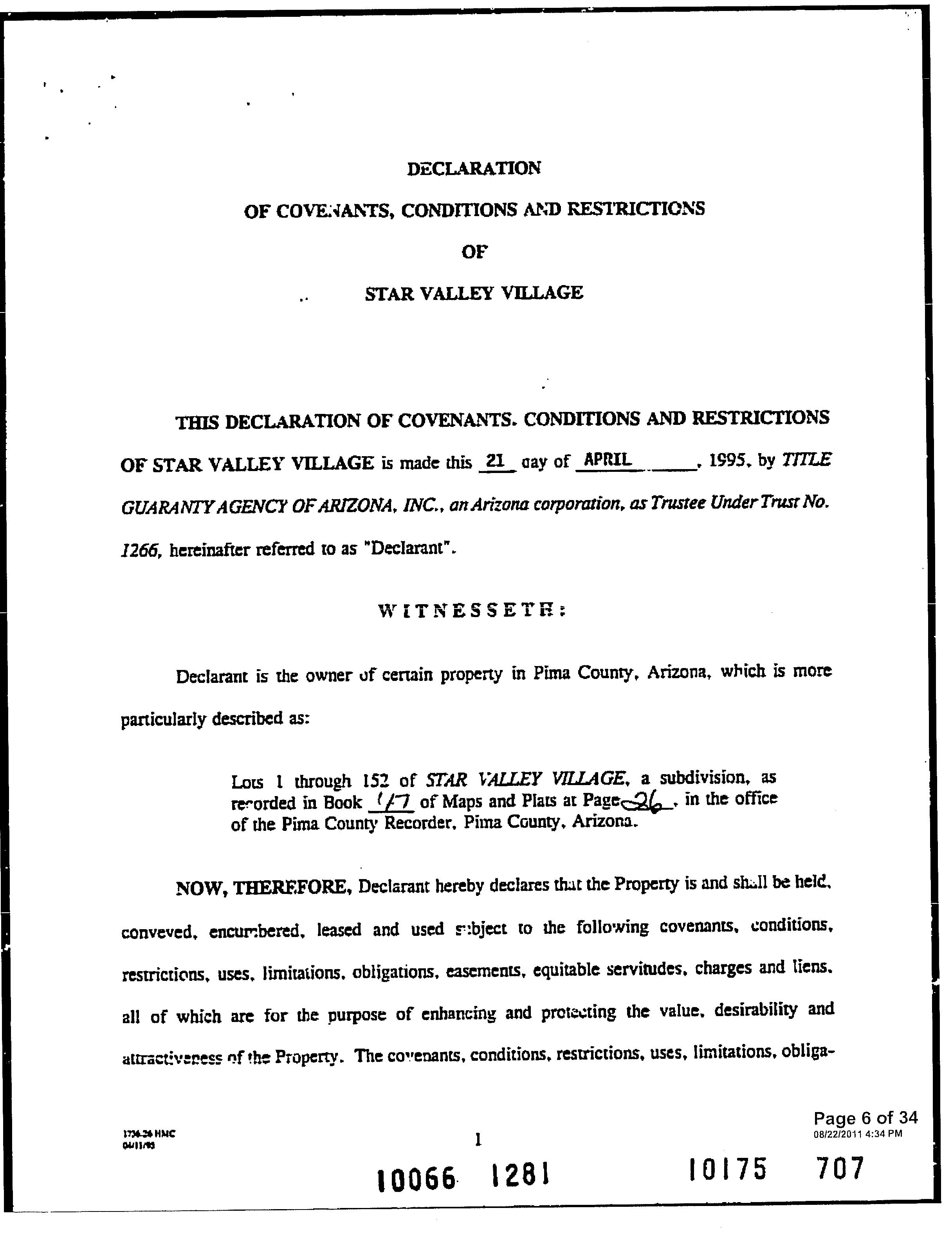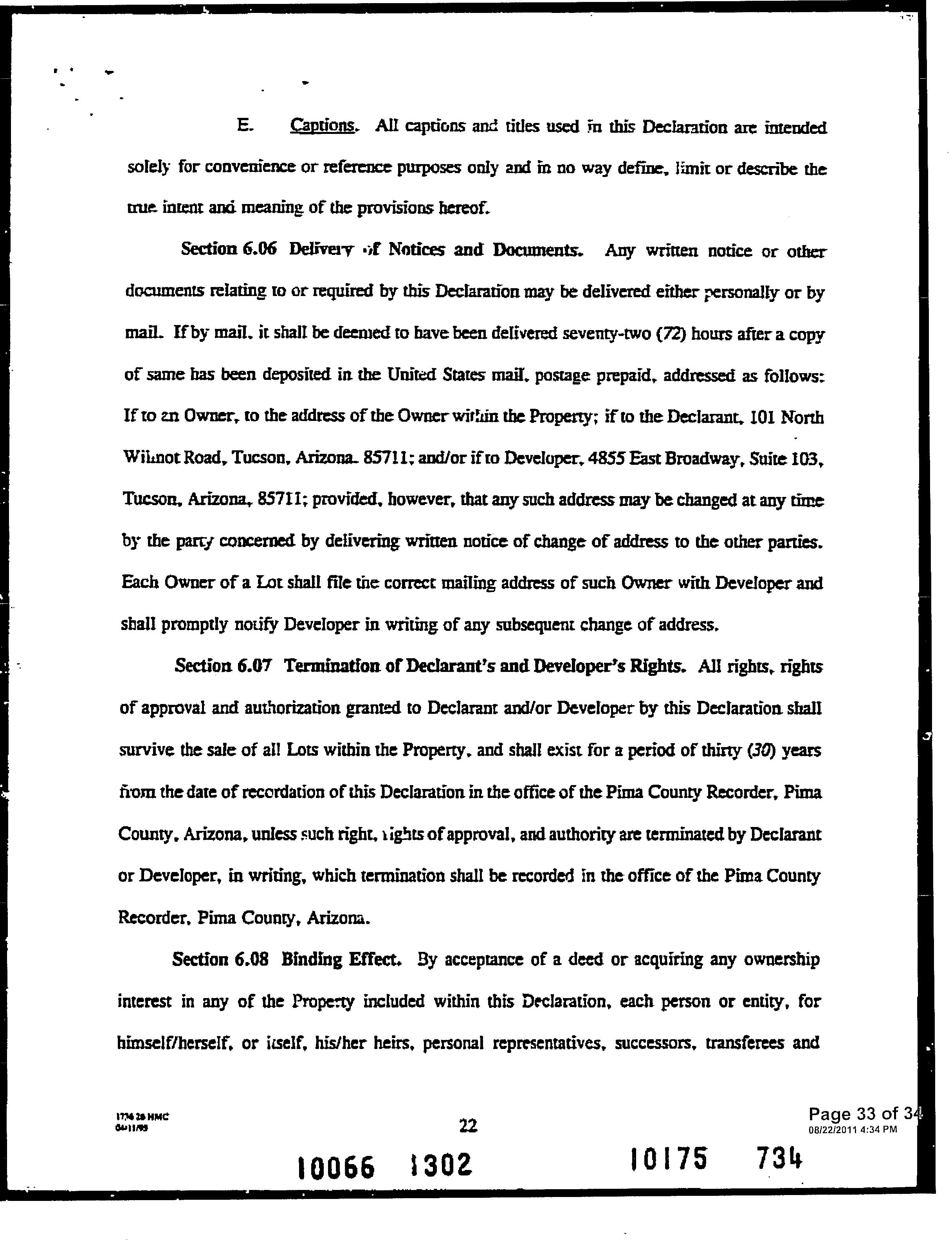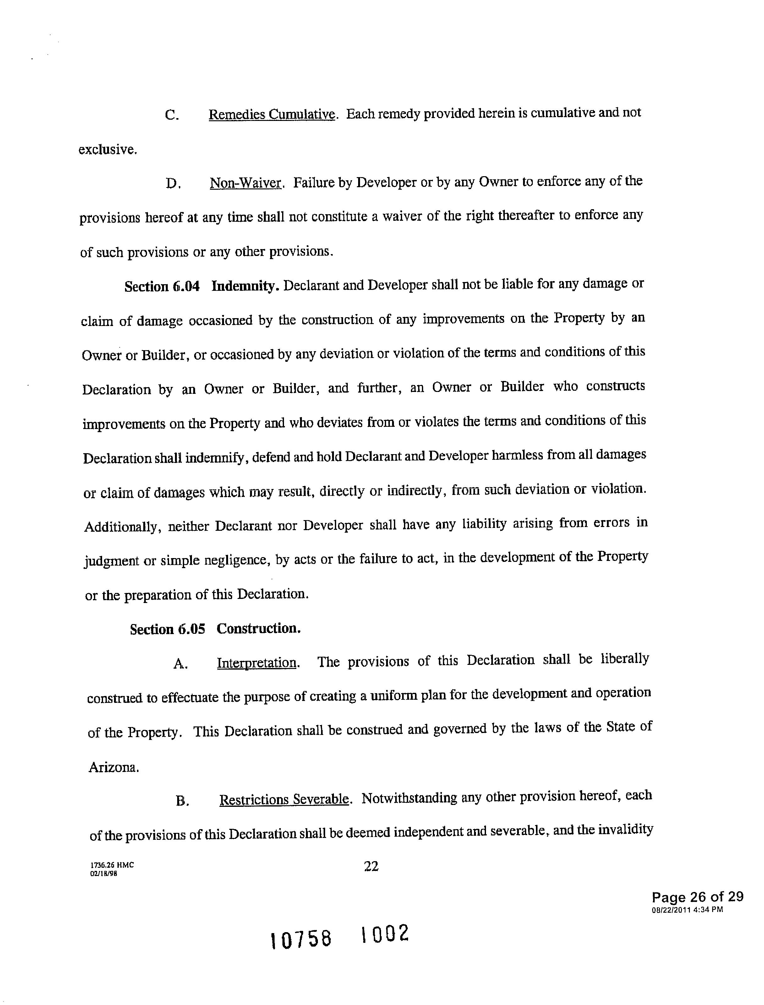 ConditionsCovenants,&Restrictions Thank you for the opportunity to be of service. Restrictions indicating a preference, limitation or discrimination based on race, color, religion, sex, handicap, familial status, or national origin are hereby deleted to the extent such restrictions violate 42 USC 3604(c). This information is furnished without fee and without benefit of a complete title search. No liability is assumed by First American Title or Title Security. If it is desired that liability be assumed, you may apply for a policy of title insurance with First American Title Insurance Company.