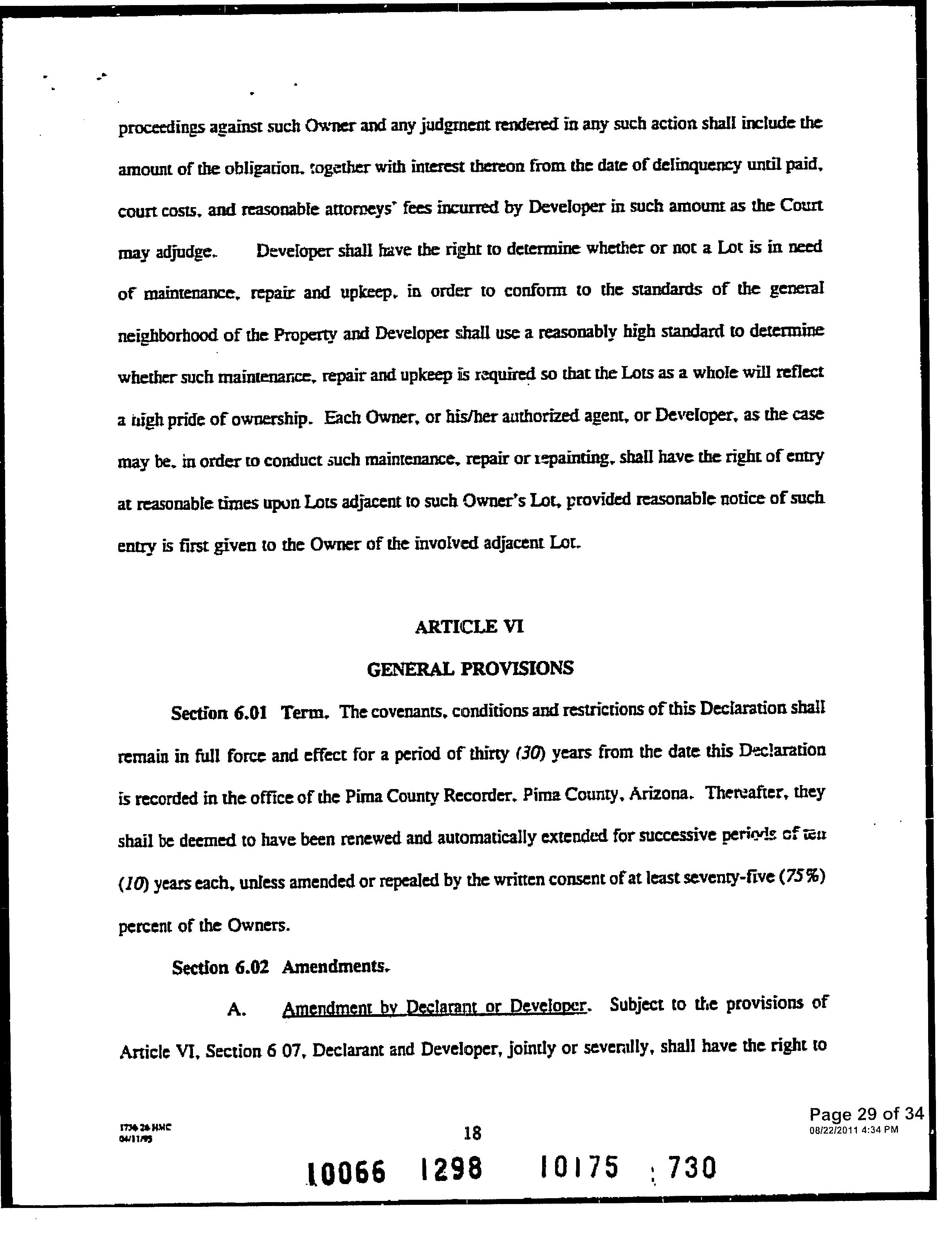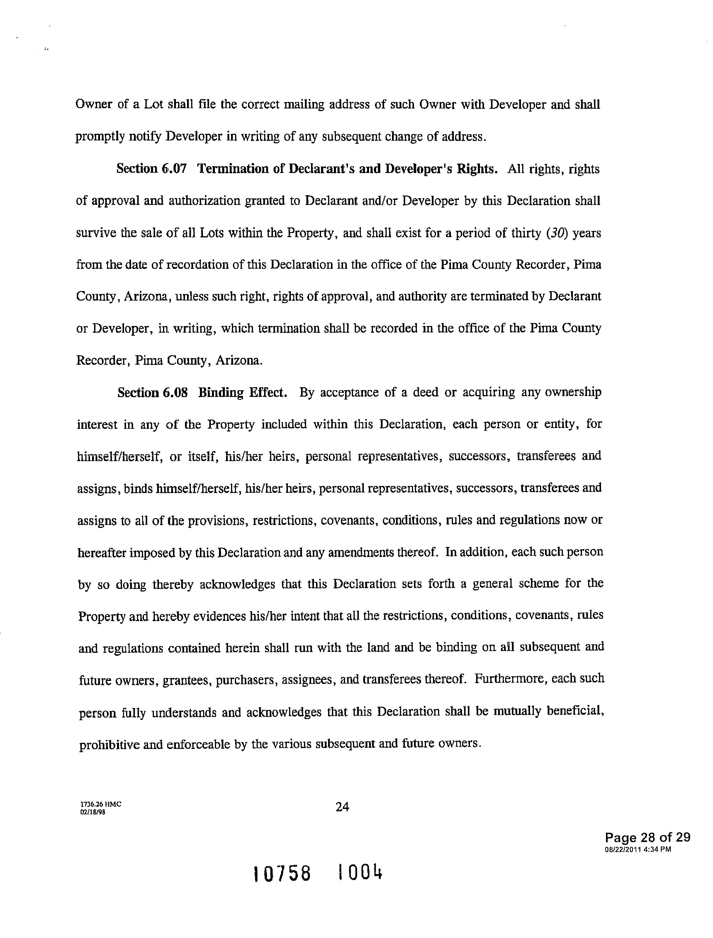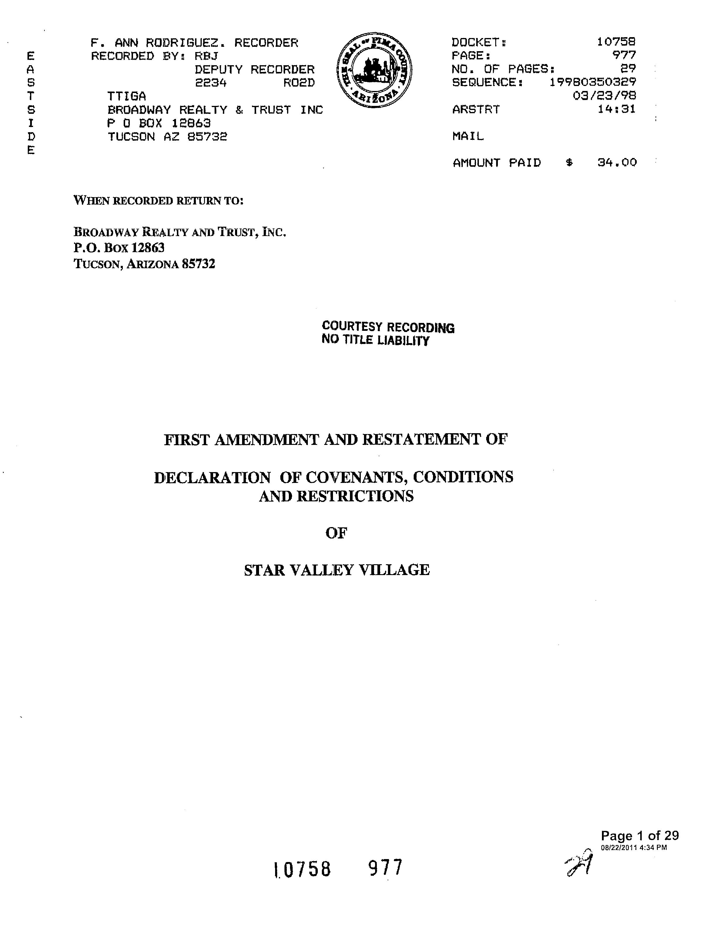 ConditionsCovenants,&Restrictions Thank you for the opportunity to be of service. Restrictions indicating a preference, limitation or discrimination based on race, color, religion, sex, handicap, familial status, or national origin are hereby deleted to the extent such restrictions violate 42 USC 3604(c). This information is furnished without fee and without benefit of a complete title search. No liability is assumed by First American Title or Title Security. If it is desired that liability be assumed, you may apply for a policy of title insurance with First American Title Insurance Company.